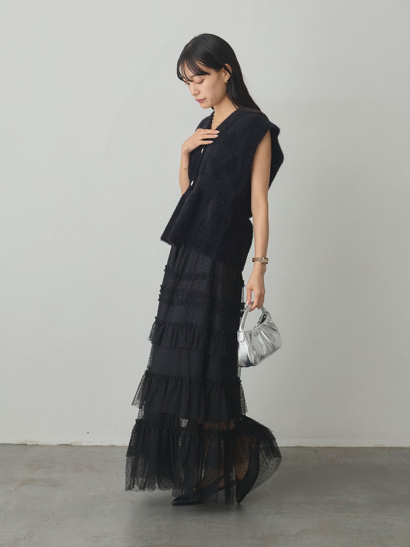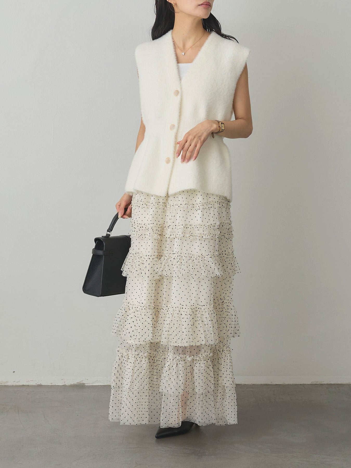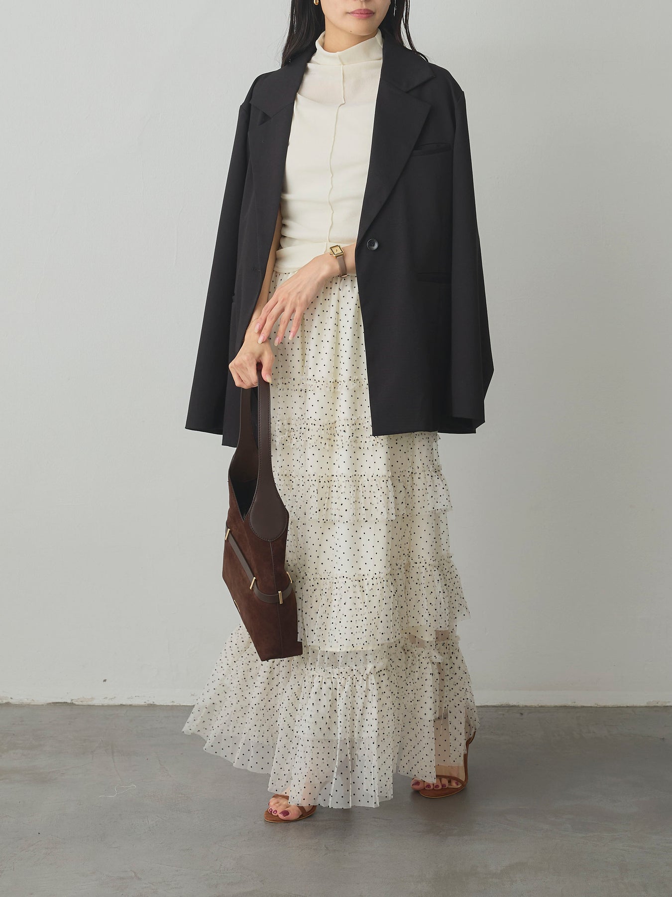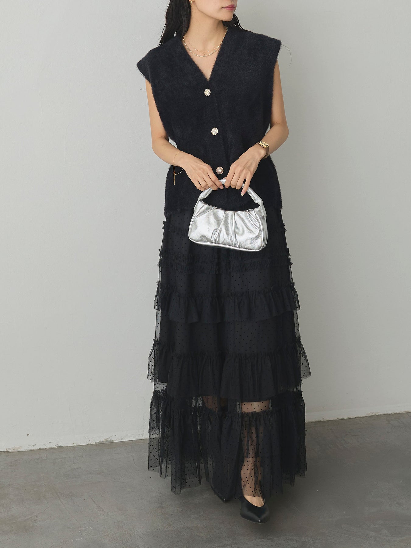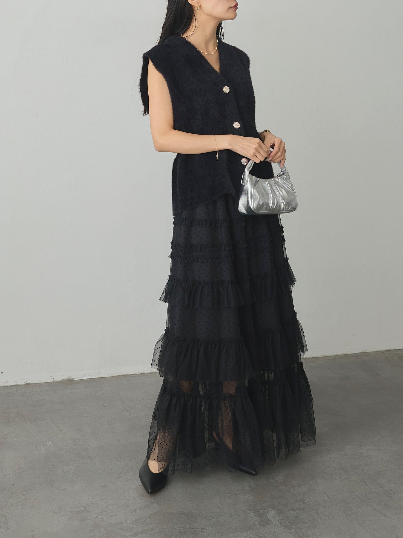 軽やかなチュール素材にドットをあしらい、ティアードデザインで華やかに仕上げたスカート。動くたびに揺れるシルエットが女性らしさを引き立て、シンプルなトップスと合わせるだけでコーディネートが完成します。