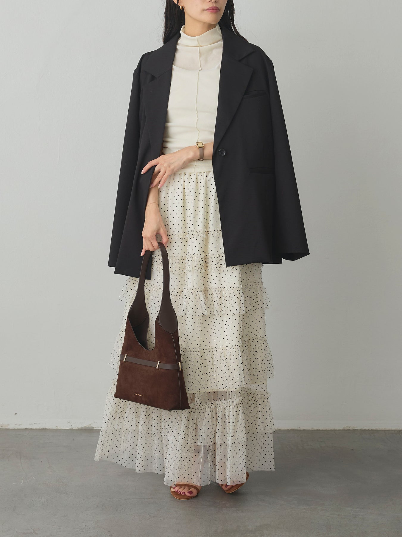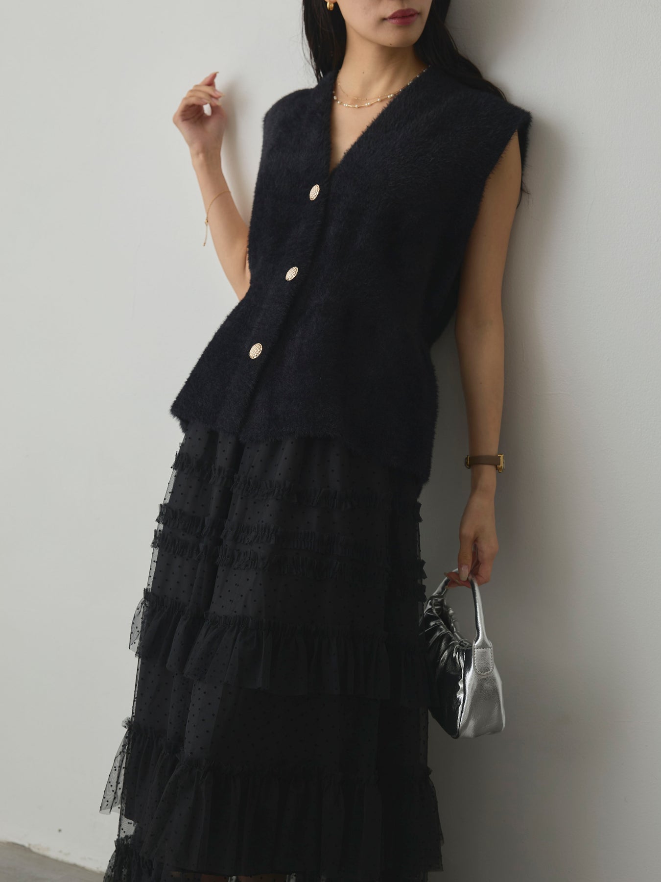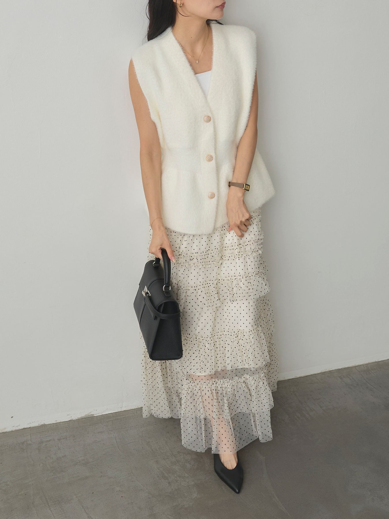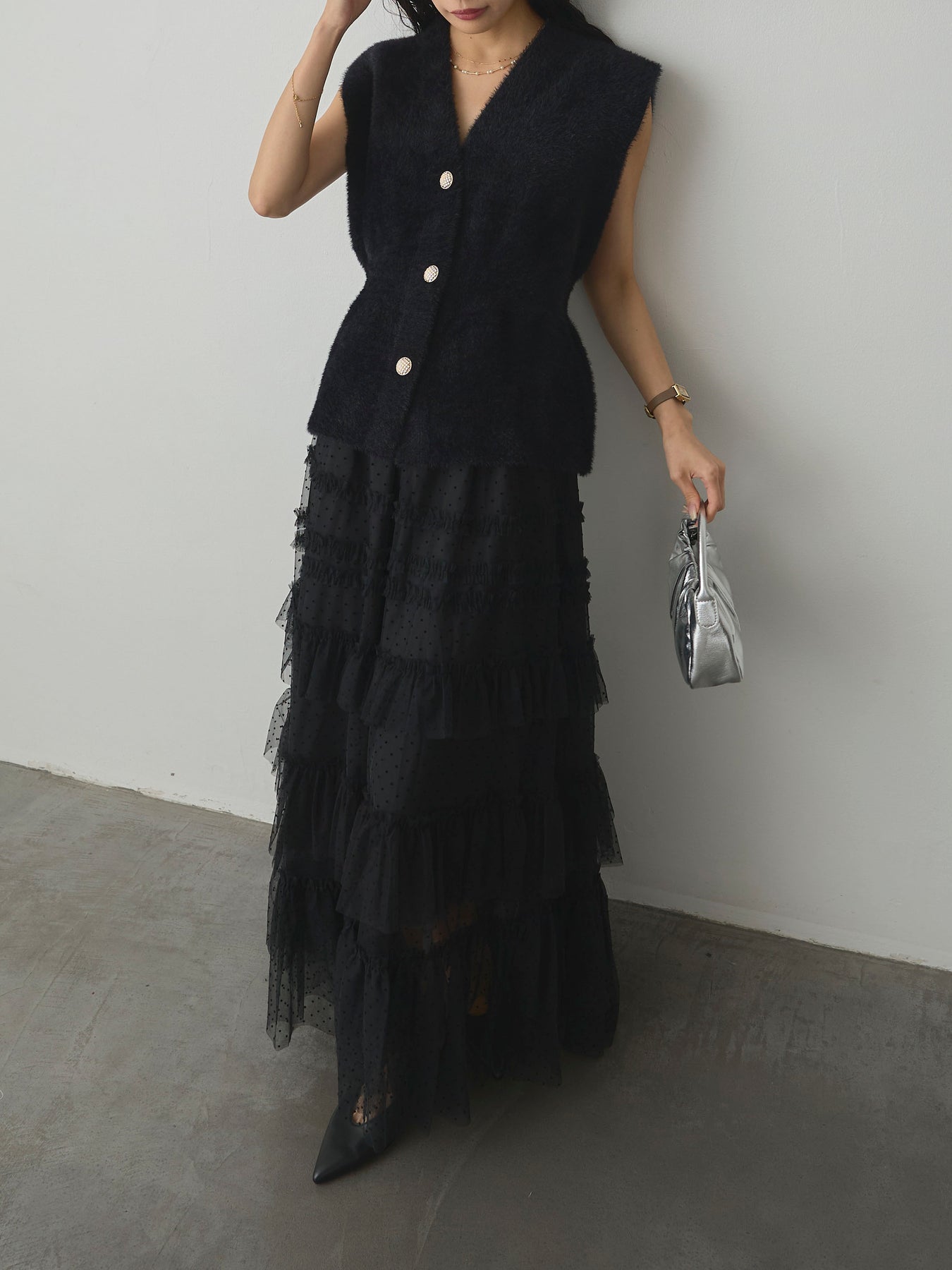 軽やかなチュール素材にドットをあしらい、ティアードデザインで華やかに仕上げたスカート。動くたびに揺れるシルエットが女性らしさを引き立て、シンプルなトップスと合わせるだけでコーディネートが完成します。