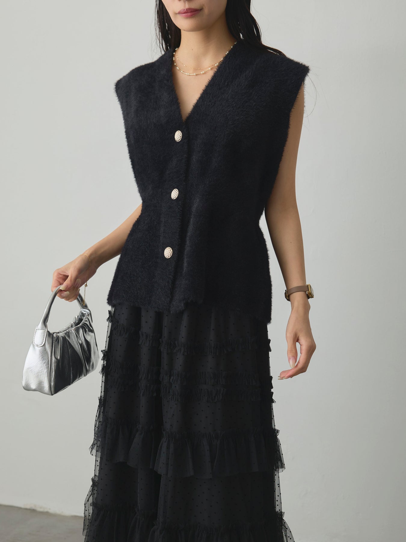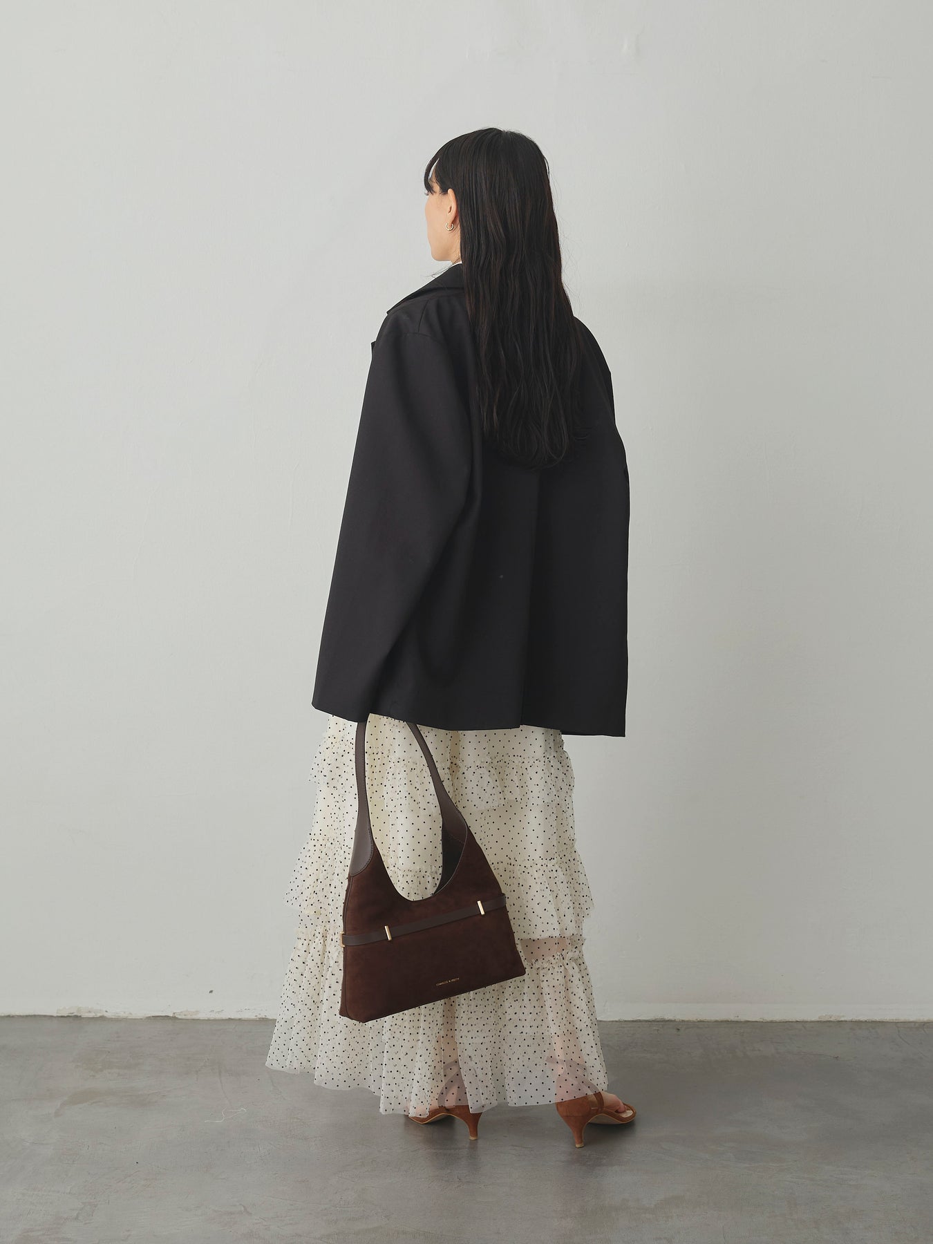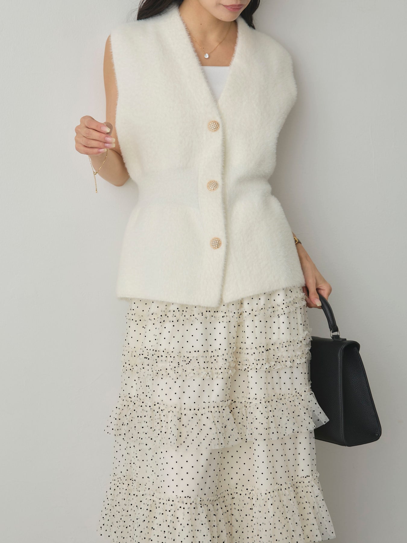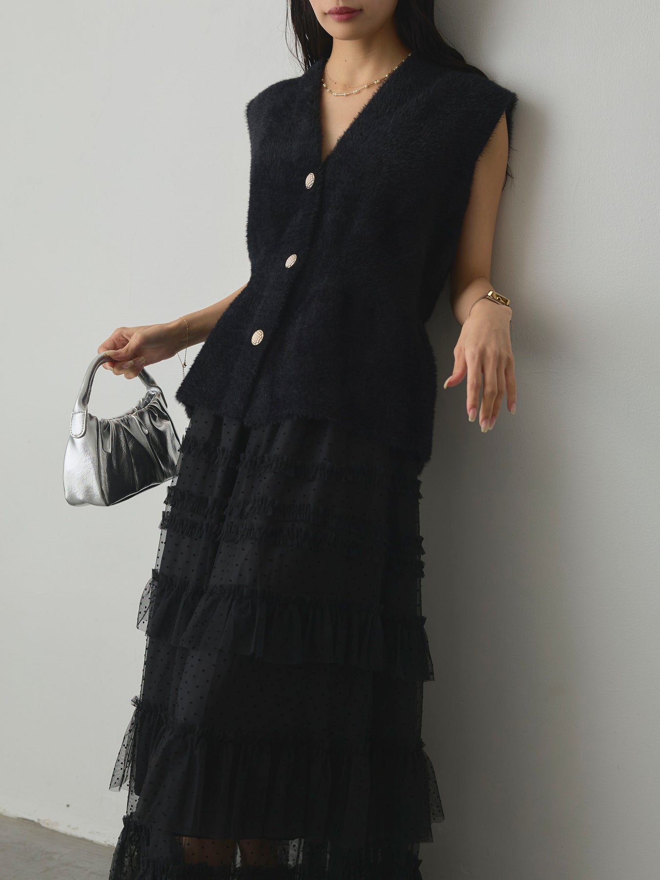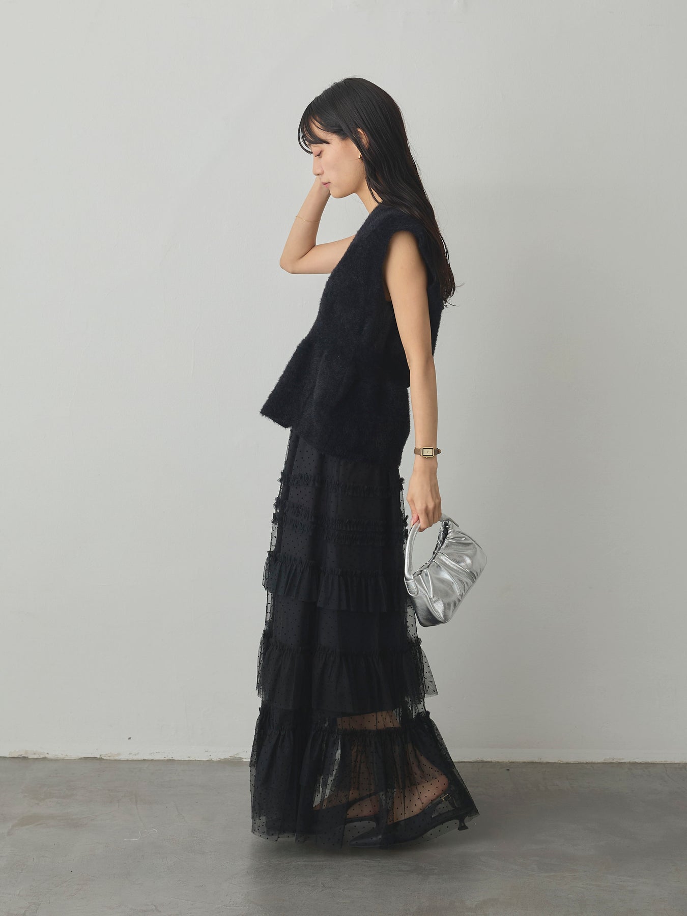 軽やかなチュール素材にドットをあしらい、ティアードデザインで華やかに仕上げたスカート。動くたびに揺れるシルエットが女性らしさを引き立て、シンプルなトップスと合わせるだけでコーディネートが完成します。