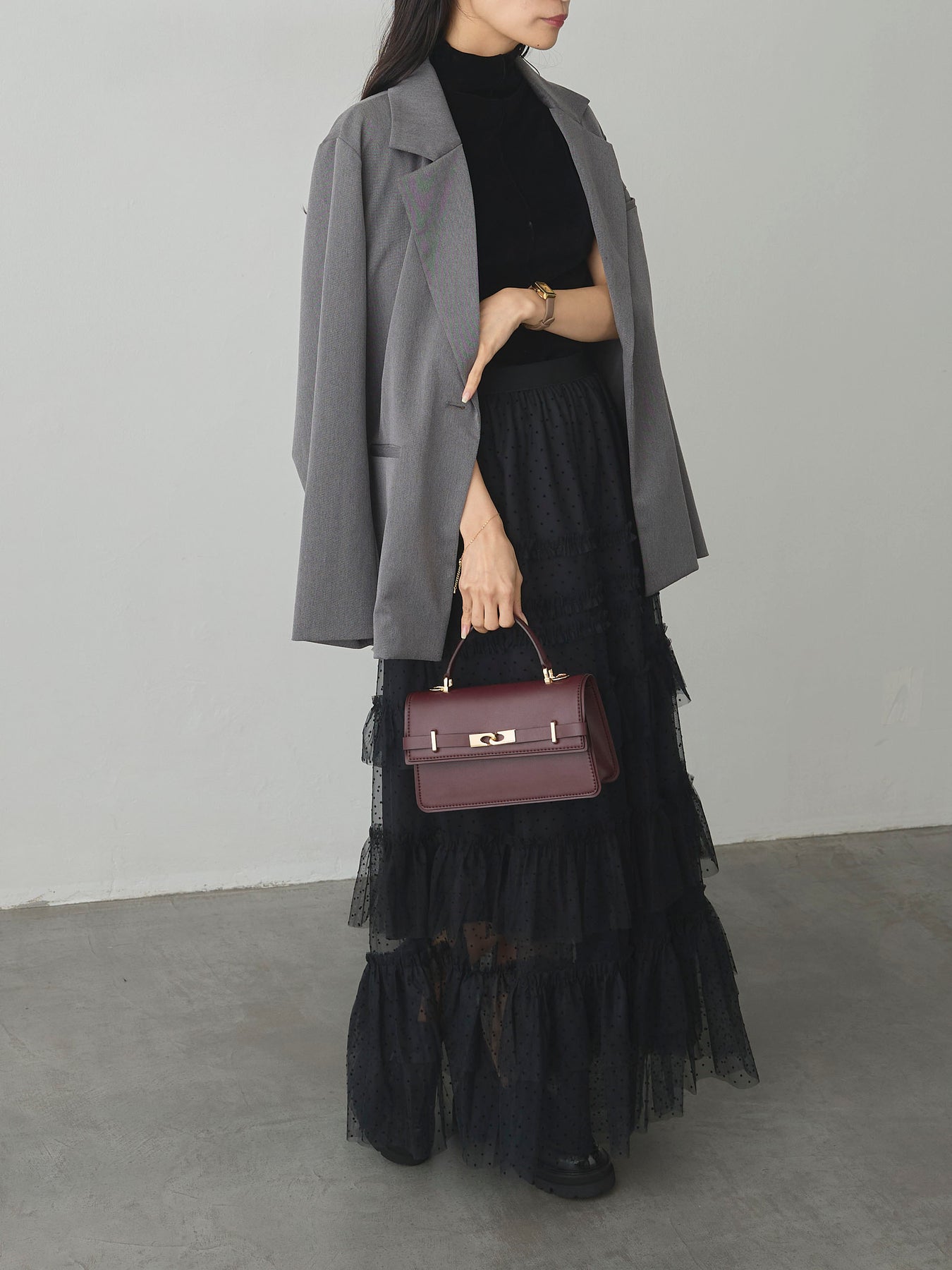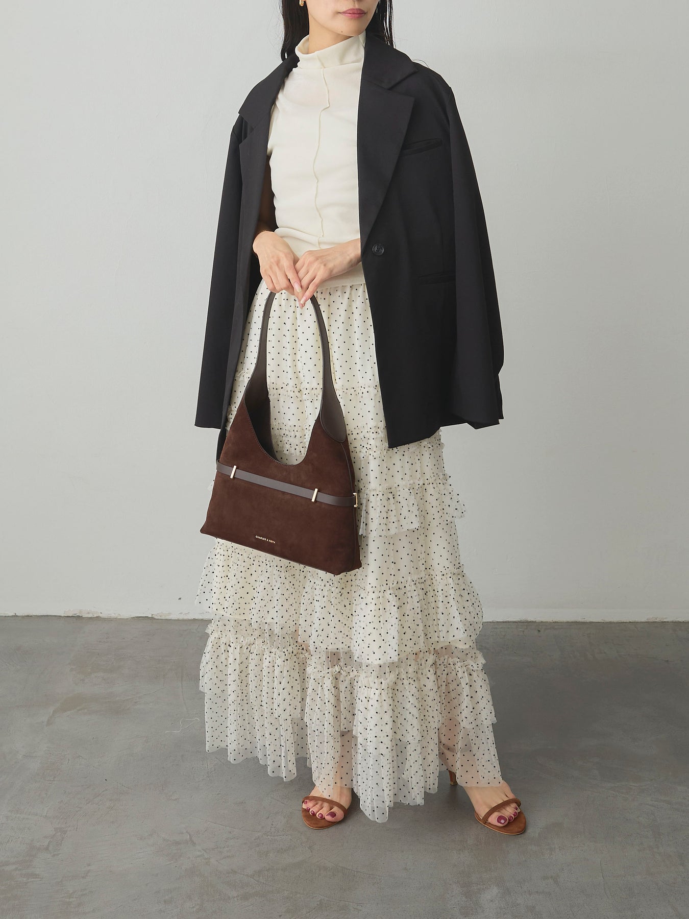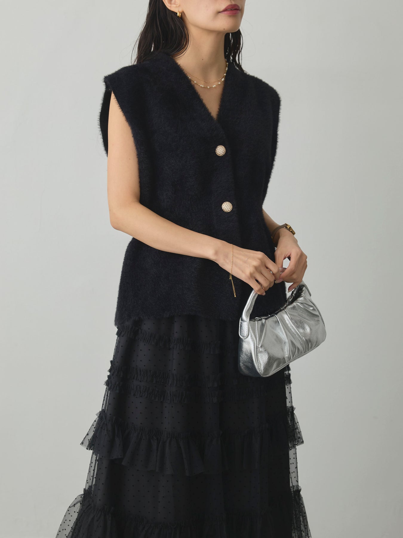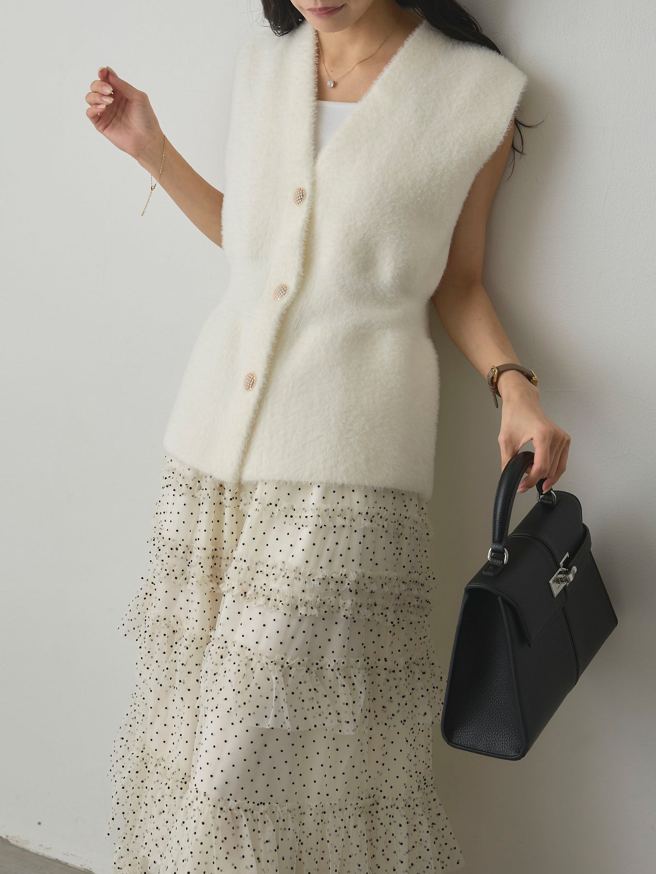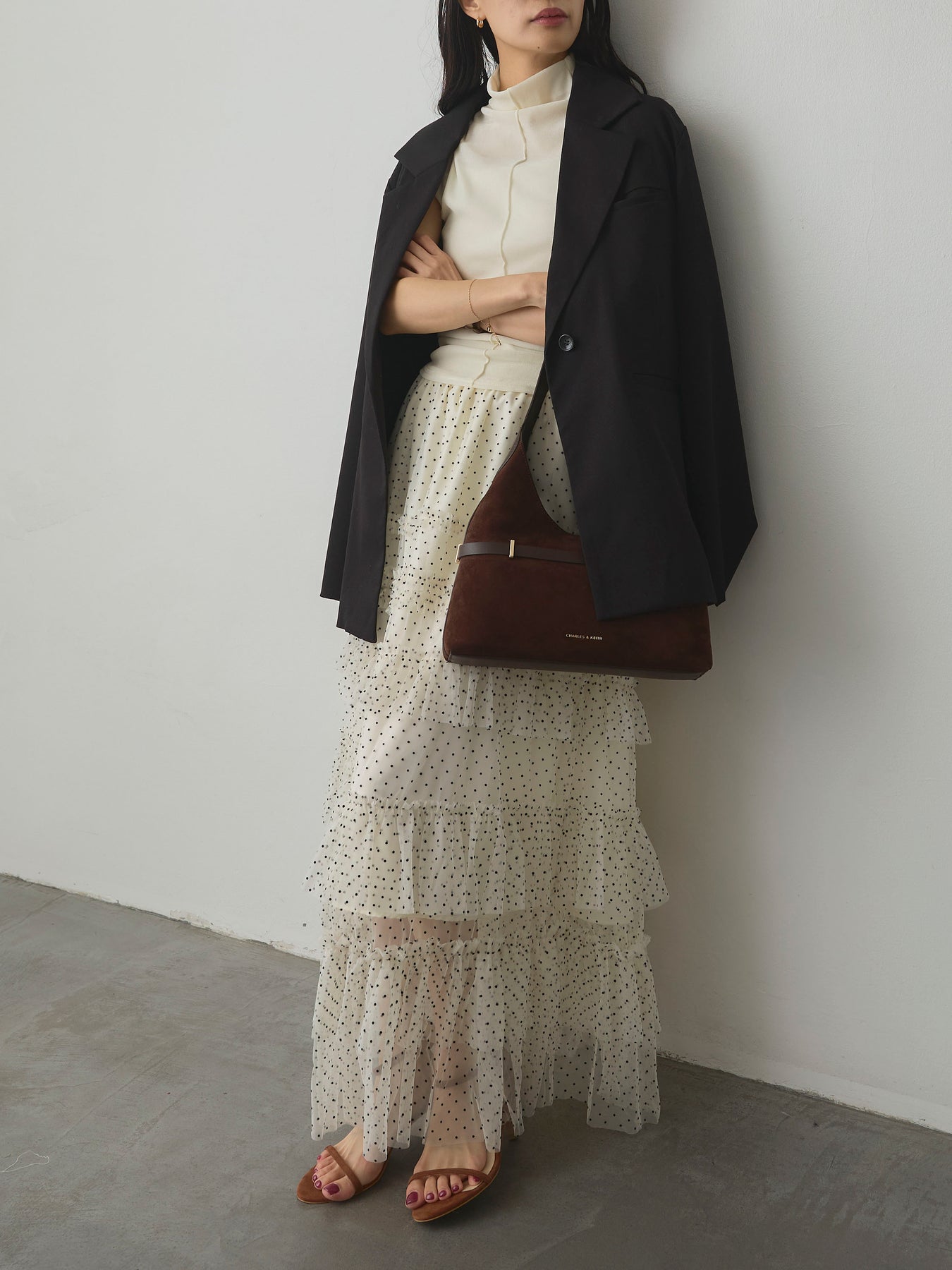 軽やかなチュール素材にドットをあしらい、ティアードデザインで華やかに仕上げたスカート。動くたびに揺れるシルエットが女性らしさを引き立て、シンプルなトップスと合わせるだけでコーディネートが完成します。