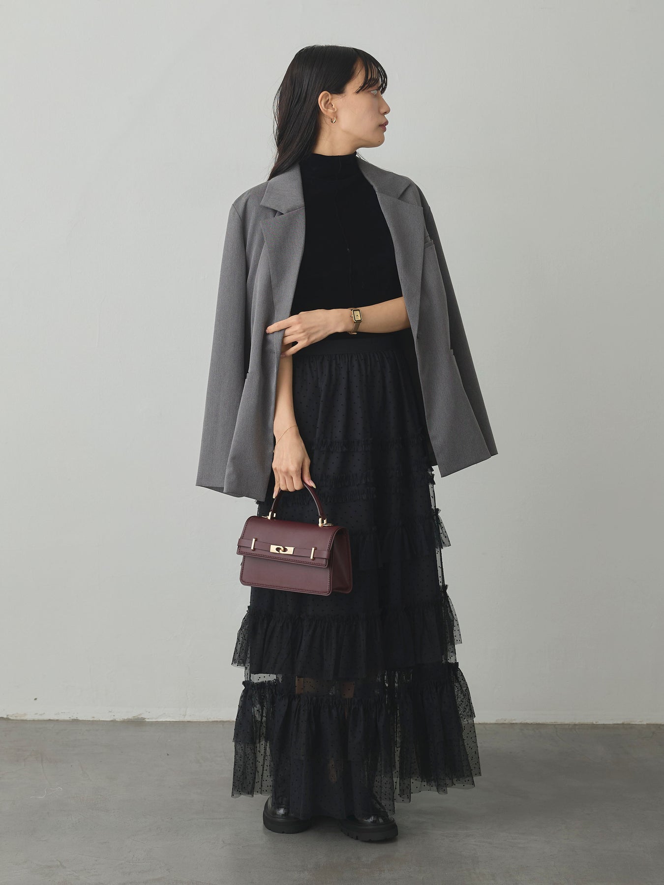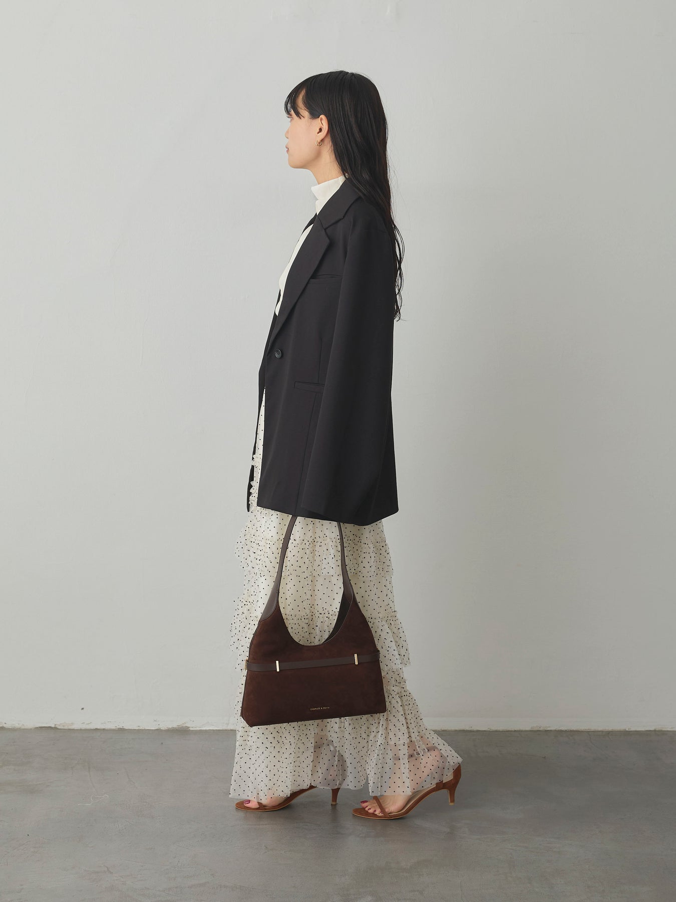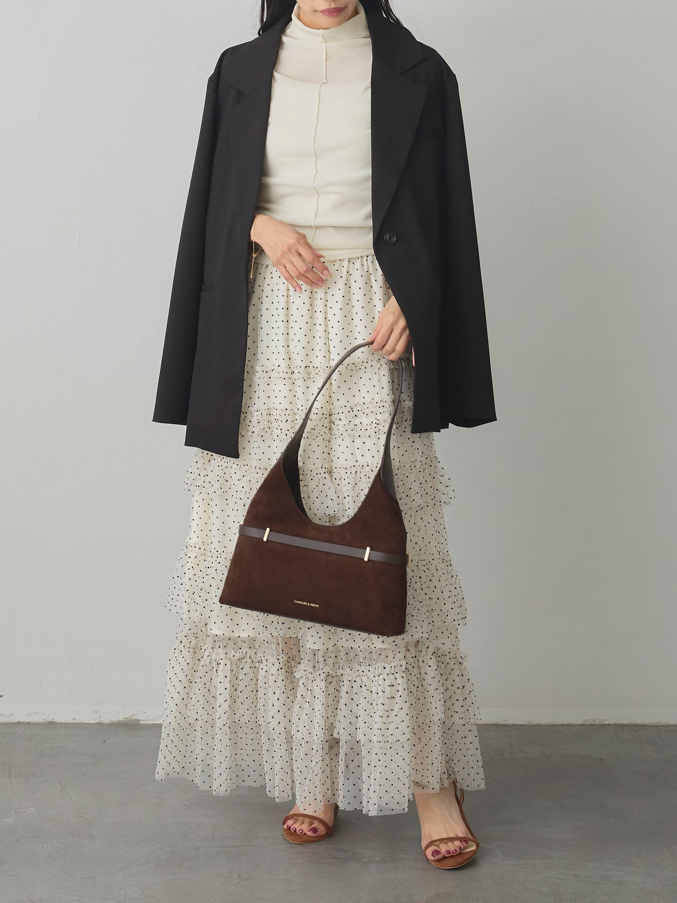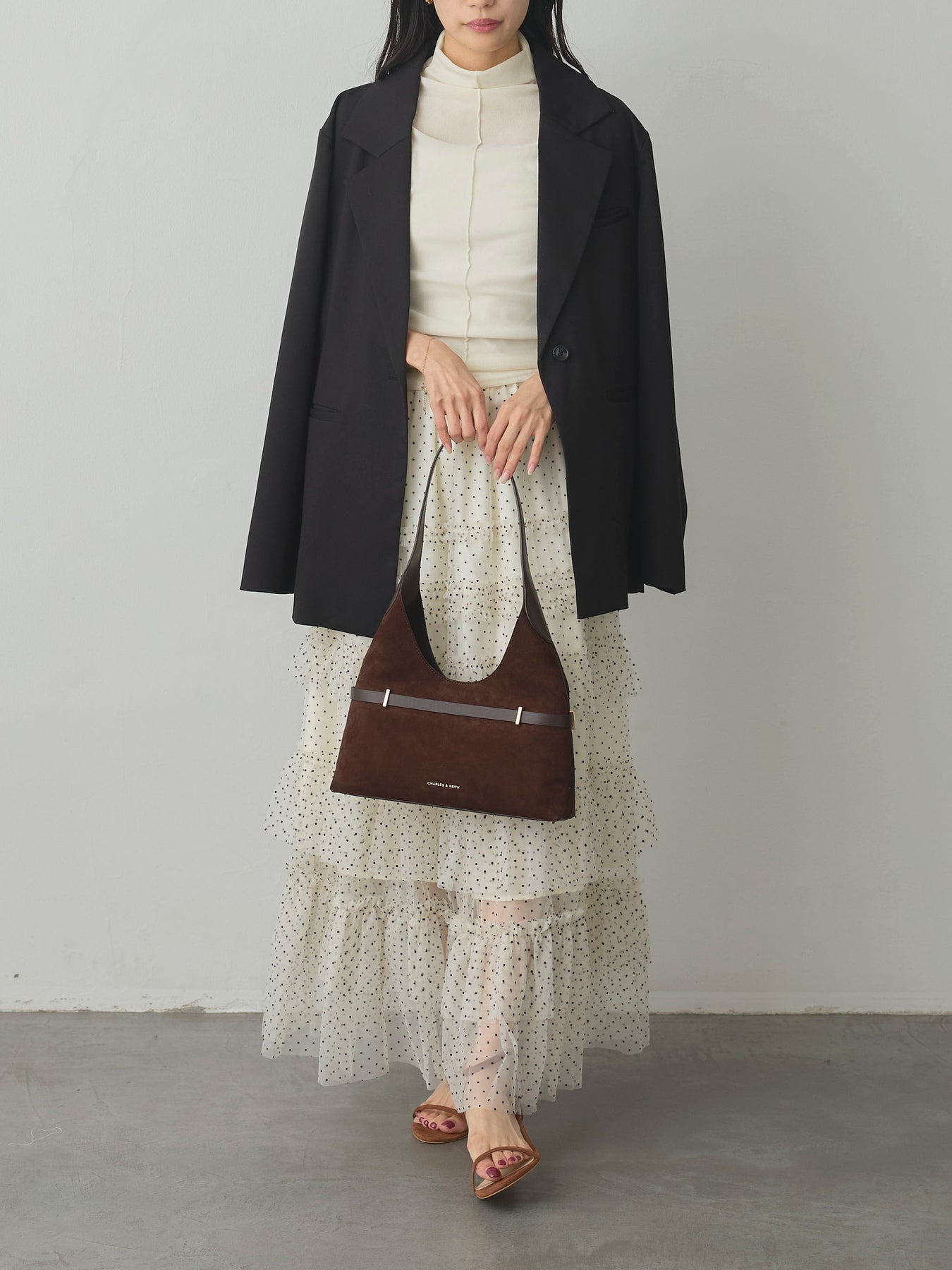 軽やかなチュール素材にドットをあしらい、ティアードデザインで華やかに仕上げたスカート。動くたびに揺れるシルエットが女性らしさを引き立て、シンプルなトップスと合わせるだけでコーディネートが完成します。