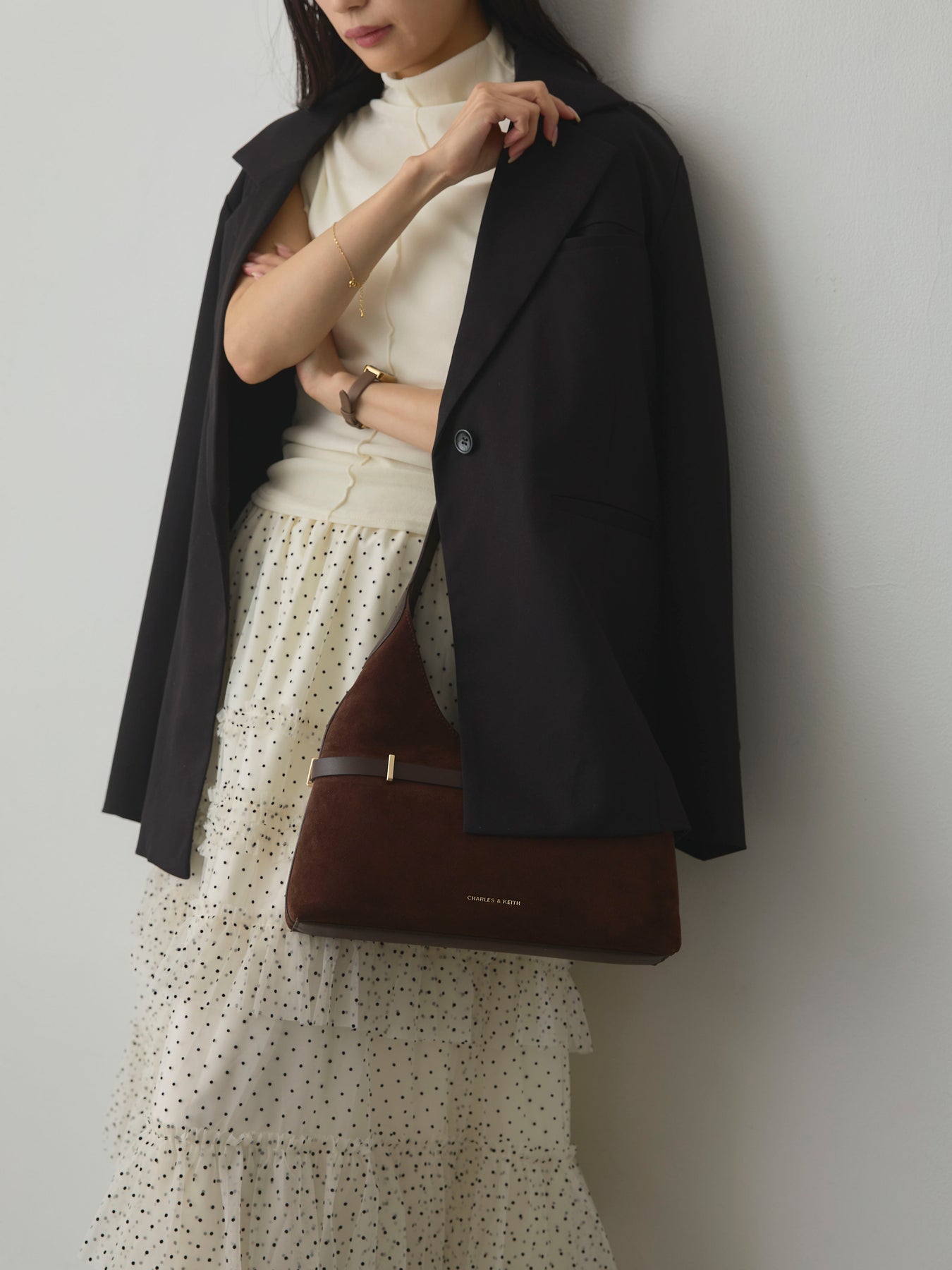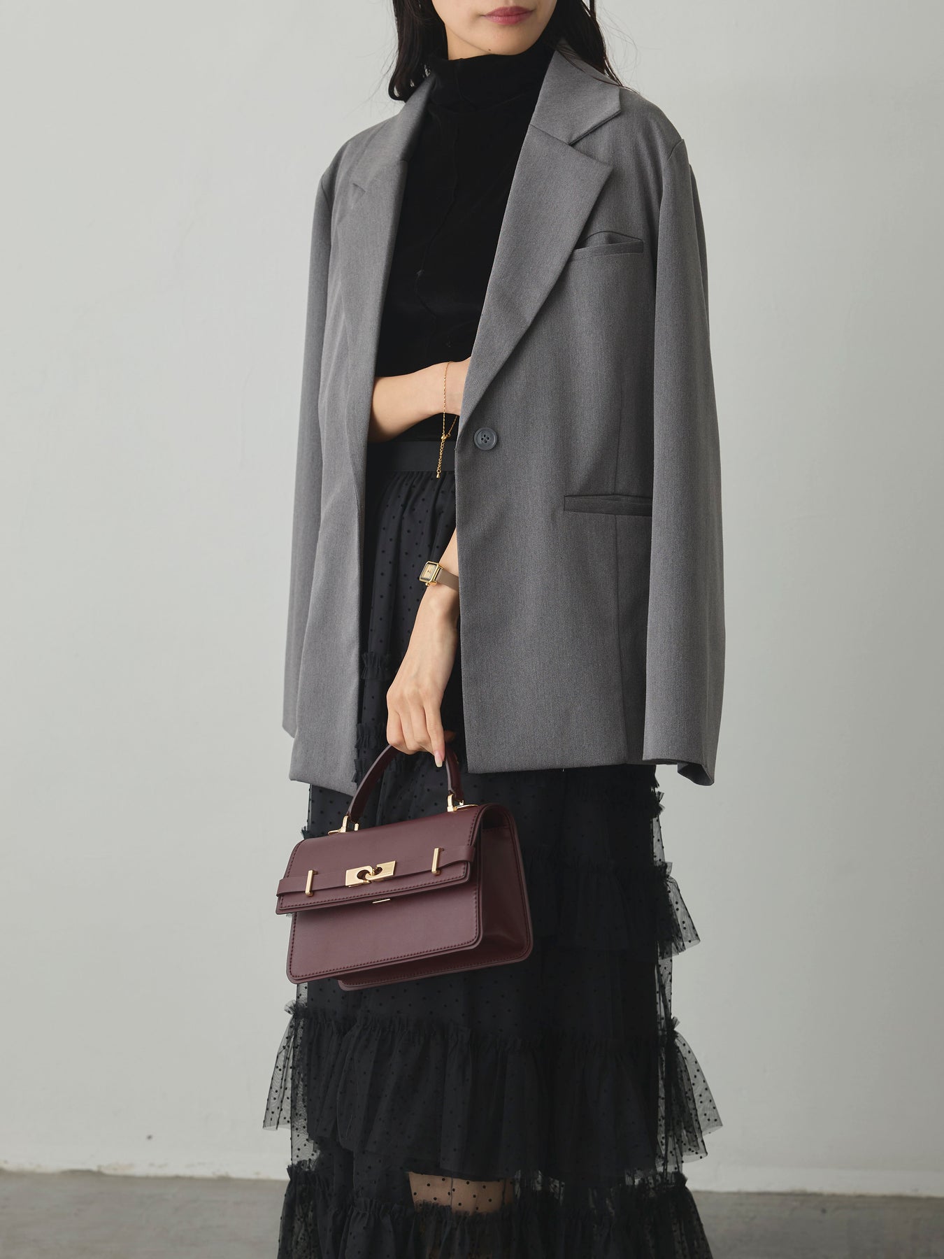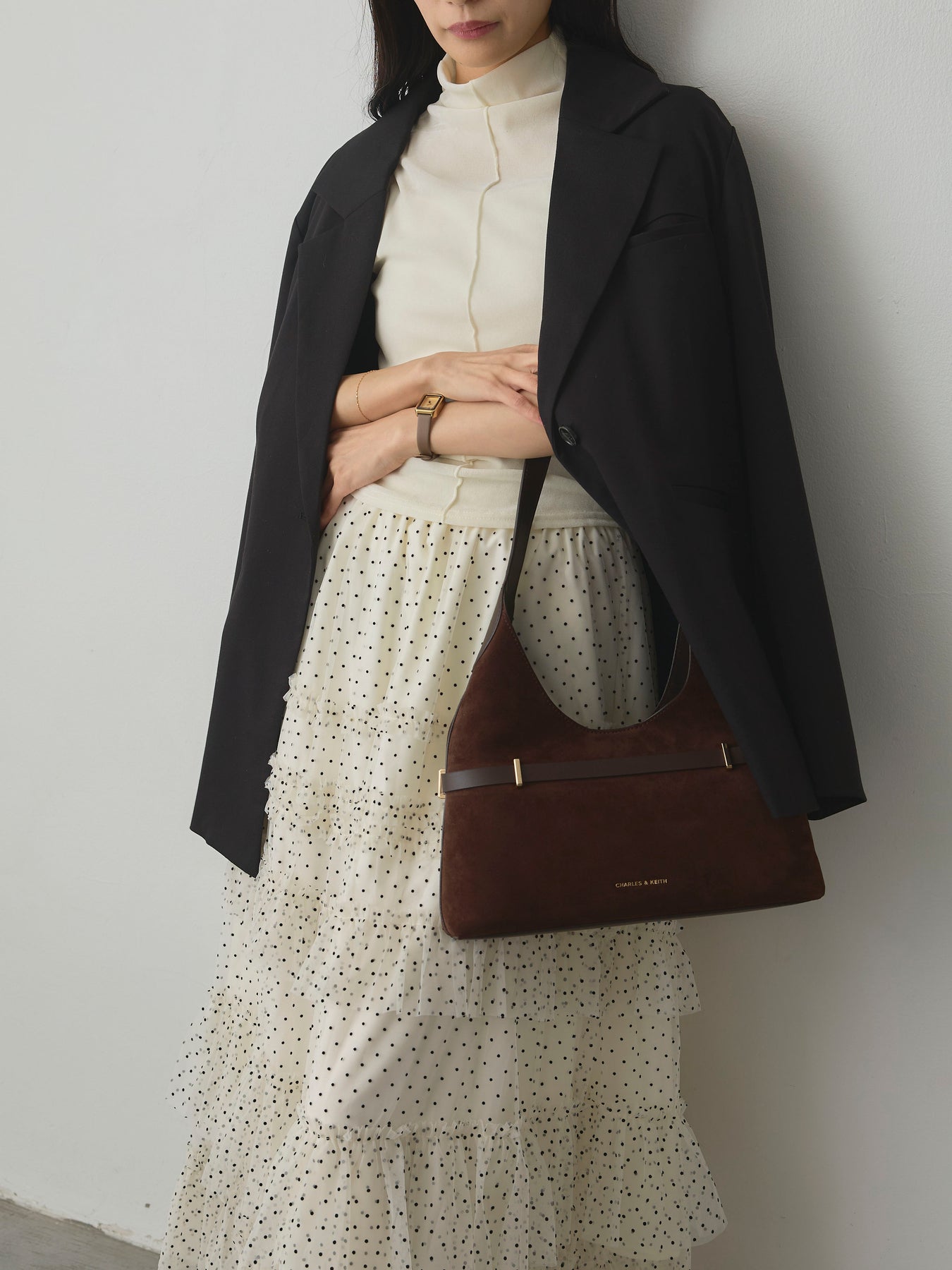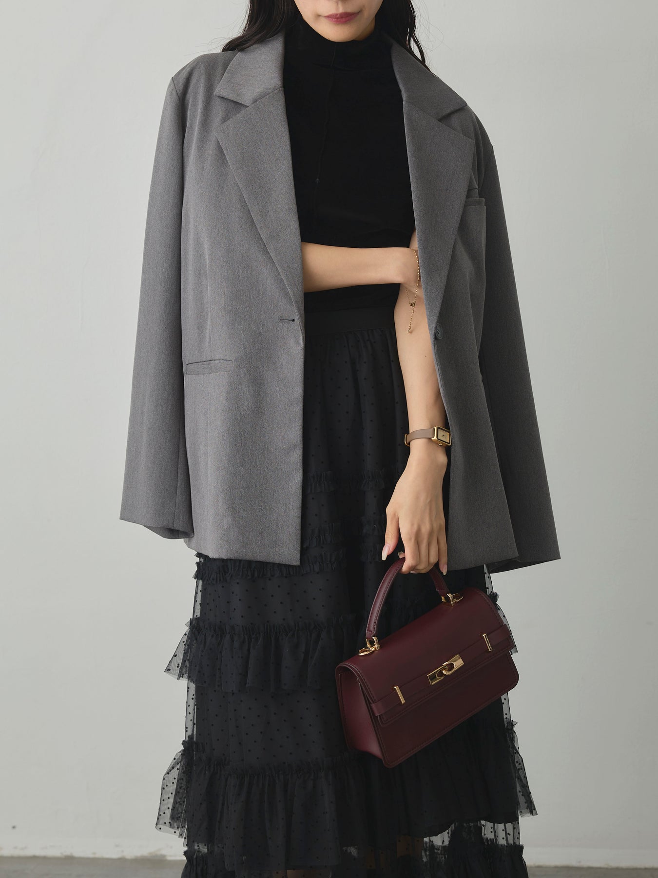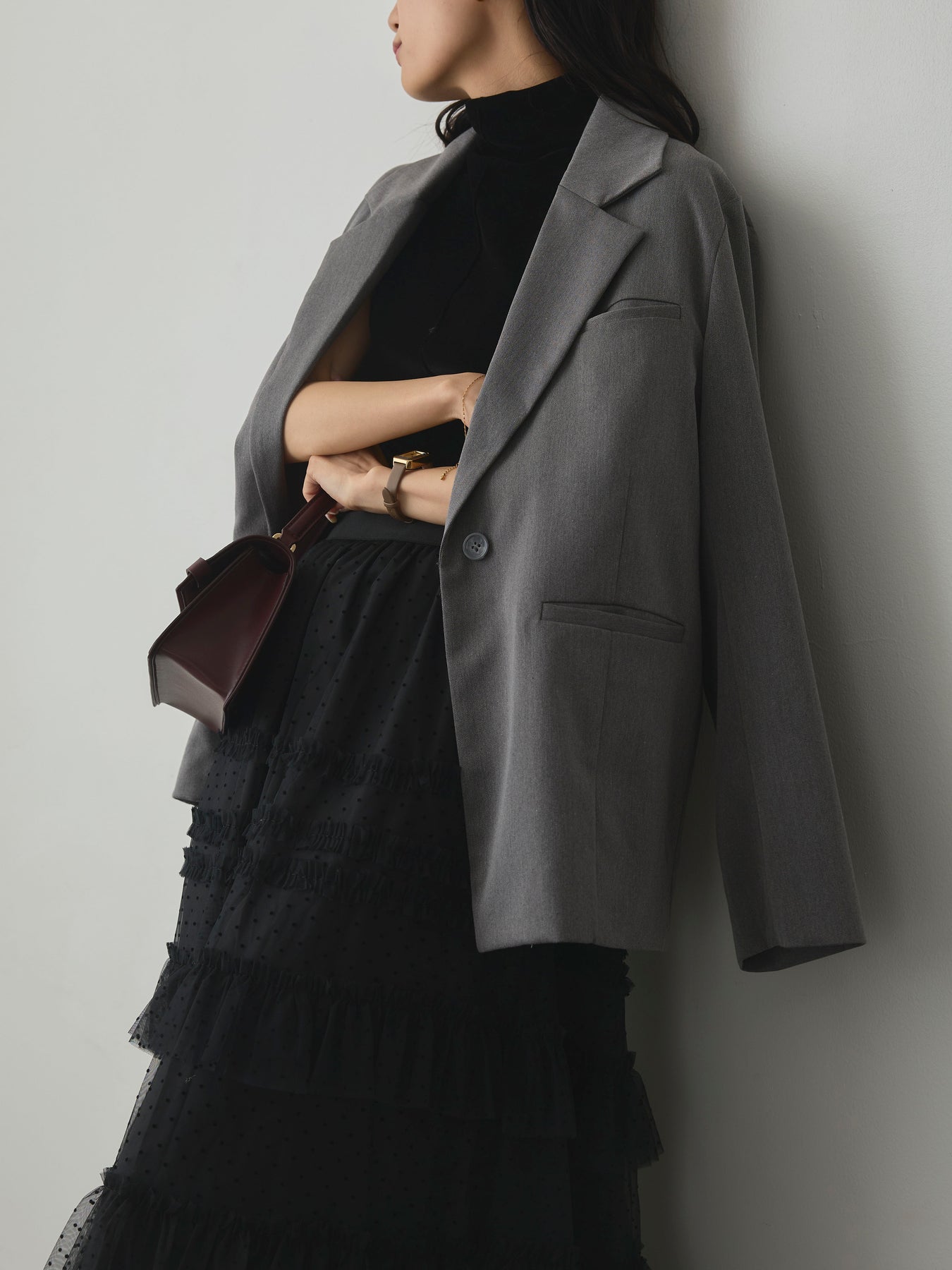 軽やかなチュール素材にドットをあしらい、ティアードデザインで華やかに仕上げたスカート。動くたびに揺れるシルエットが女性らしさを引き立て、シンプルなトップスと合わせるだけでコーディネートが完成します。