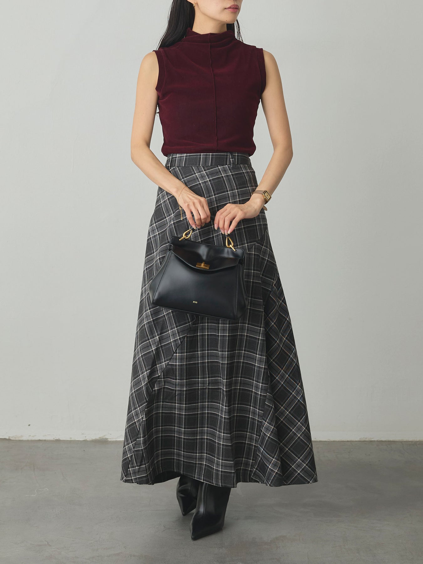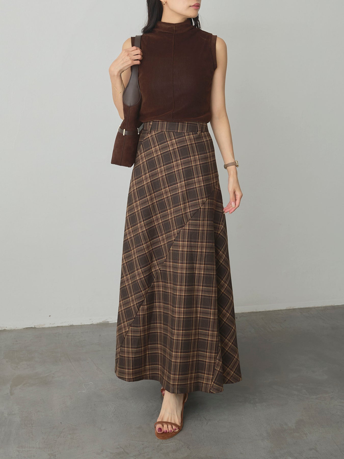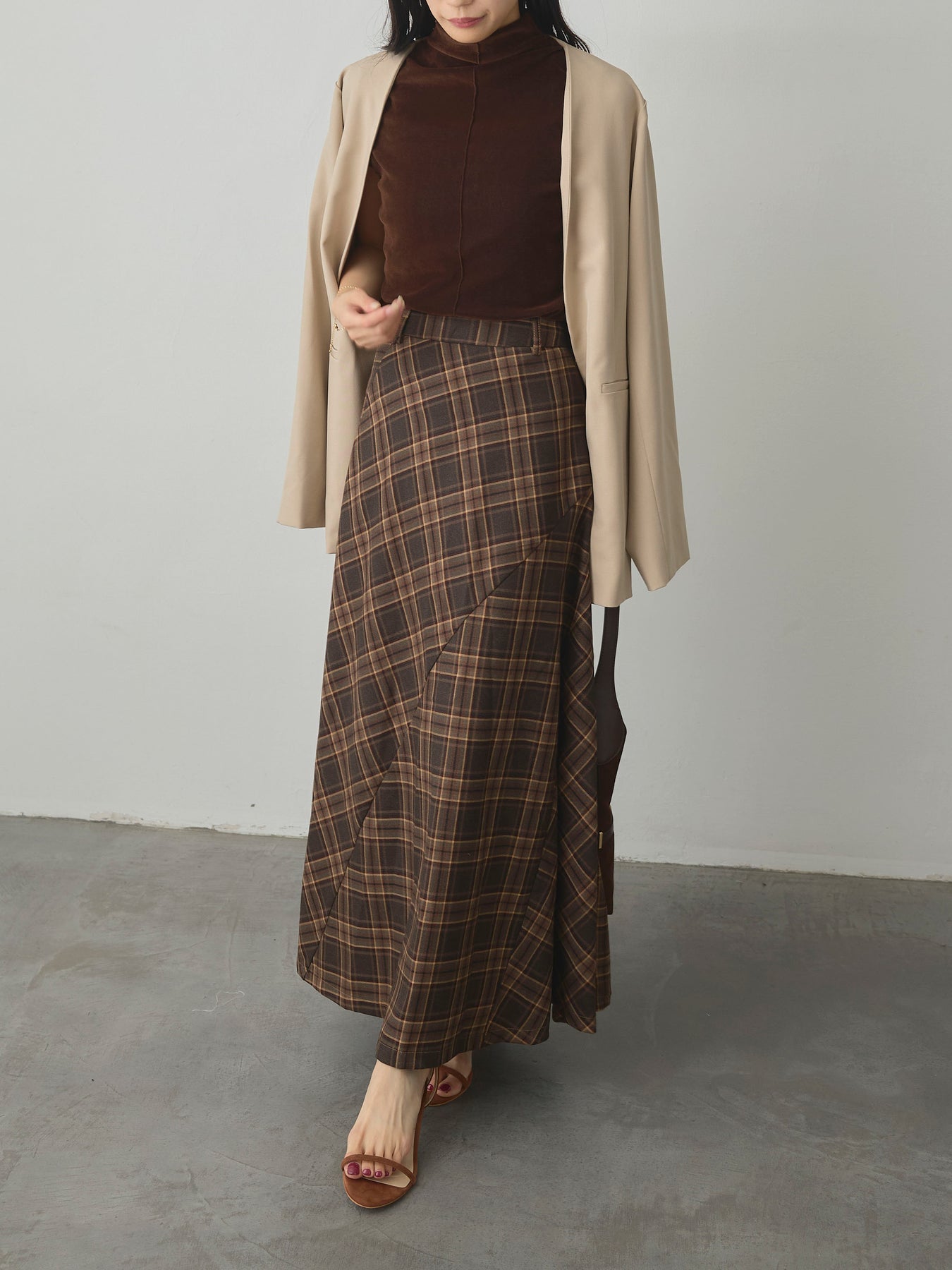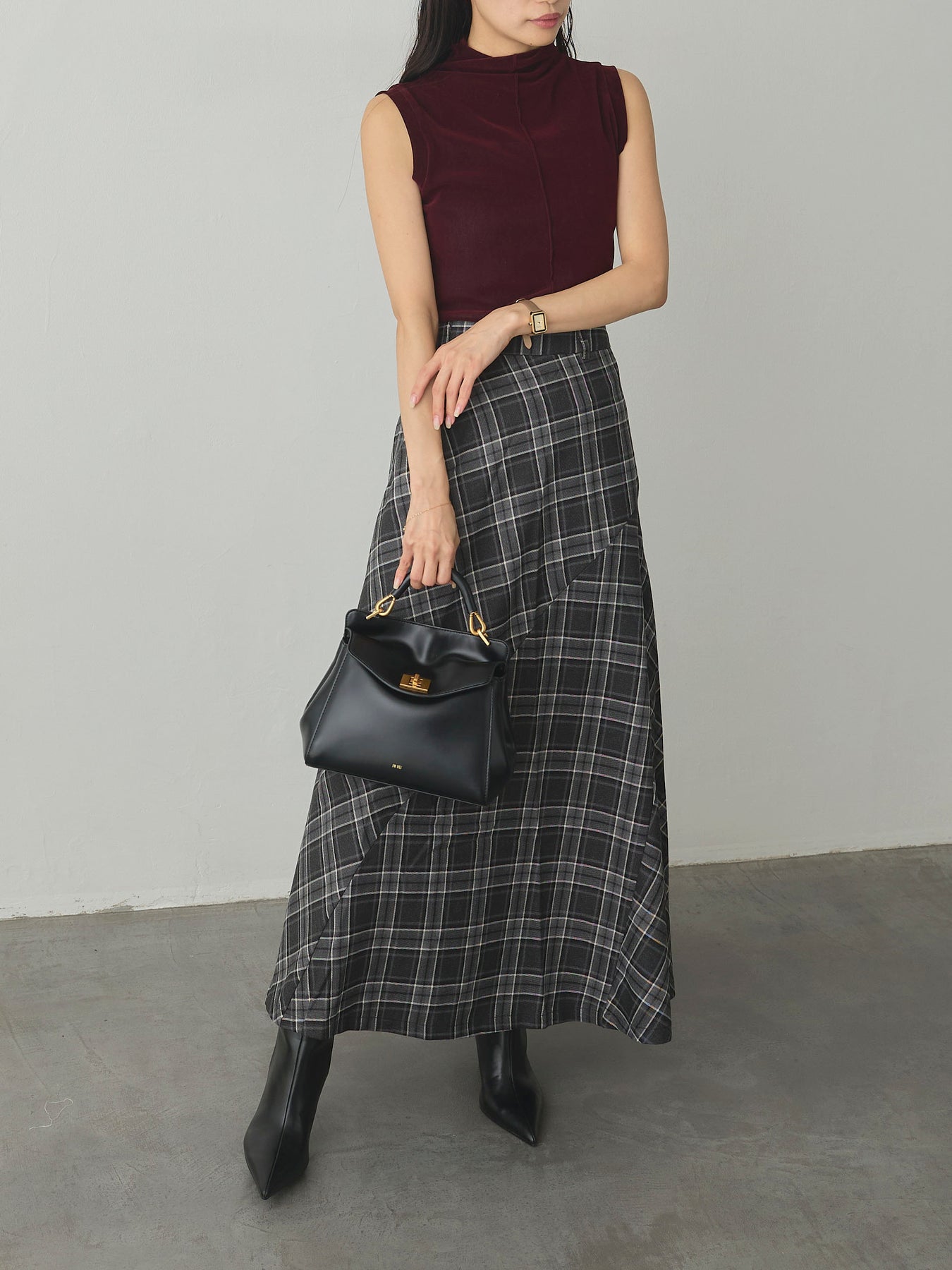 【モデル着用サイズ:BROWN/S、BLACK/S】 クラシカルなチェック柄を取り入れたパネルデザインのスカート。程よく広がるシルエットが上品な印象を演出し、シンプルなトップスと合わせるだけでスタイリングが決まります。