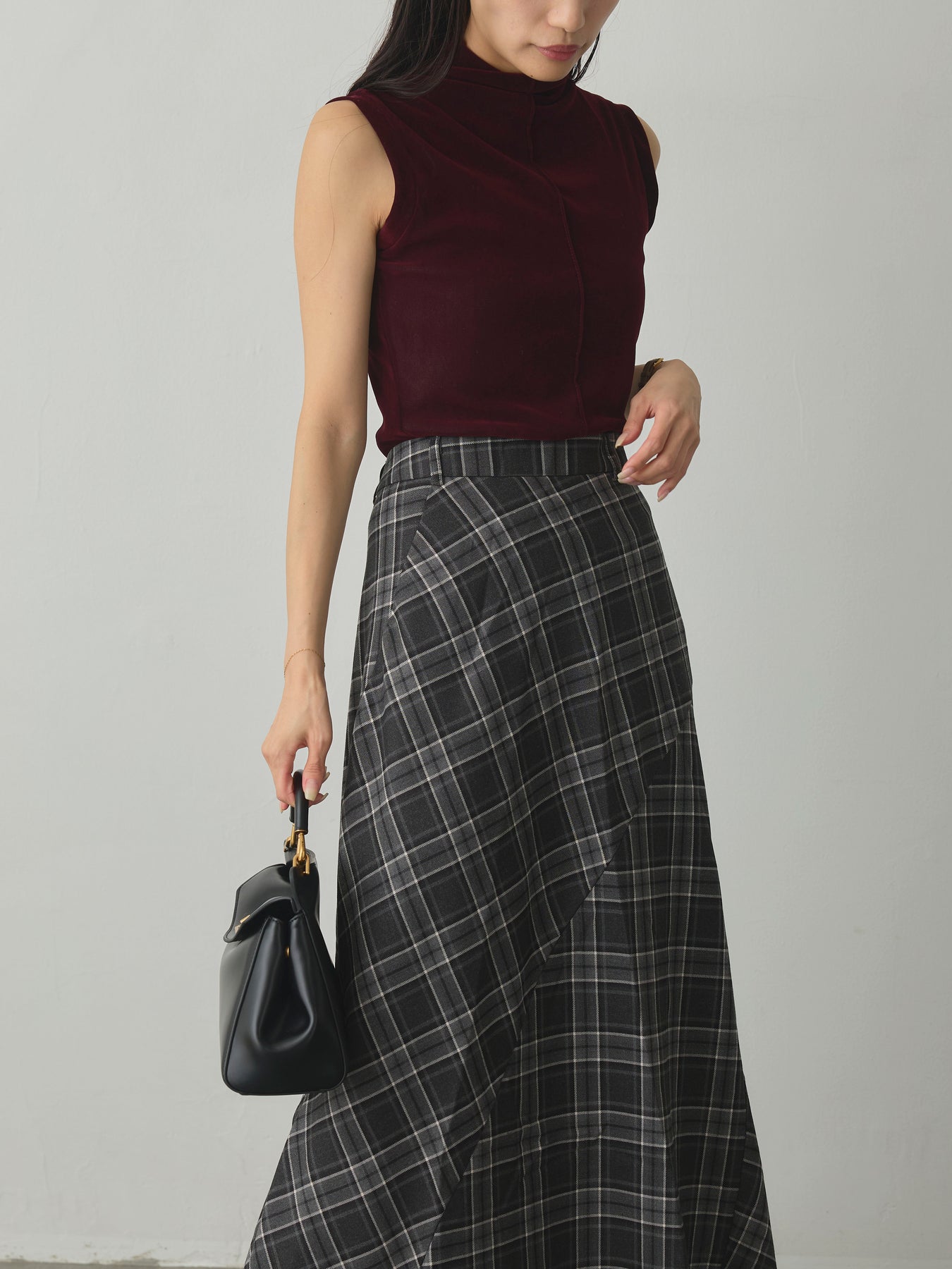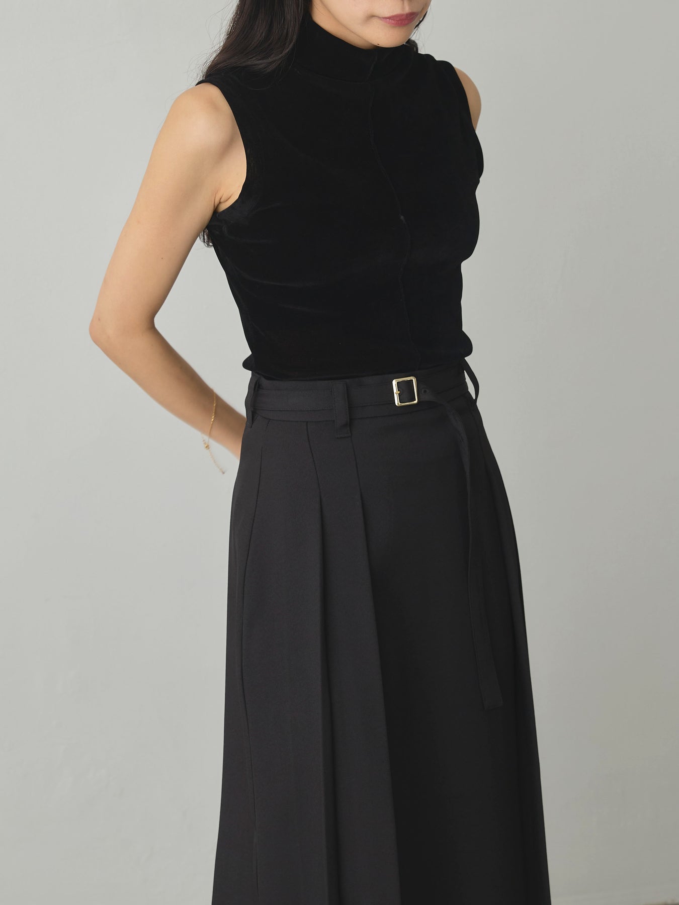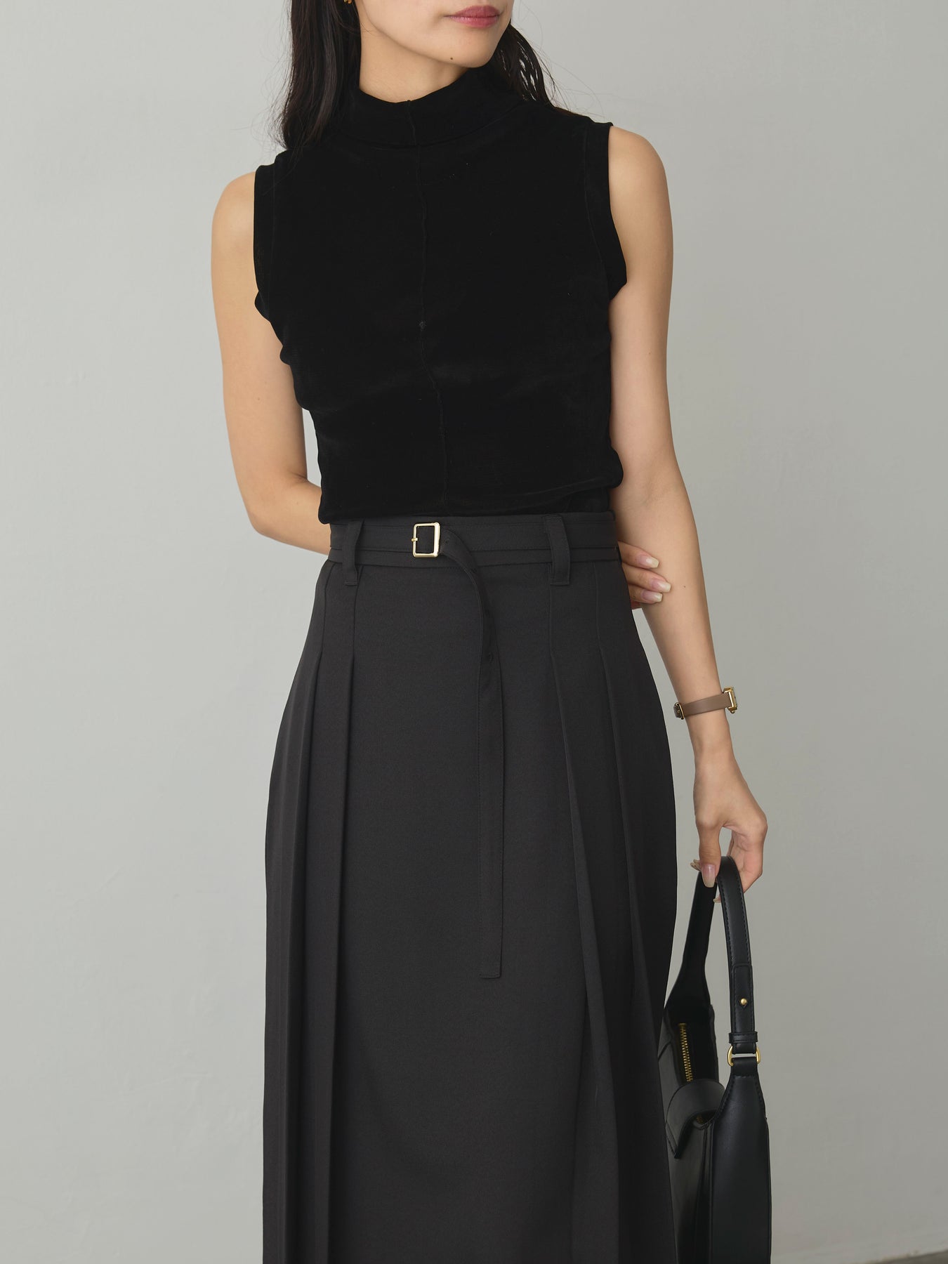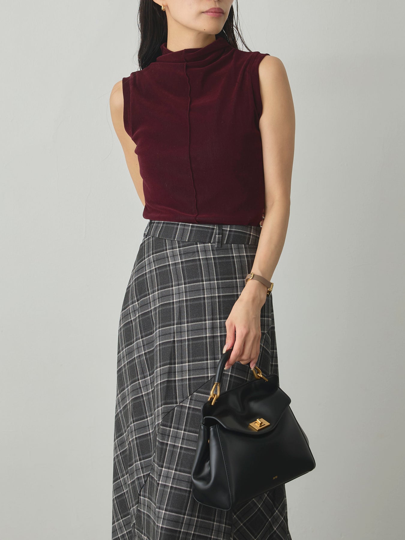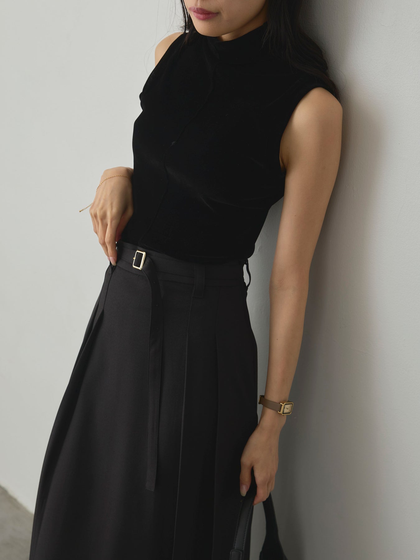 メッシュの抜け感とベロアの質感を組み合わせたノースリーブトップス。シンプルながらも表情のある素材感で、ボトムを選ばず着こなせる一枚です。