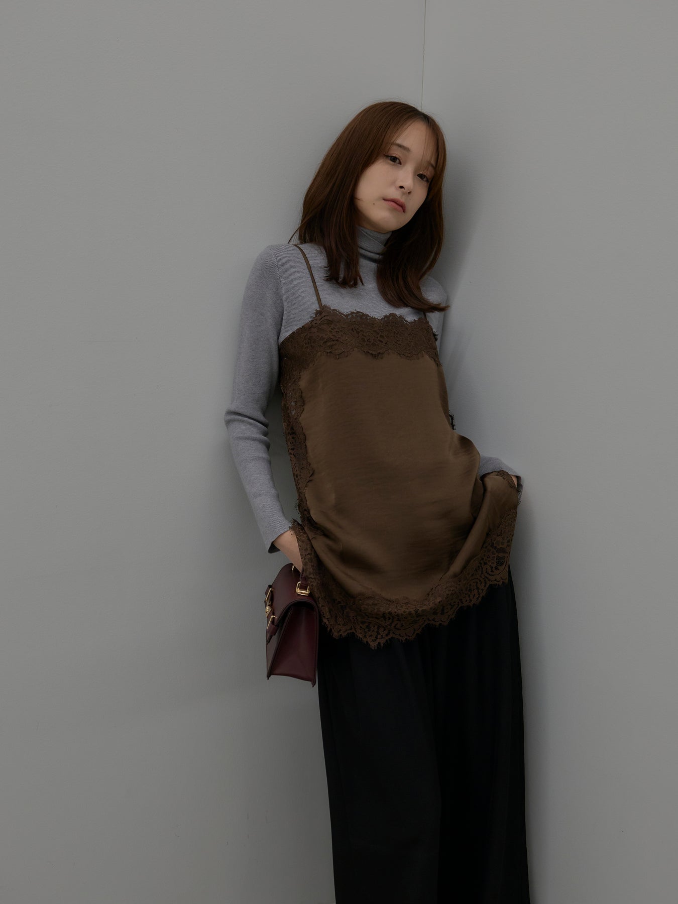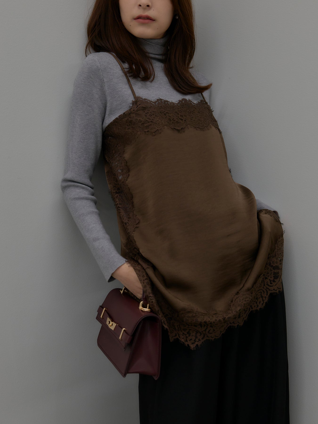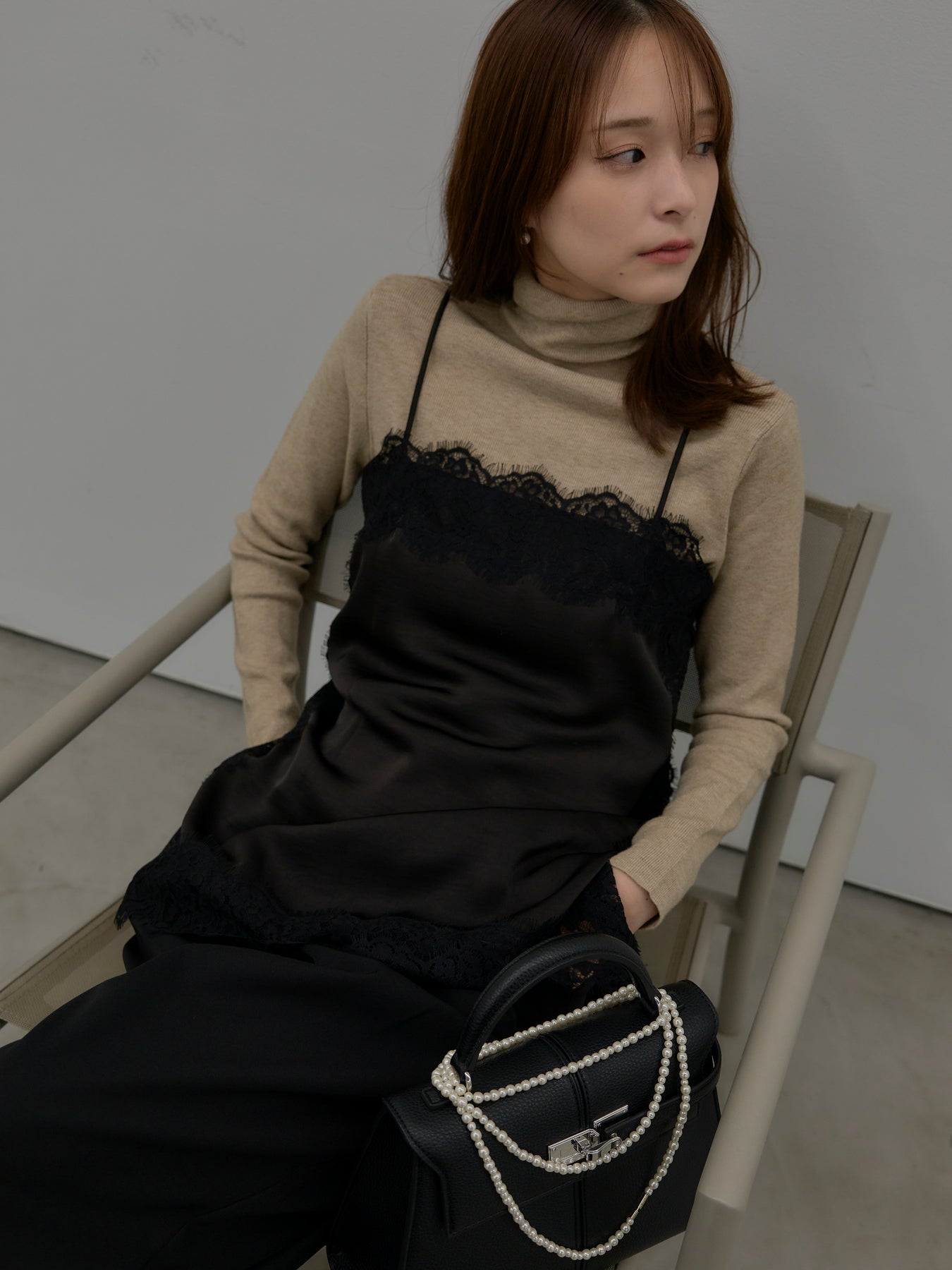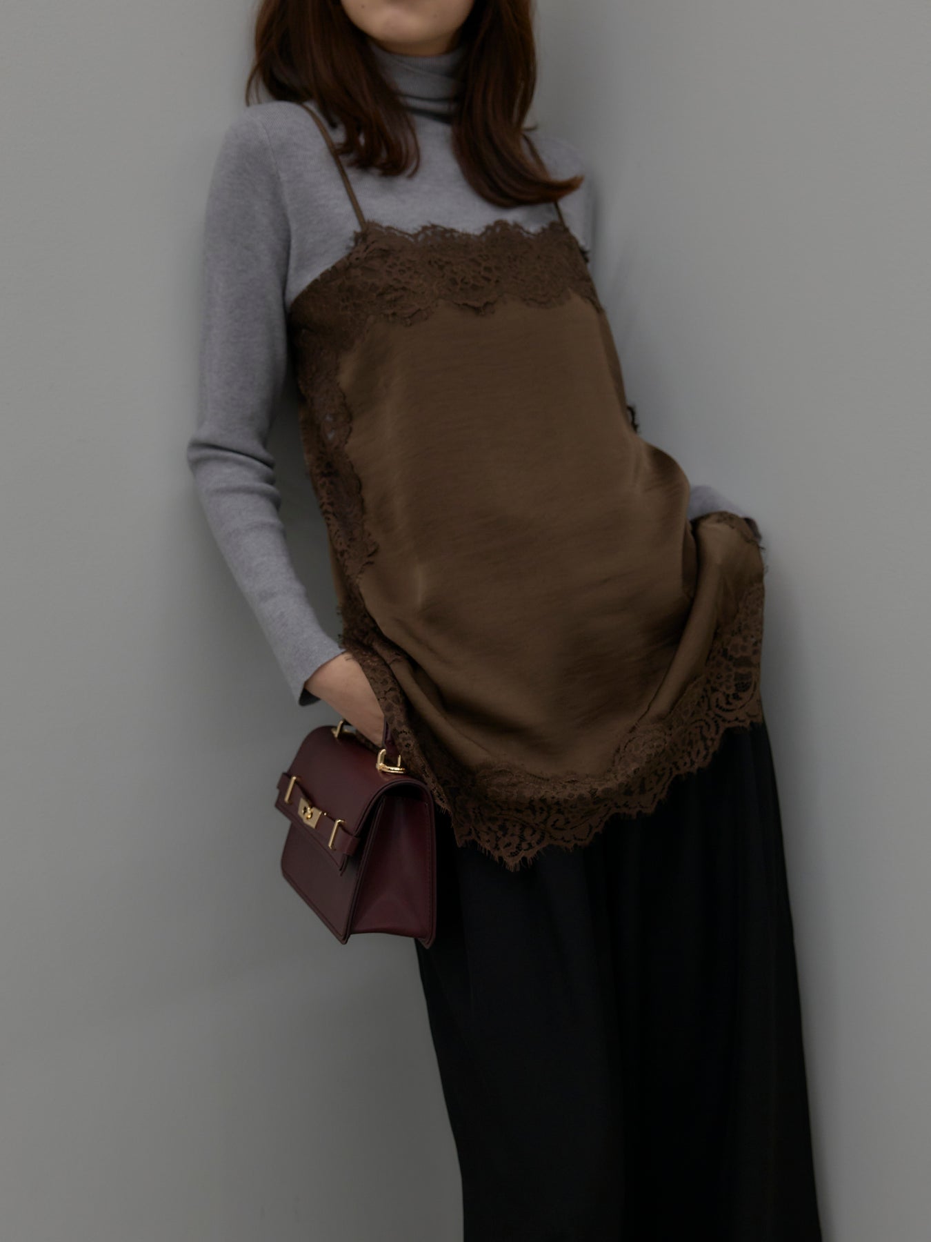 繊細なレースと上品な光沢のサテンを組み合わせたキャミソール。 華奢なストラップと程よいツヤ感が女性らしさを引き立てます。サイドもしっかりレースがついていて、紐部分もサテンになっているので下着感なく、都会的に落とし込んでいただけます。 春まで活躍すること間違いなしのアイテムで、今の時期はニットのインナーに仕込んだり、ニットカーデの下に1枚でサラッときていただくのもおすすめ。春になればジャケットの中に合わせたり、Tシャツの上から重ねても◎ 着回し無限大のアイテムです。