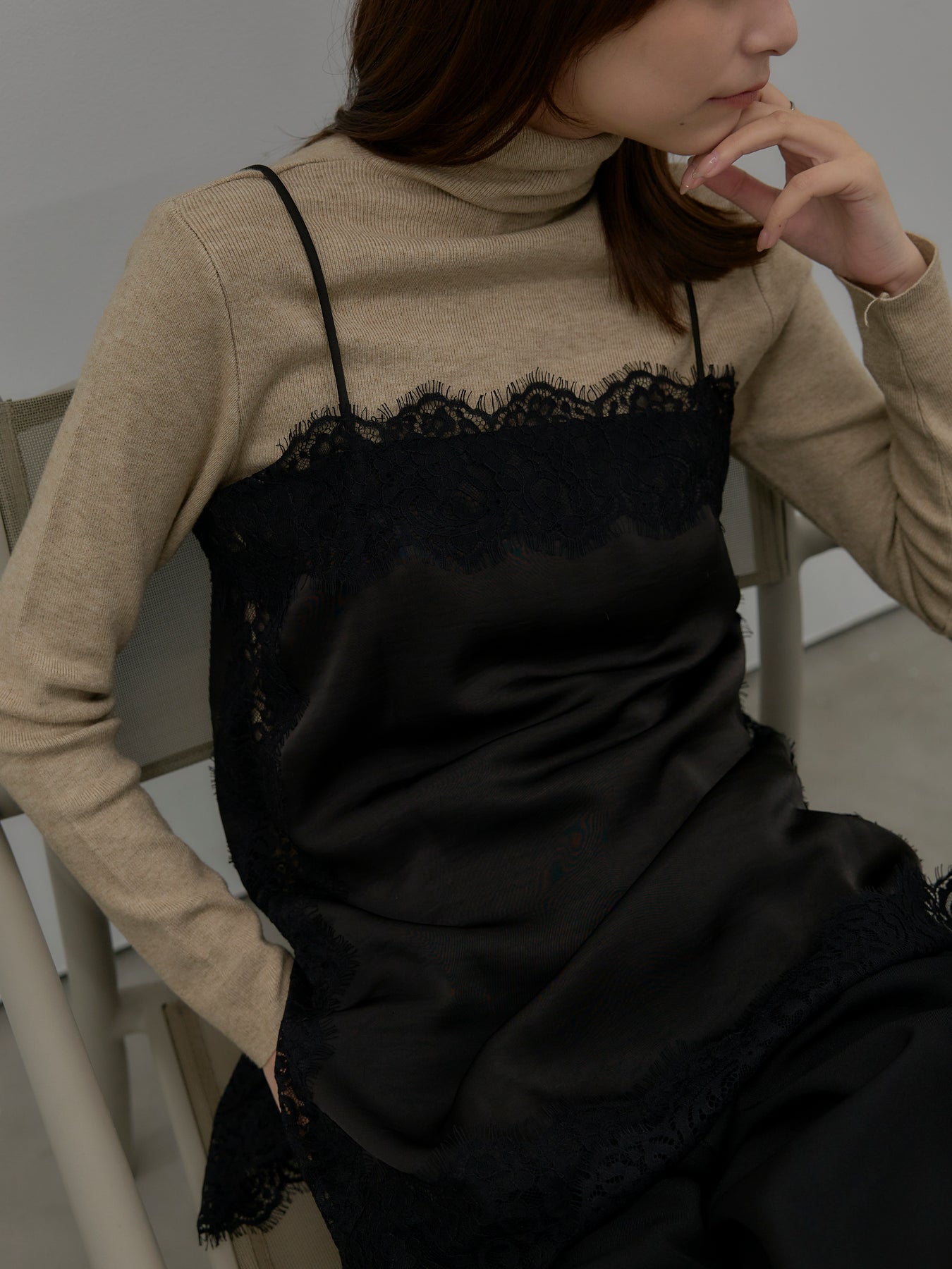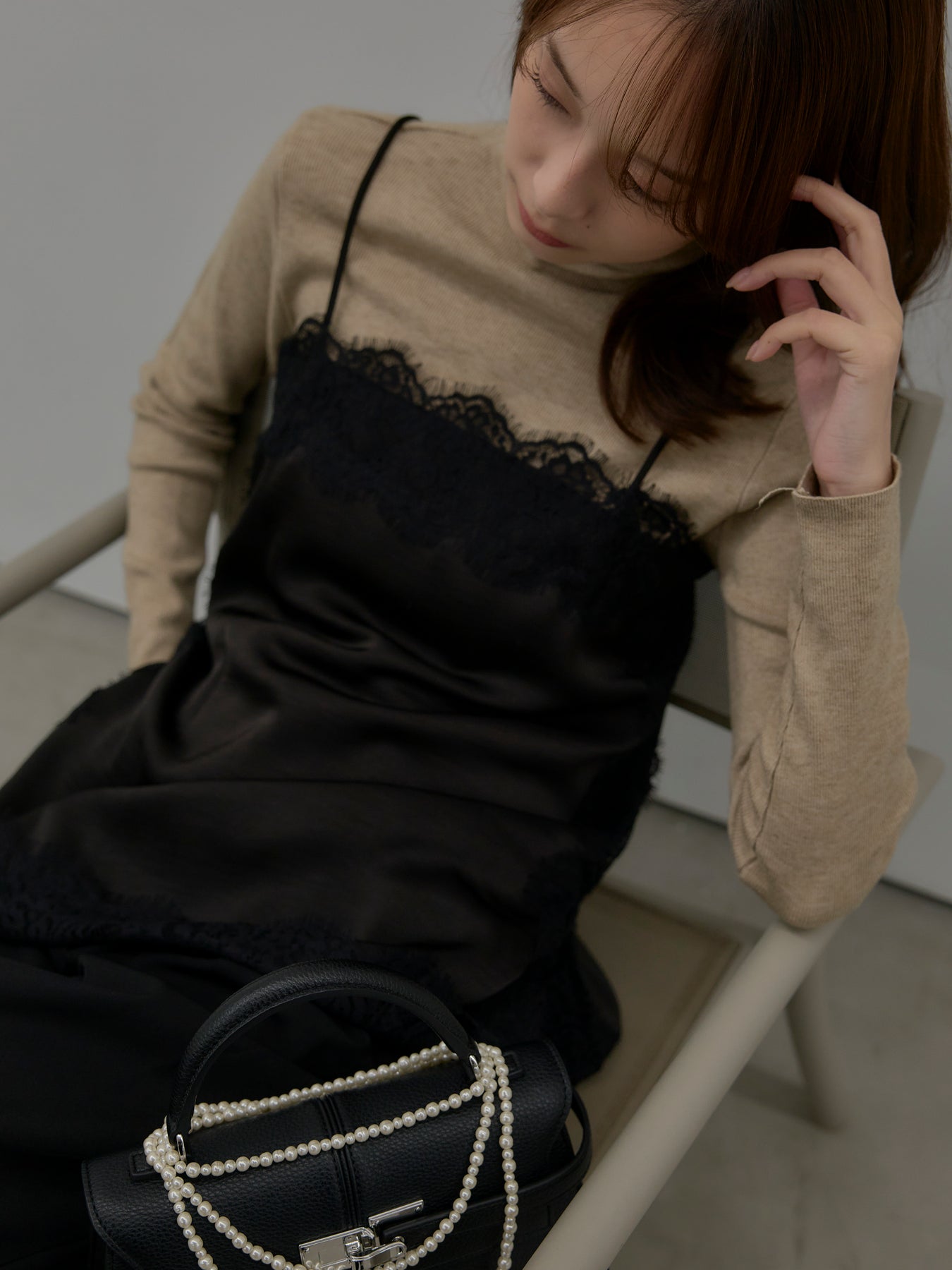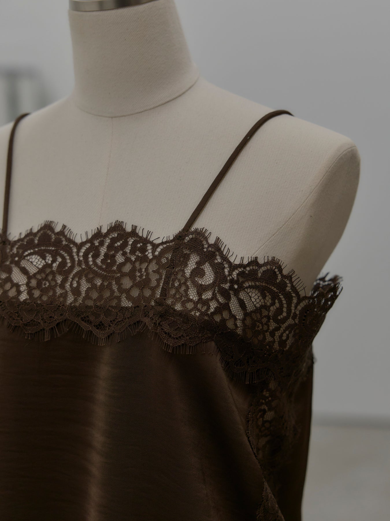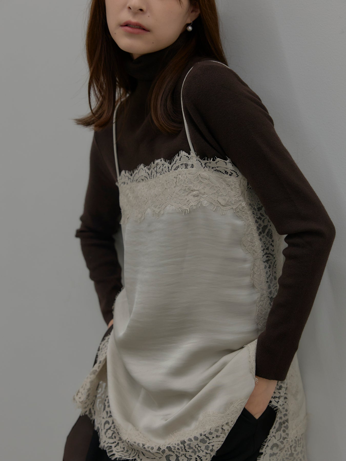 繊細なレースと上品な光沢のサテンを組み合わせたキャミソール。 華奢なストラップと程よいツヤ感が女性らしさを引き立てます。サイドもしっかりレースがついていて、紐部分もサテンになっているので下着感なく、都会的に落とし込んでいただけます。 春まで活躍すること間違いなしのアイテムで、今の時期はニットのインナーに仕込んだり、ニットカーデの下に1枚でサラッときていただくのもおすすめ。春になればジャケットの中に合わせたり、Tシャツの上から重ねても◎ 着回し無限大のアイテムです。