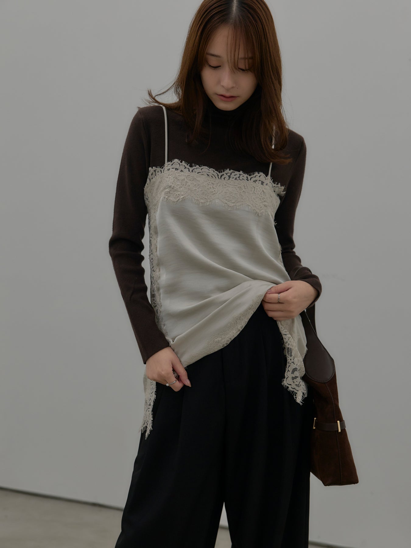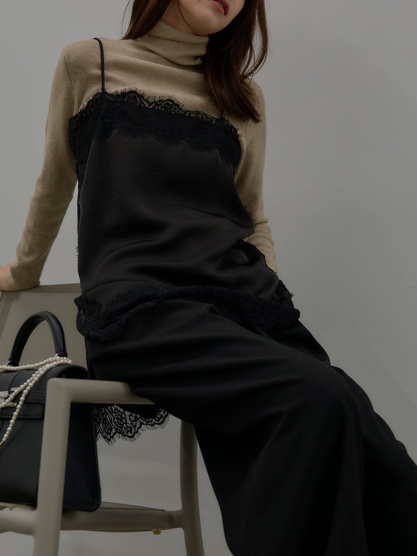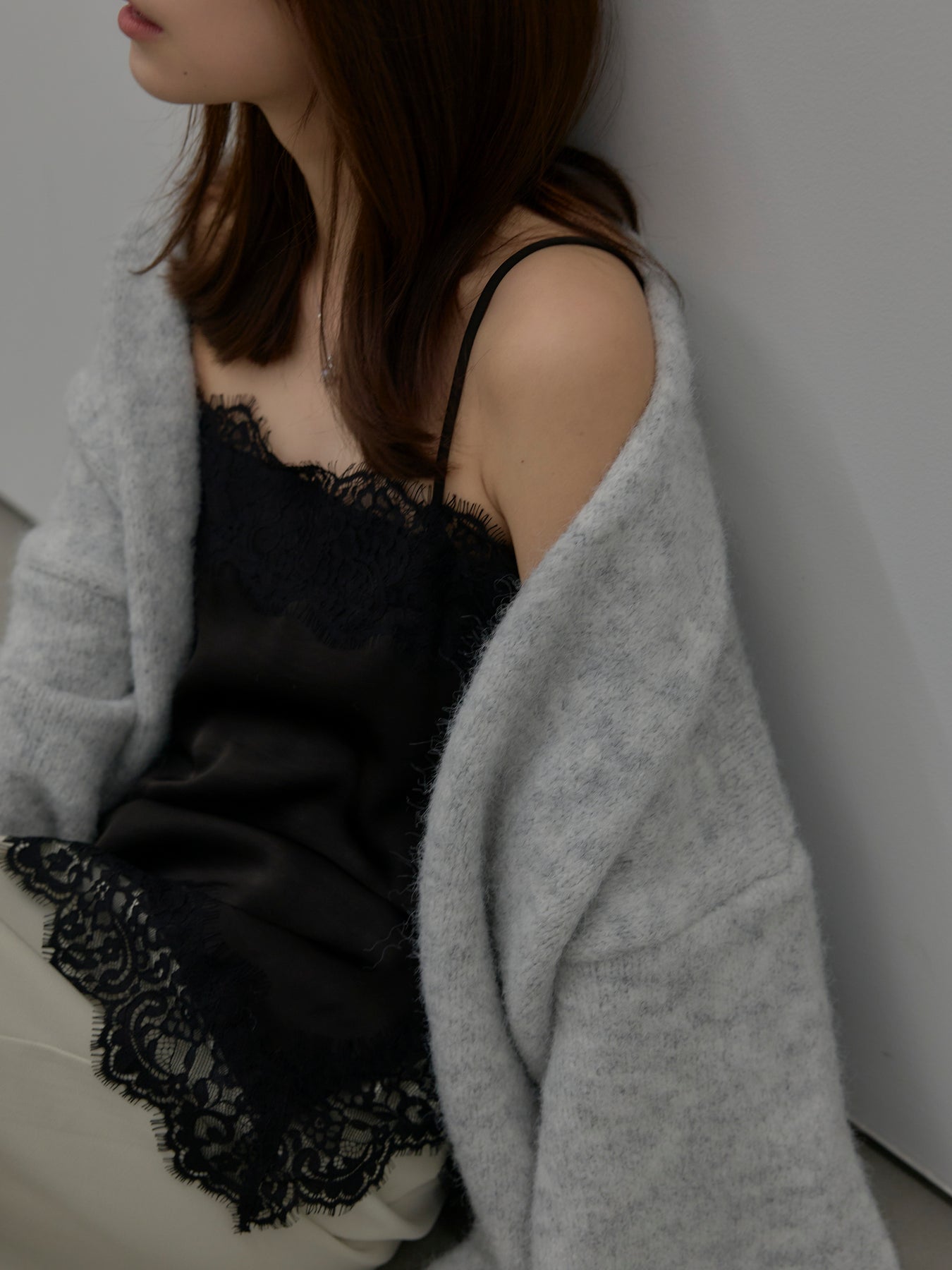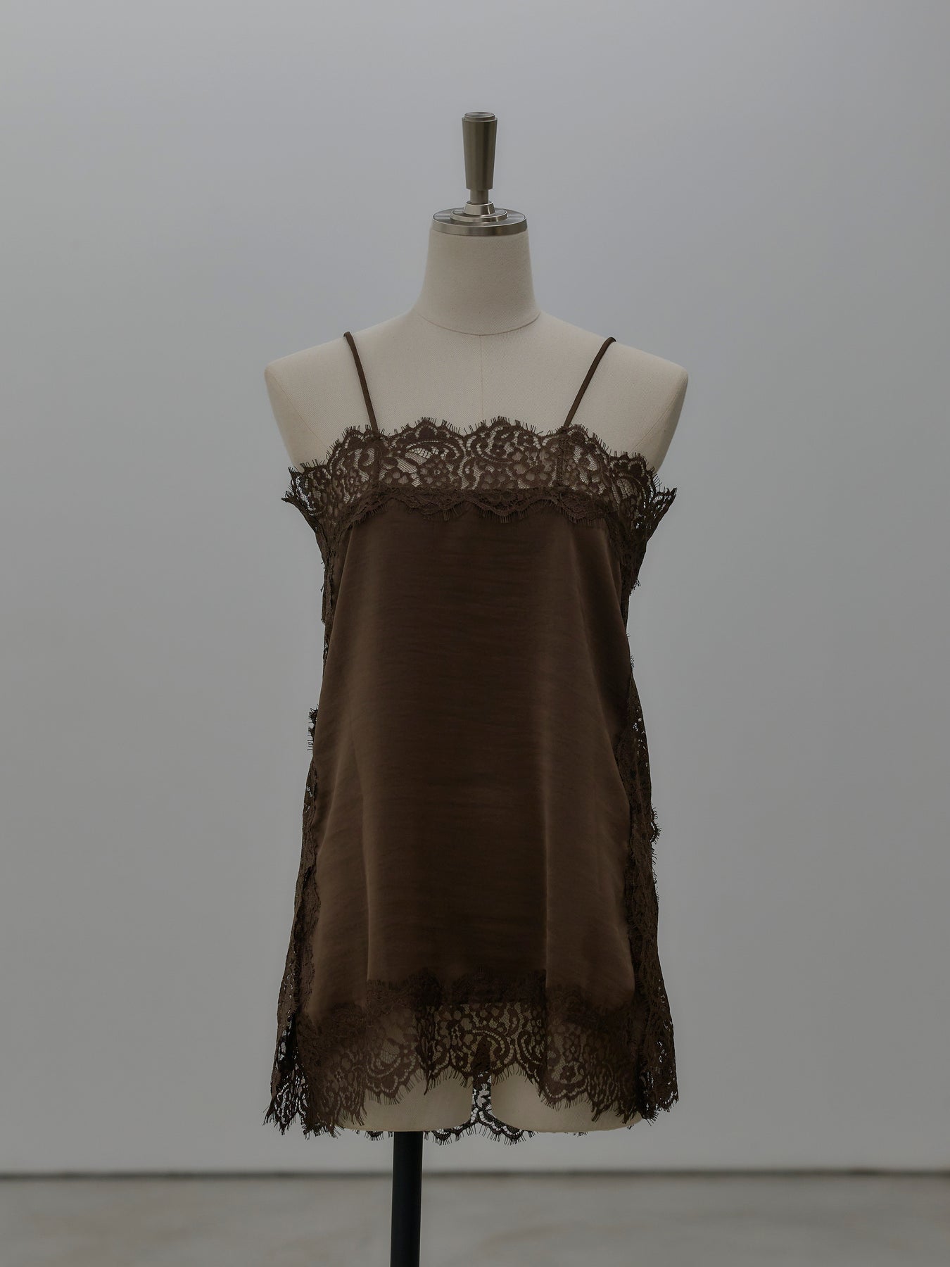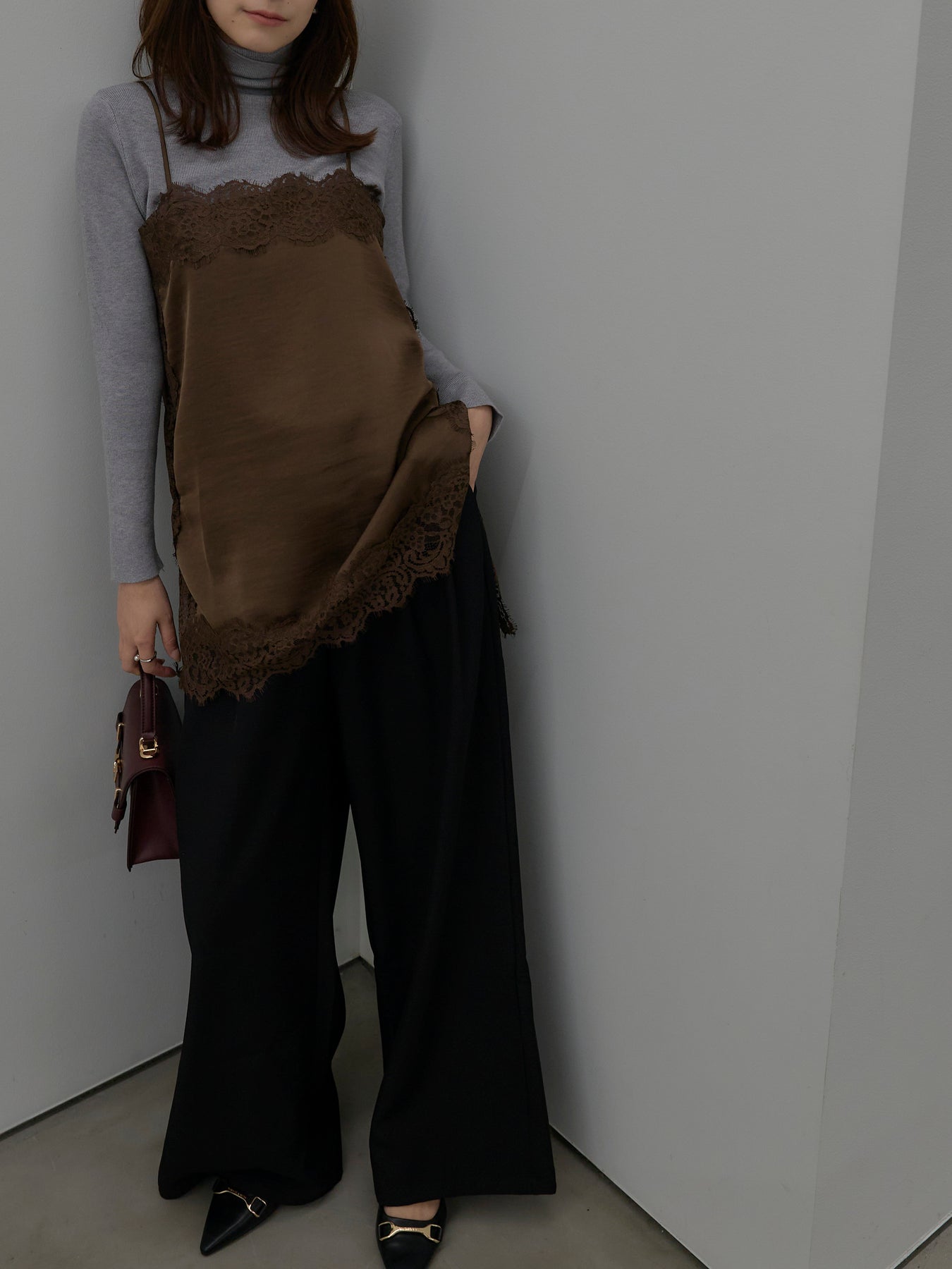 繊細なレースと上品な光沢のサテンを組み合わせたキャミソール。 華奢なストラップと程よいツヤ感が女性らしさを引き立てます。サイドもしっかりレースがついていて、紐部分もサテンになっているので下着感なく、都会的に落とし込んでいただけます。 春まで活躍すること間違いなしのアイテムで、今の時期はニットのインナーに仕込んだり、ニットカーデの下に1枚でサラッときていただくのもおすすめ。春になればジャケットの中に合わせたり、Tシャツの上から重ねても◎ 着回し無限大のアイテムです。