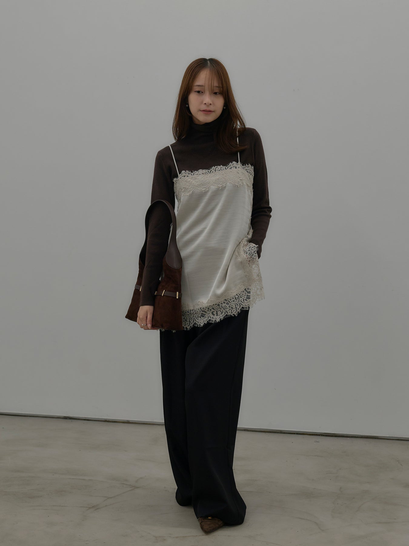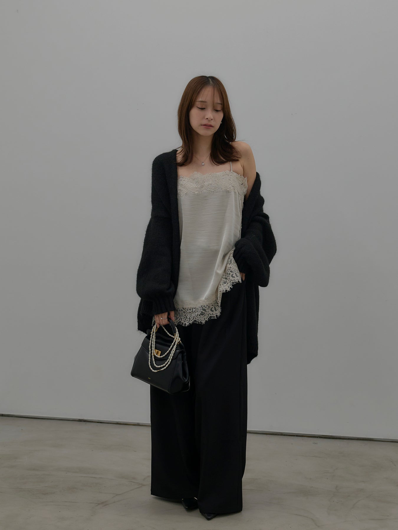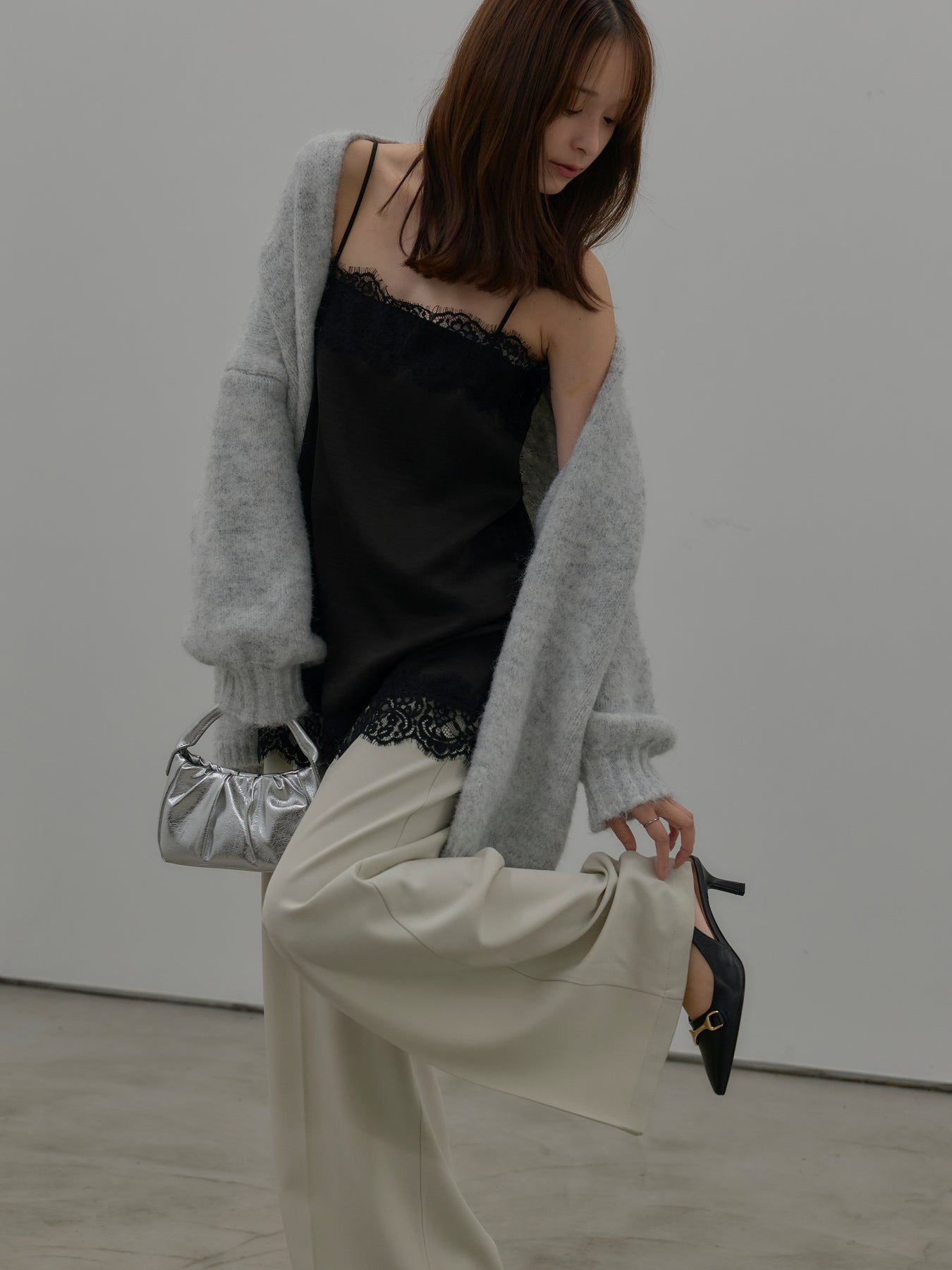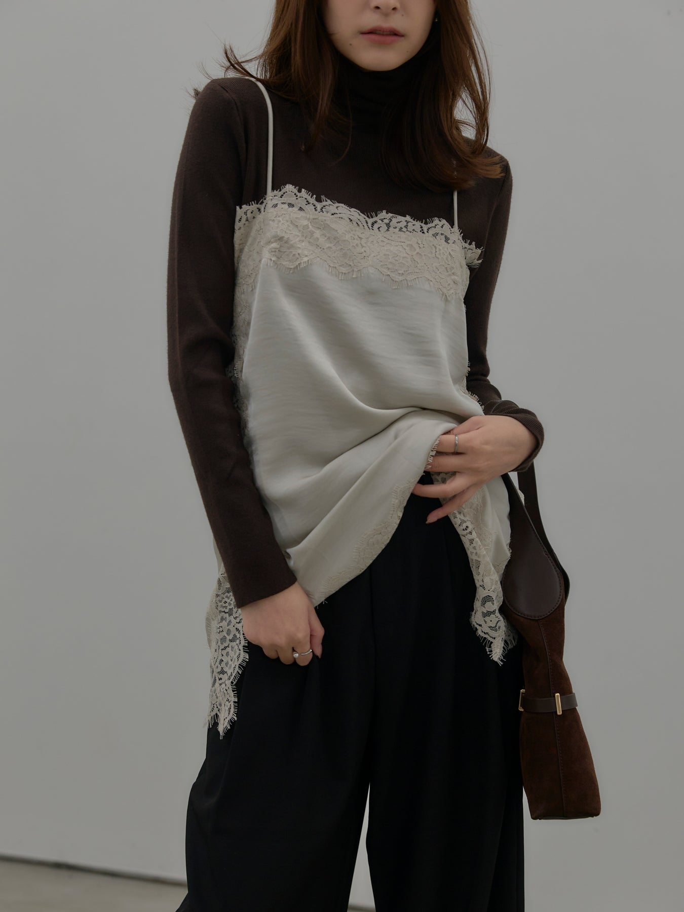 繊細なレースと上品な光沢のサテンを組み合わせたキャミソール。 華奢なストラップと程よいツヤ感が女性らしさを引き立てます。サイドもしっかりレースがついていて、紐部分もサテンになっているので下着感なく、都会的に落とし込んでいただけます。 春まで活躍すること間違いなしのアイテムで、今の時期はニットのインナーに仕込んだり、ニットカーデの下に1枚でサラッときていただくのもおすすめ。春になればジャケットの中に合わせたり、Tシャツの上から重ねても◎ 着回し無限大のアイテムです。