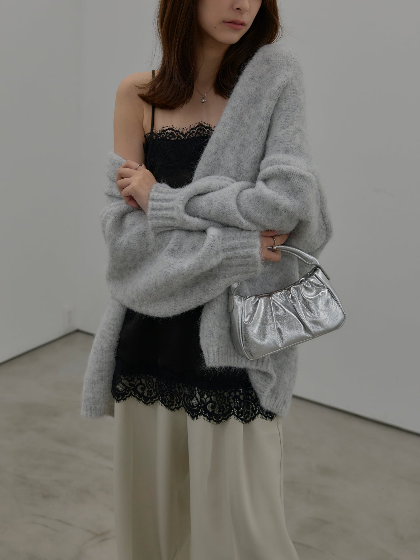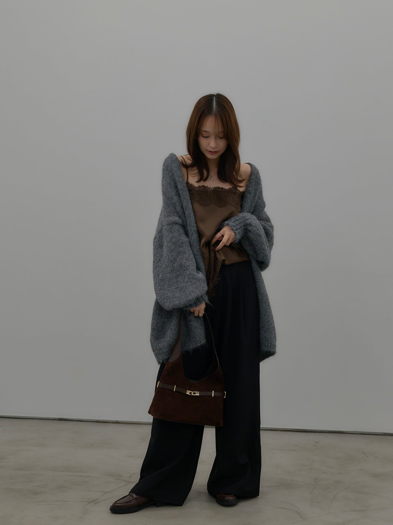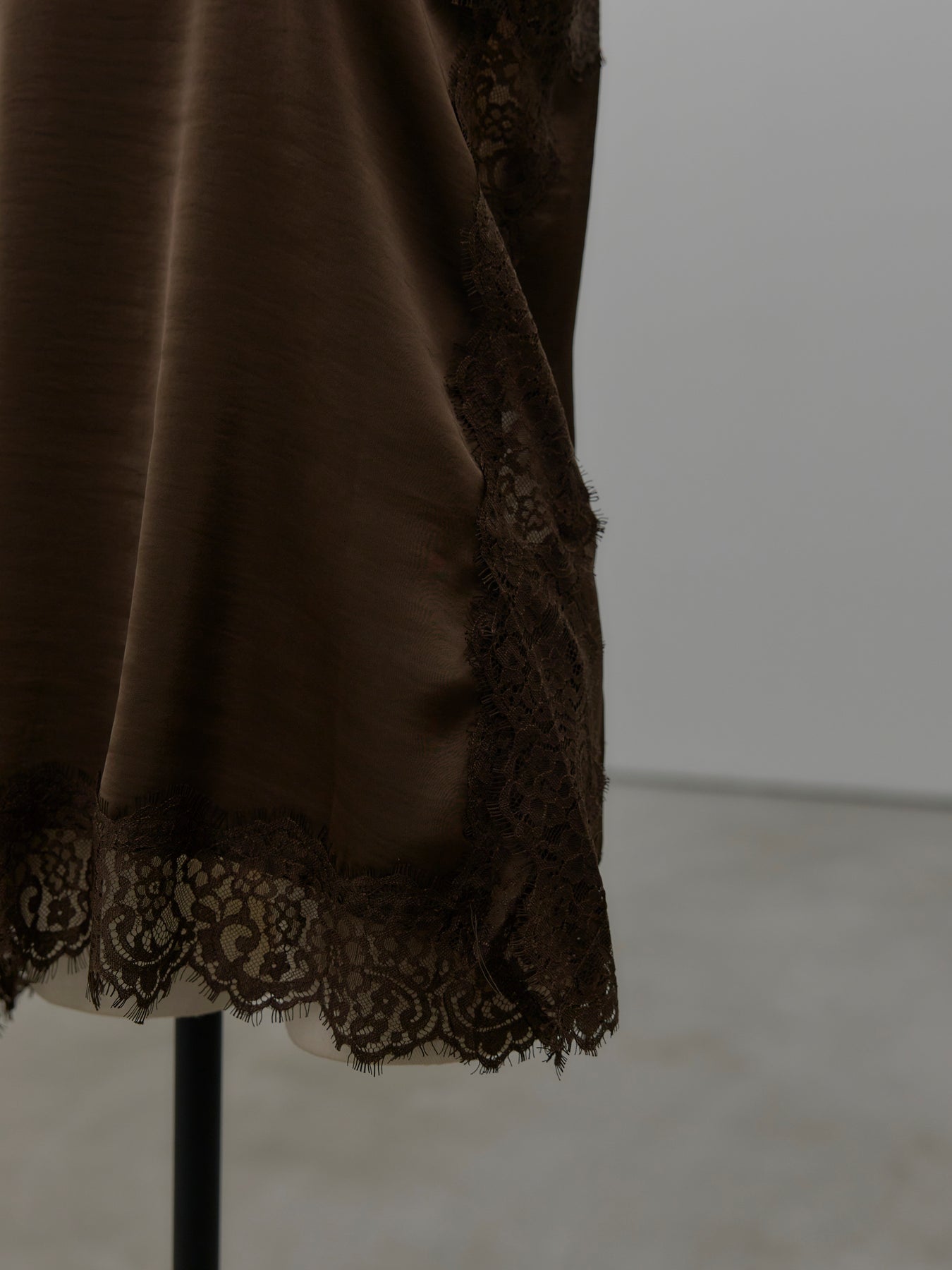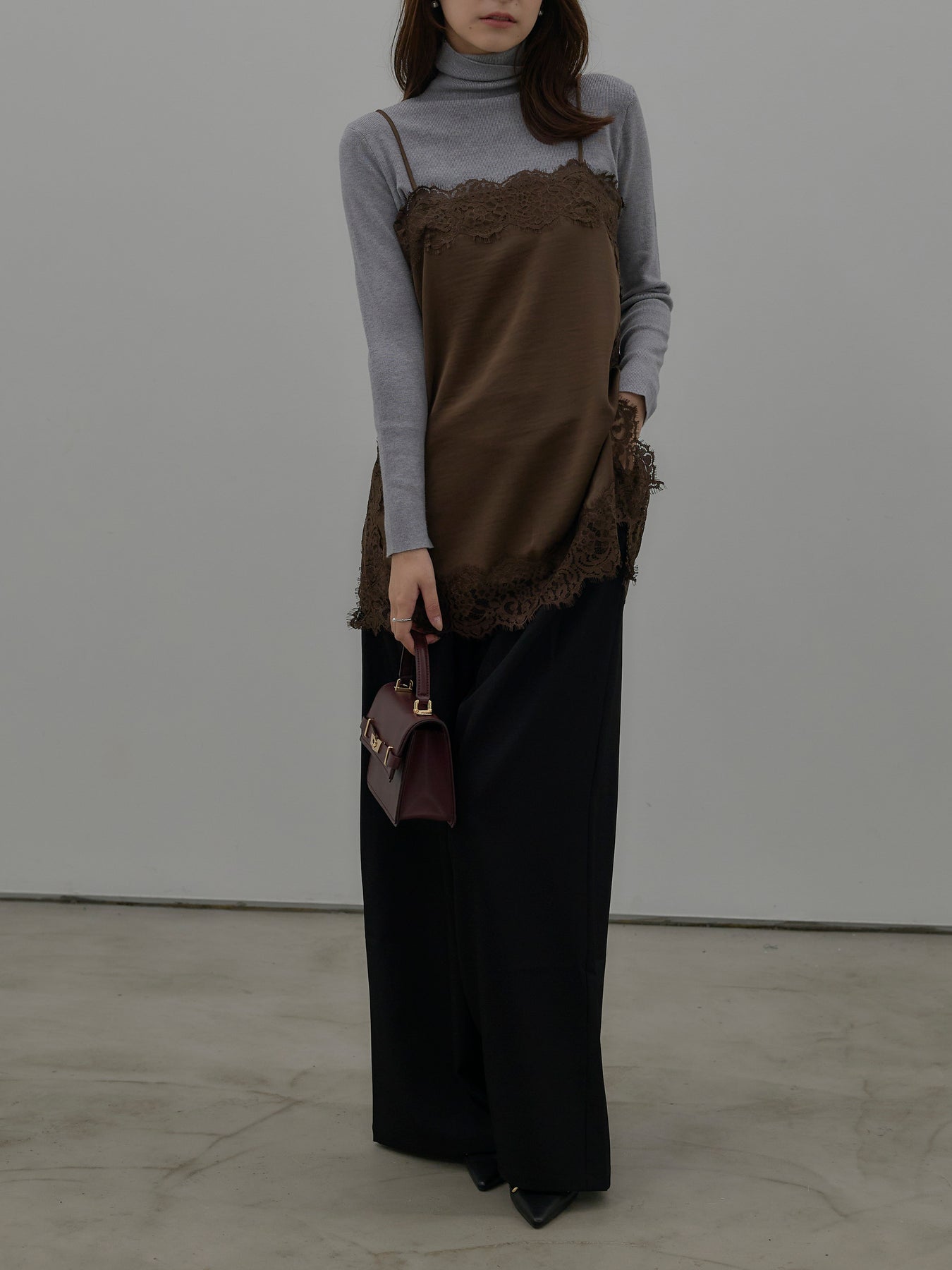 繊細なレースと上品な光沢のサテンを組み合わせたキャミソール。 華奢なストラップと程よいツヤ感が女性らしさを引き立てます。サイドもしっかりレースがついていて、紐部分もサテンになっているので下着感なく、都会的に落とし込んでいただけます。 春まで活躍すること間違いなしのアイテムで、今の時期はニットのインナーに仕込んだり、ニットカーデの下に1枚でサラッときていただくのもおすすめ。春になればジャケットの中に合わせたり、Tシャツの上から重ねても◎ 着回し無限大のアイテムです。