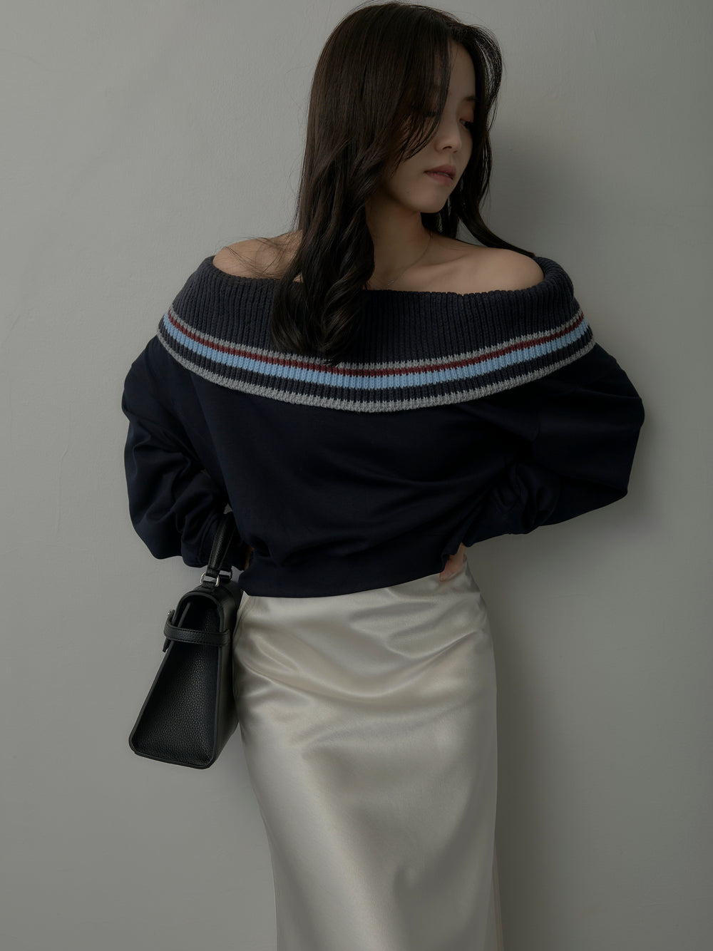 配色ボーダースウェットオフショルトップス