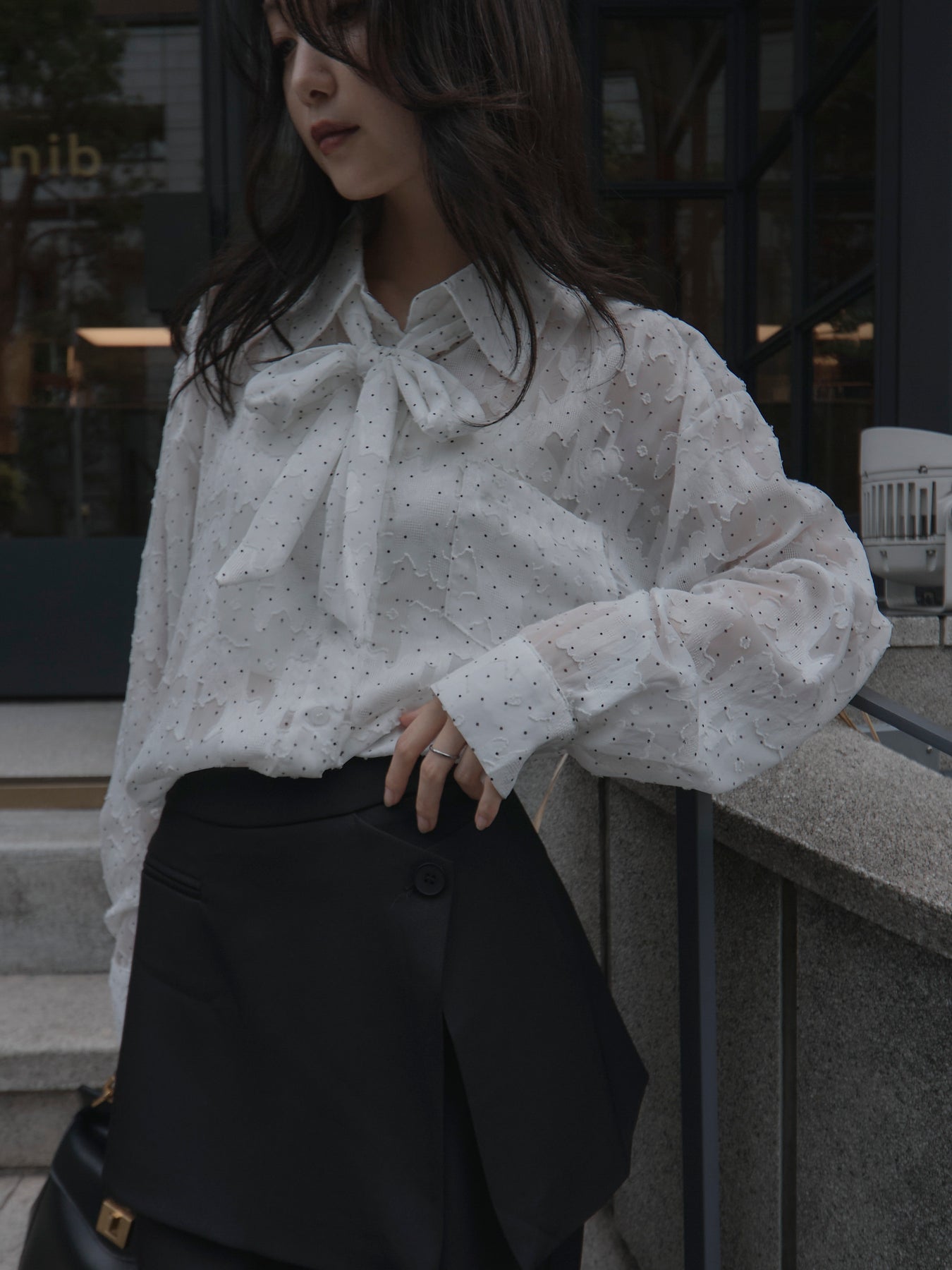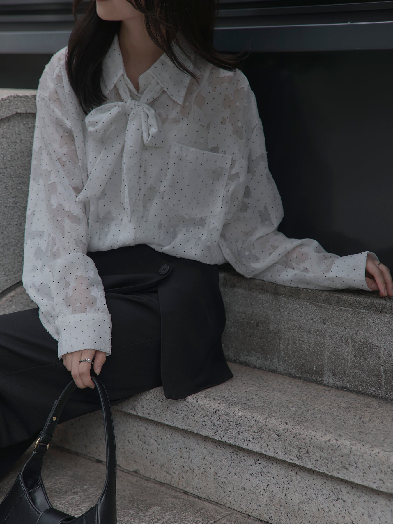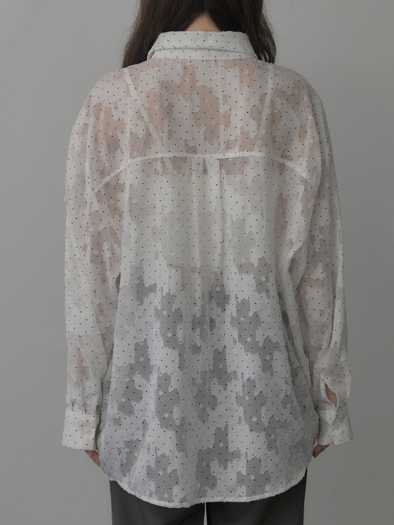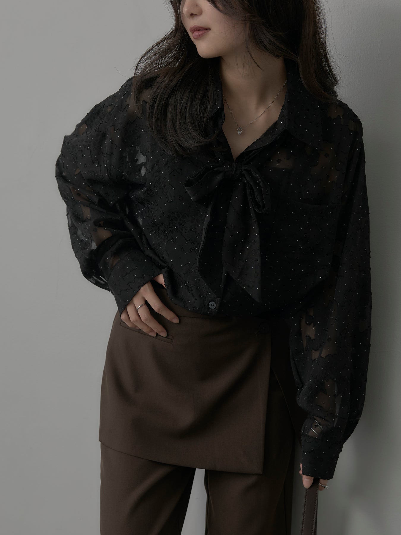 美しいシアージャガード素材にドット柄を合わせたボウタイシャツデザイン。リボンなしで着ていただくのもシンプルでおすすめです。透け感のあるアイテムなので同色のインナーを合わせていただくと綺麗に纏まります。秋だけでなく春先にも活躍するアイテムです。