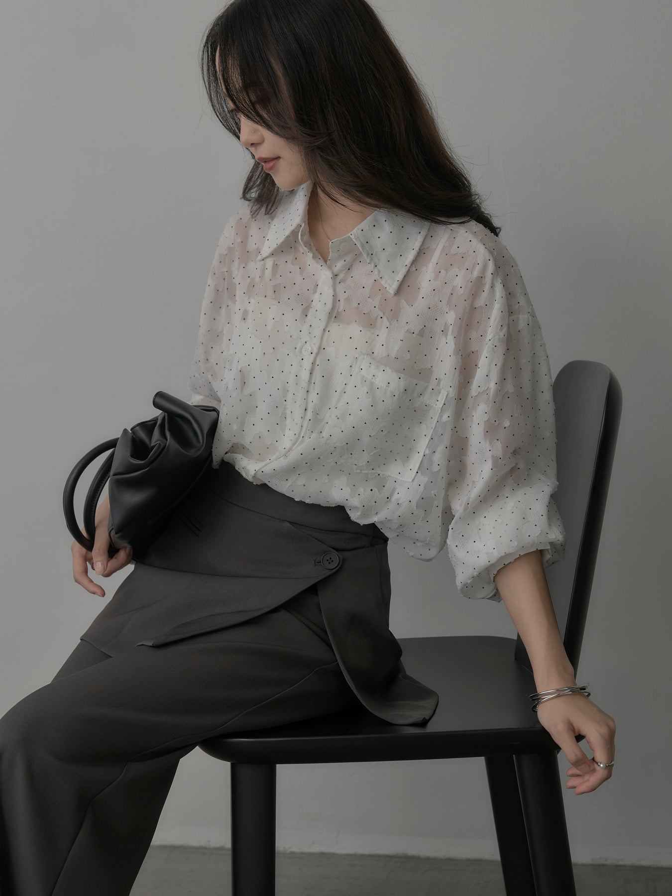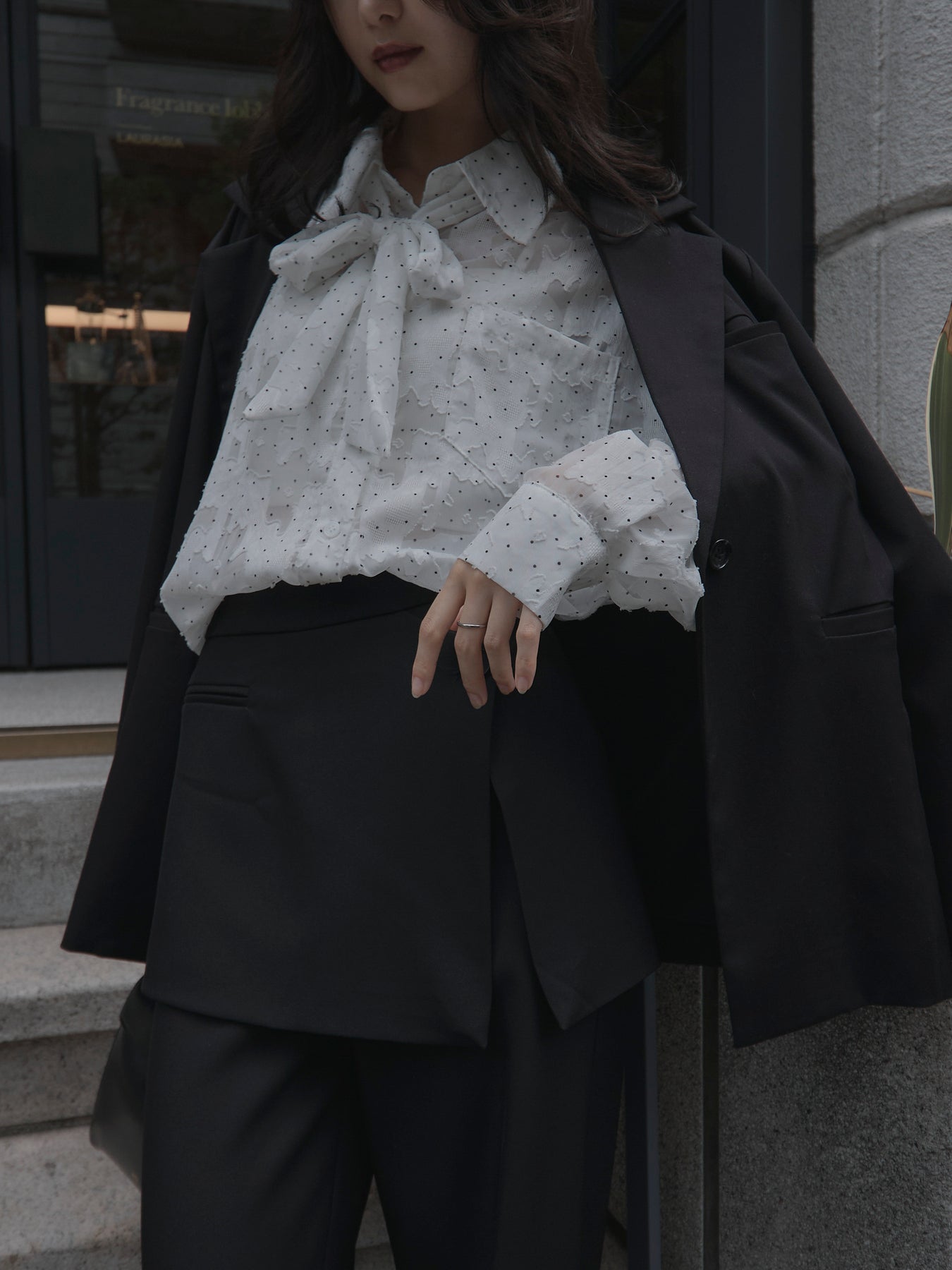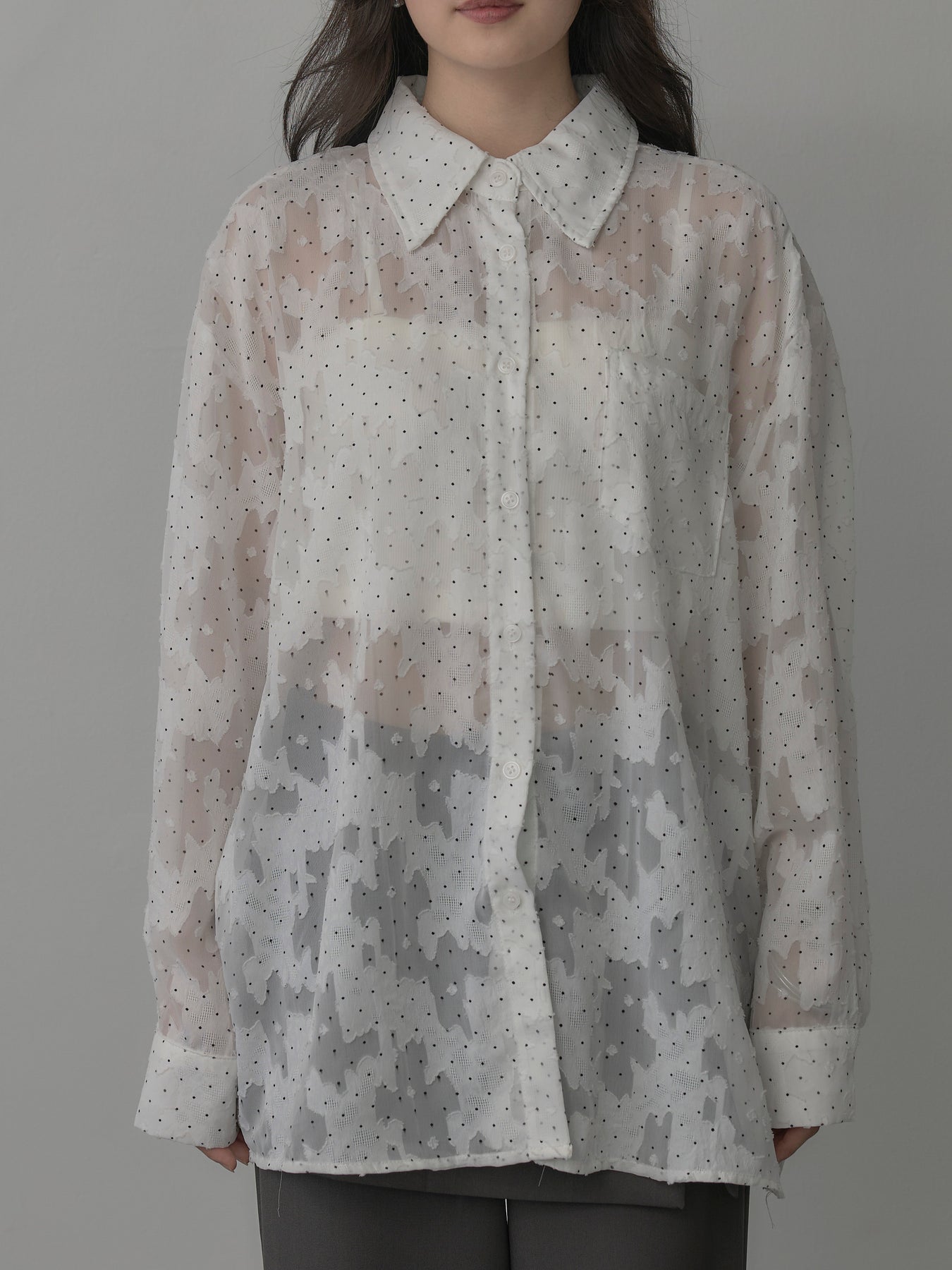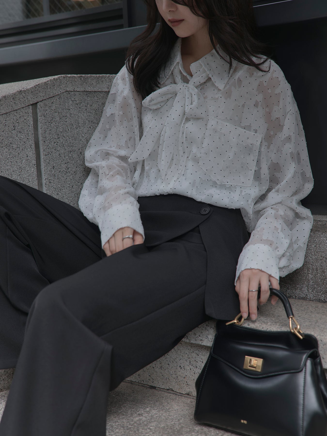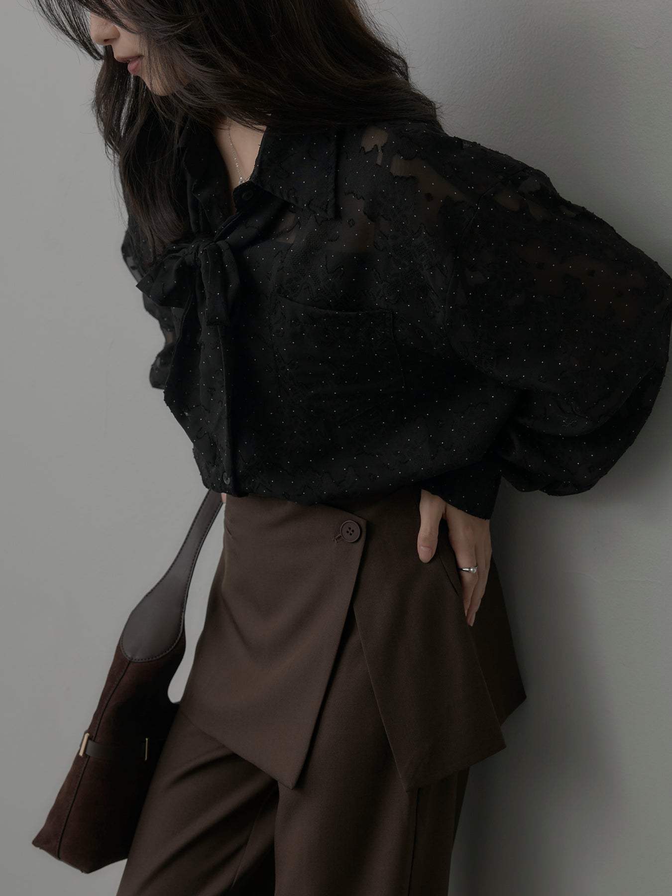 美しいシアージャガード素材にドット柄を合わせたボウタイシャツデザイン。リボンなしで着ていただくのもシンプルでおすすめです。透け感のあるアイテムなので同色のインナーを合わせていただくと綺麗に纏まります。秋だけでなく春先にも活躍するアイテムです。