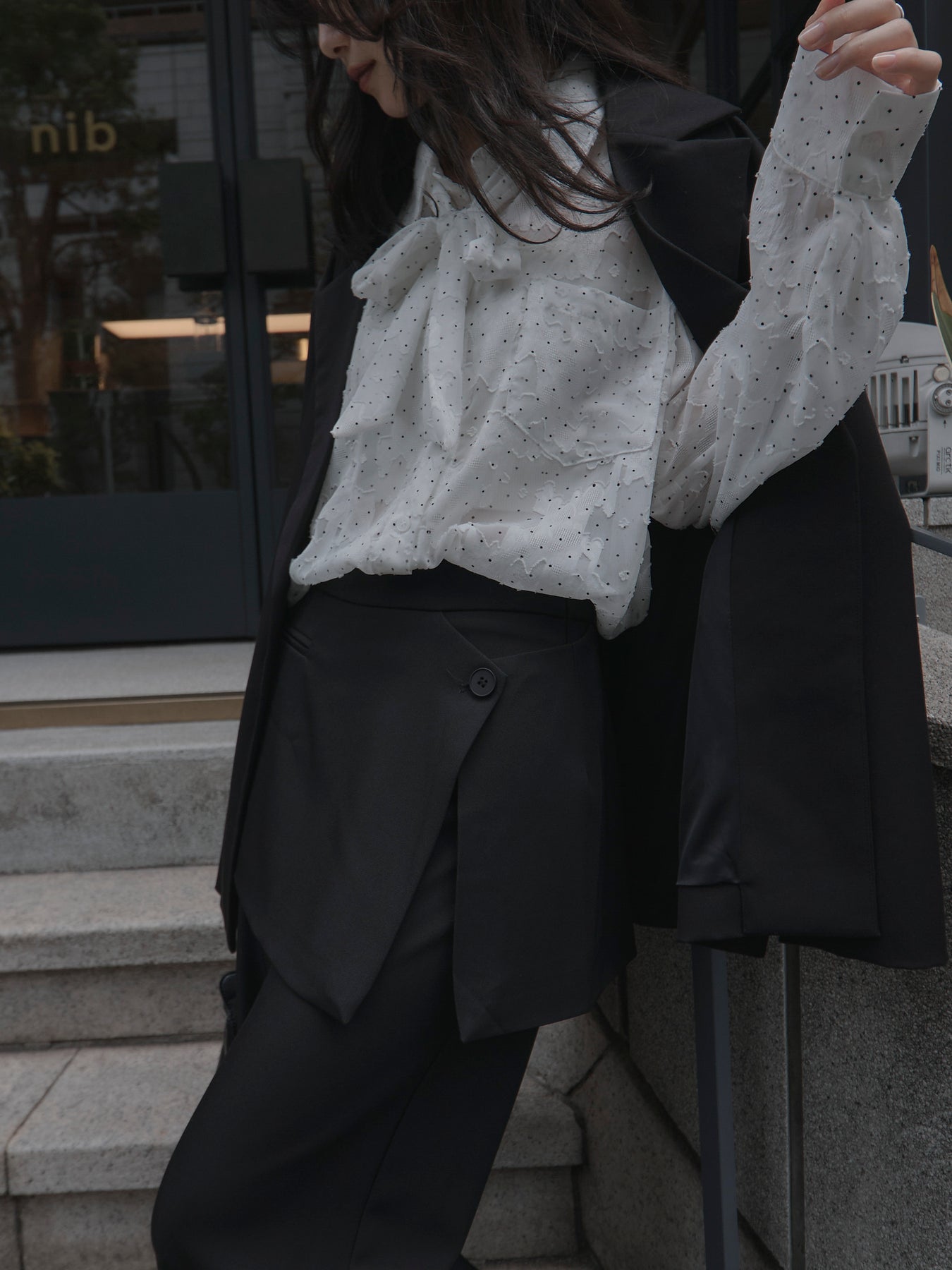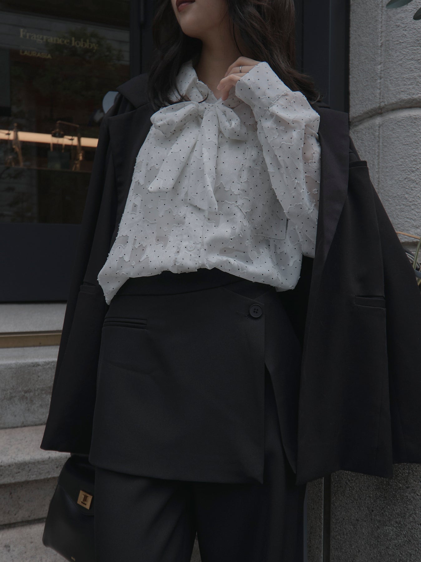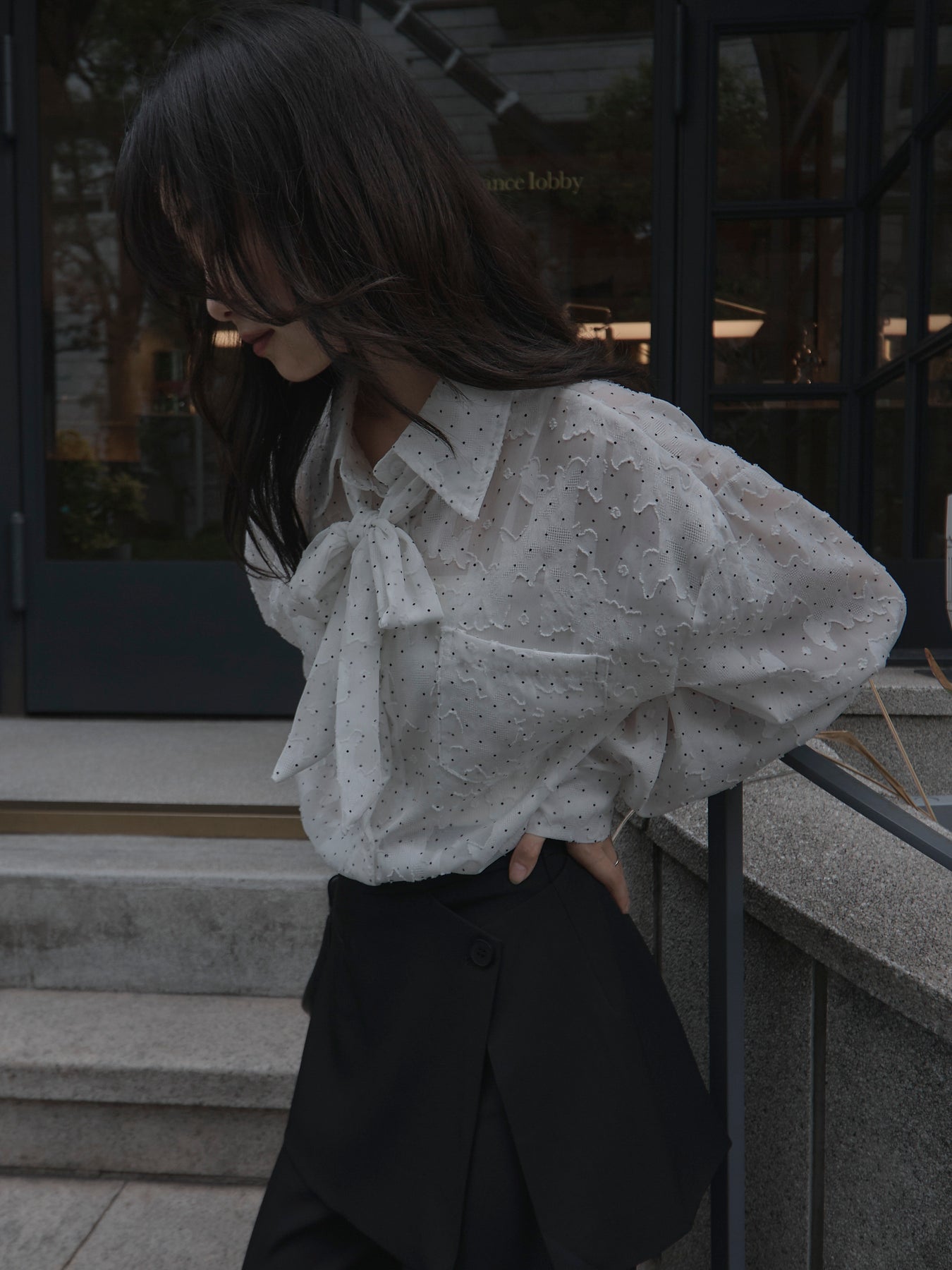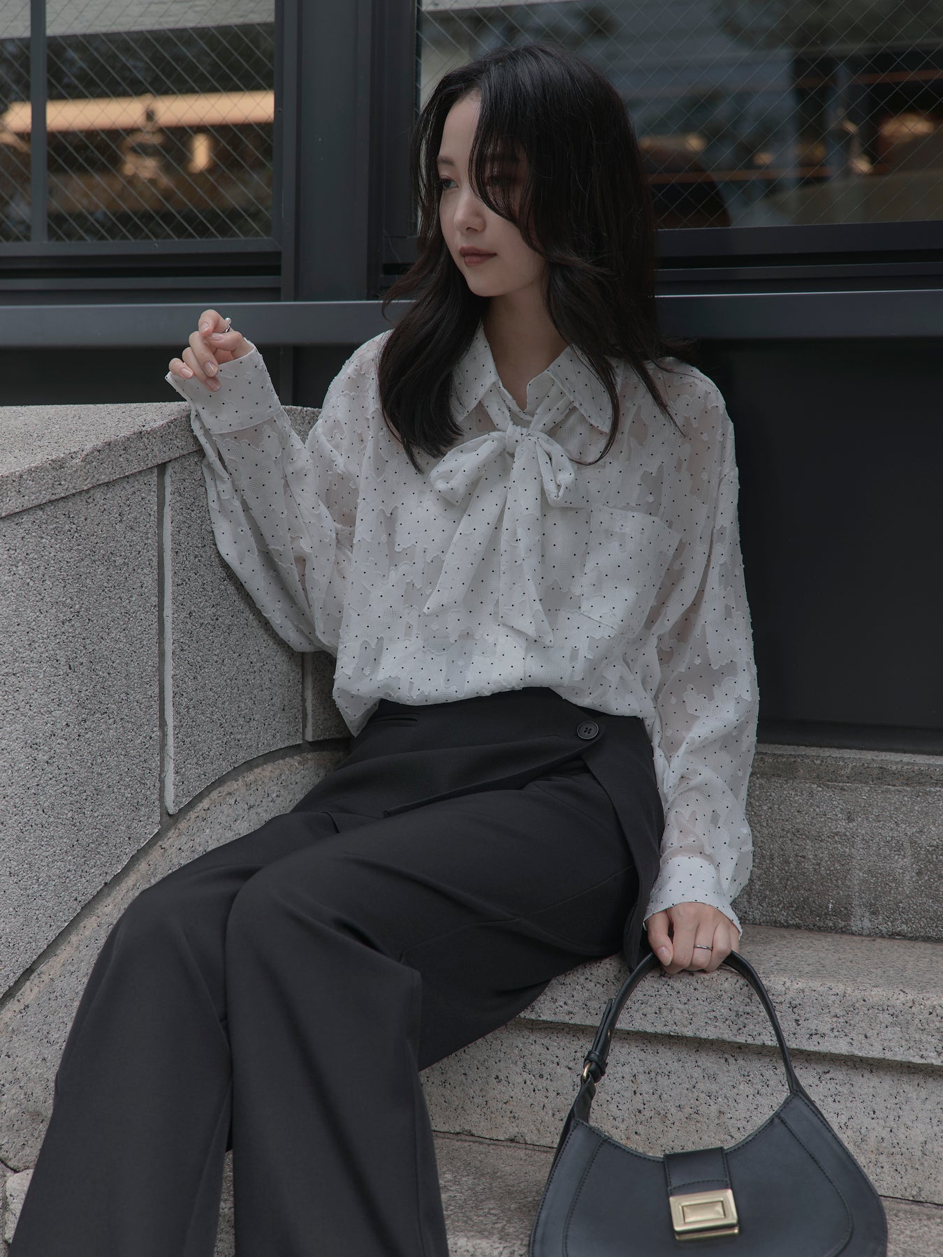 美しいシアージャガード素材にドット柄を合わせたボウタイシャツデザイン。リボンなしで着ていただくのもシンプルでおすすめです。透け感のあるアイテムなので同色のインナーを合わせていただくと綺麗に纏まります。秋だけでなく春先にも活躍するアイテムです。