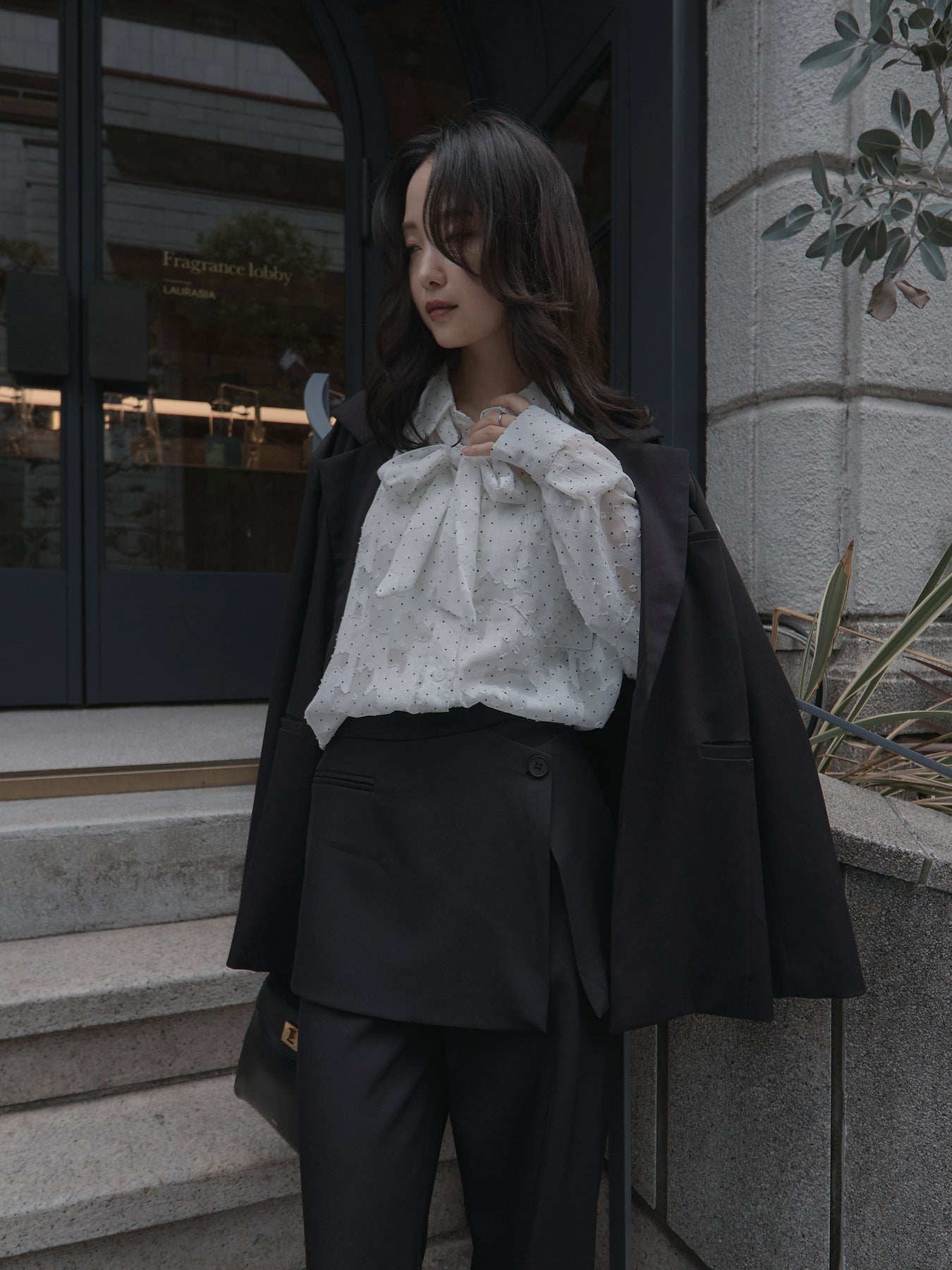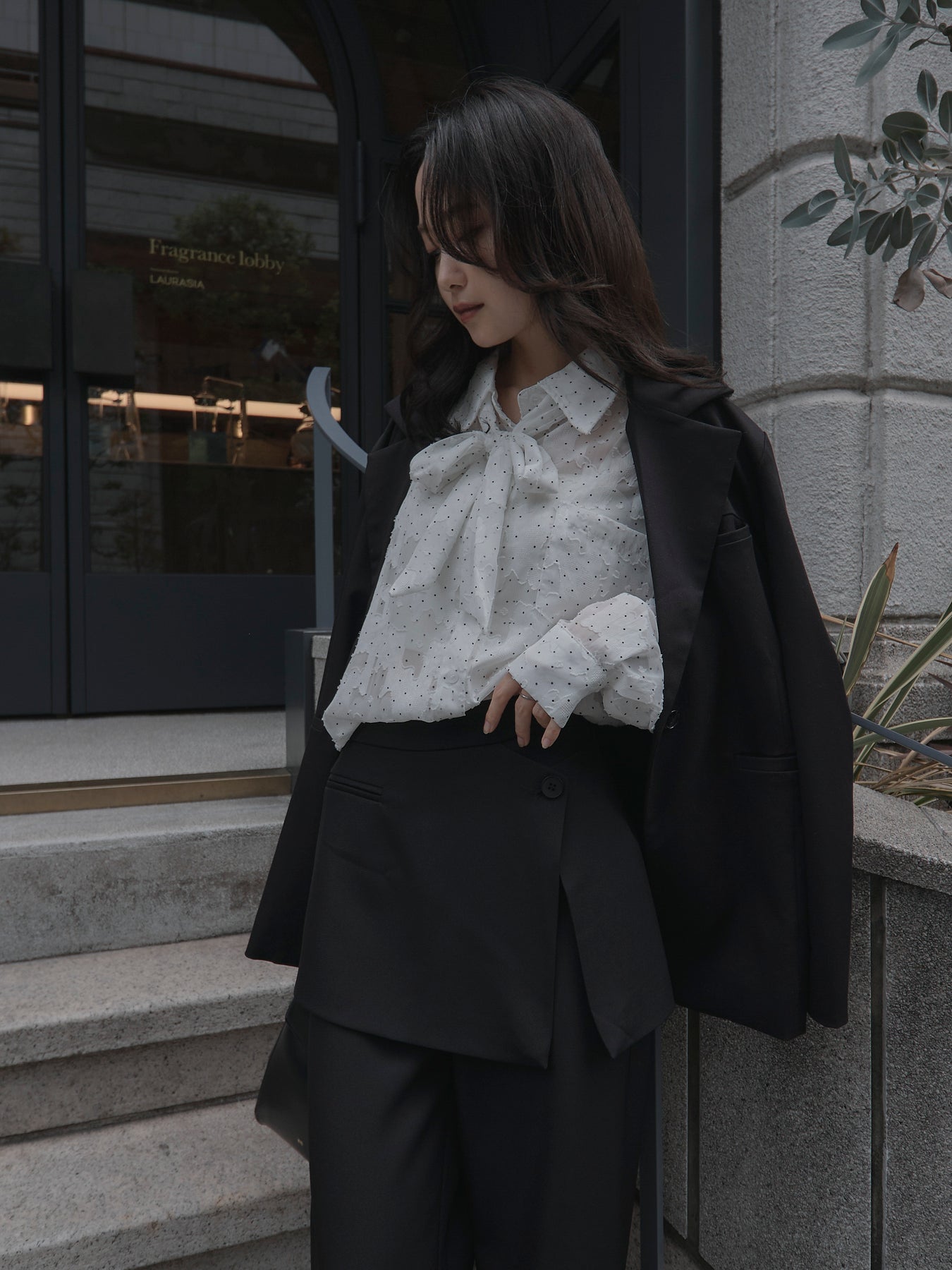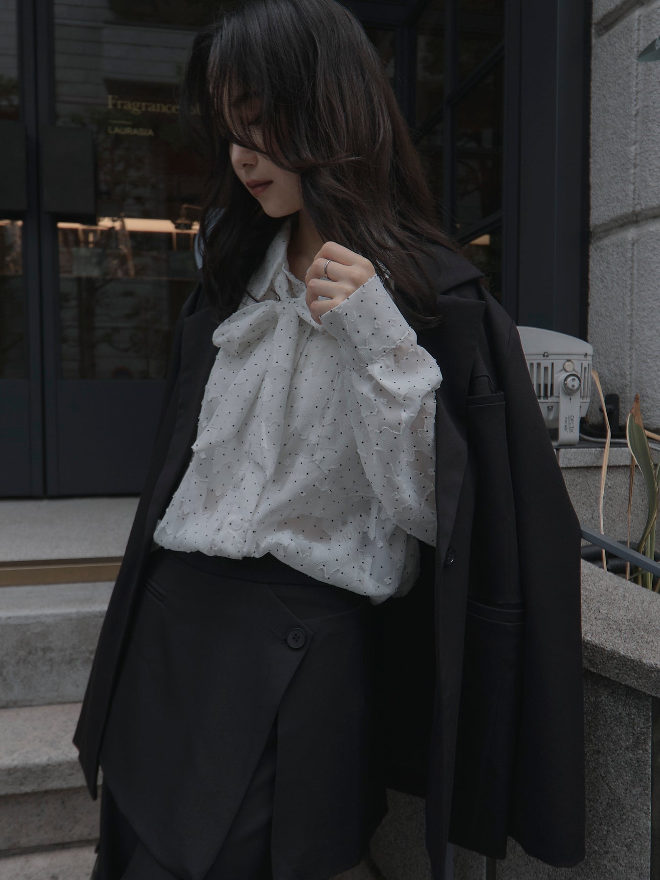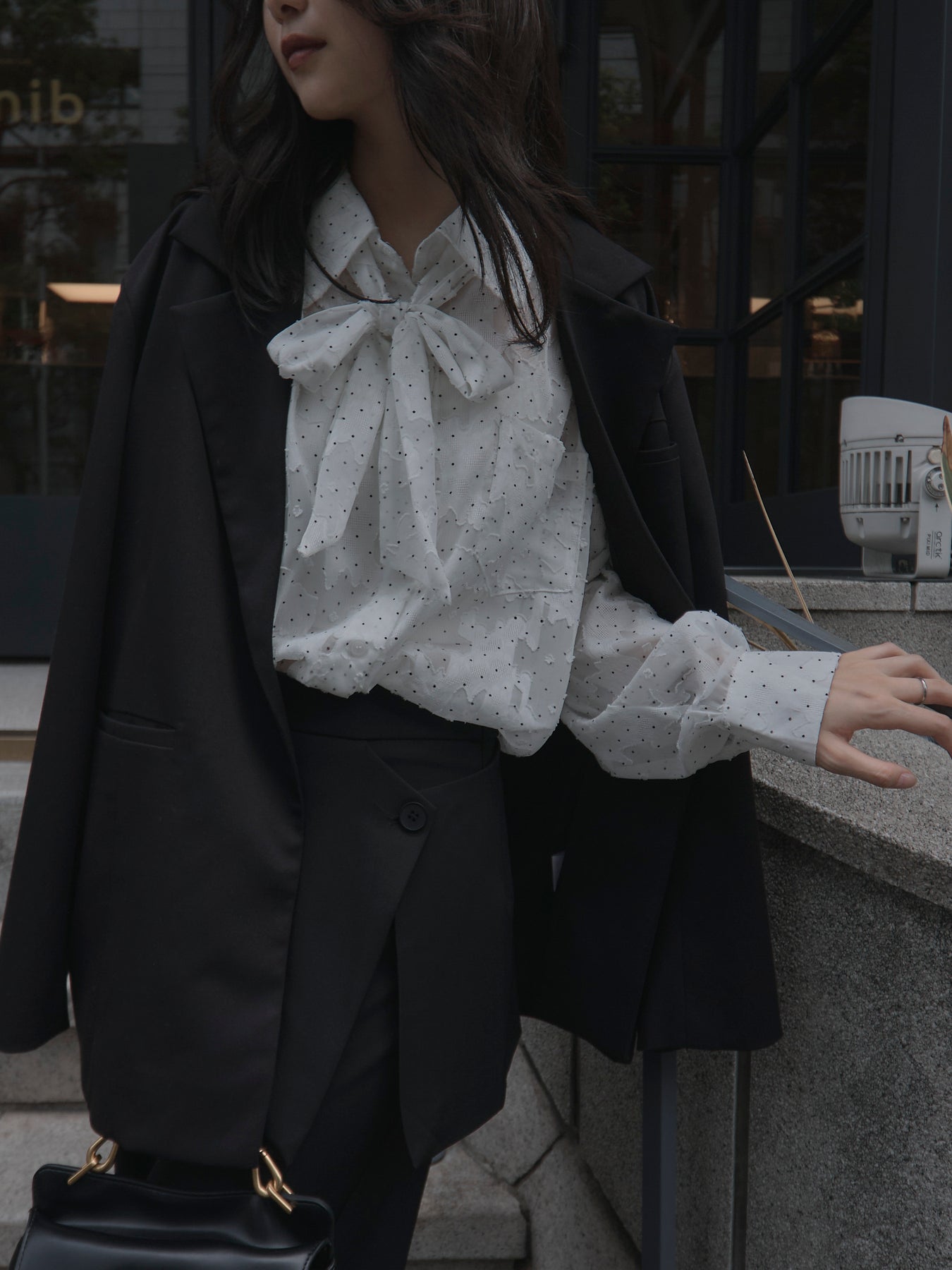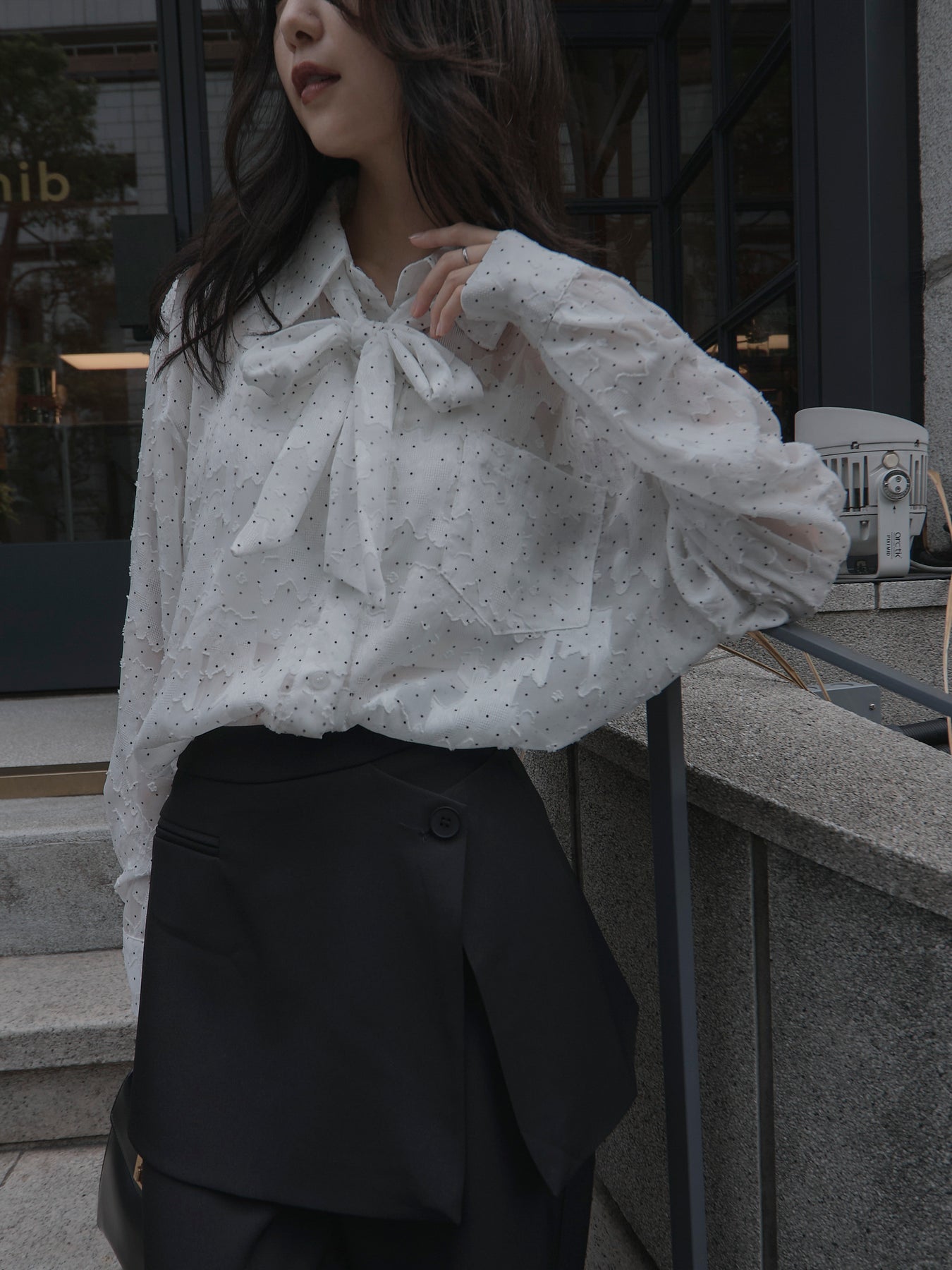 美しいシアージャガード素材にドット柄を合わせたボウタイシャツデザイン。リボンなしで着ていただくのもシンプルでおすすめです。透け感のあるアイテムなので同色のインナーを合わせていただくと綺麗に纏まります。秋だけでなく春先にも活躍するアイテムです。