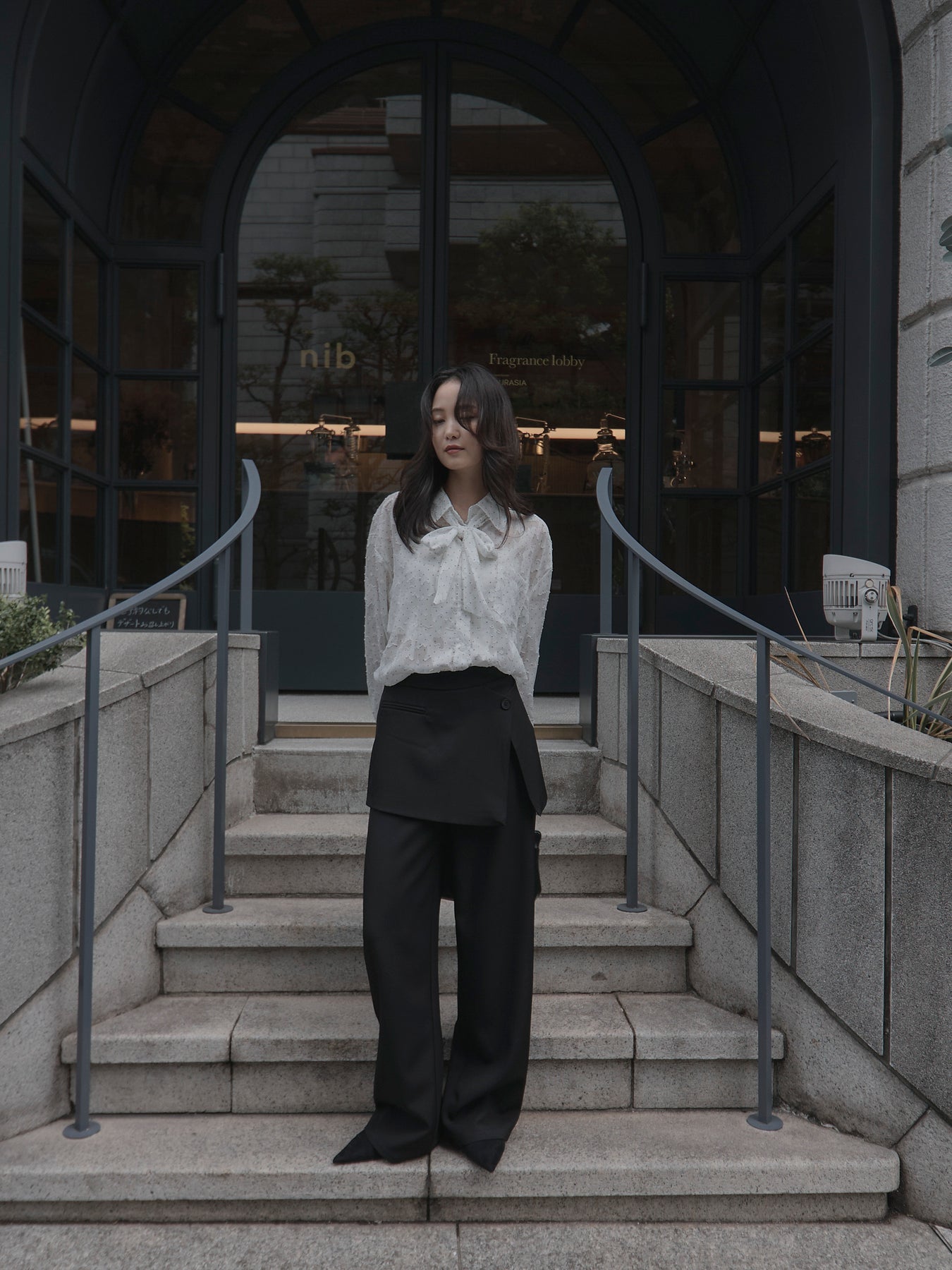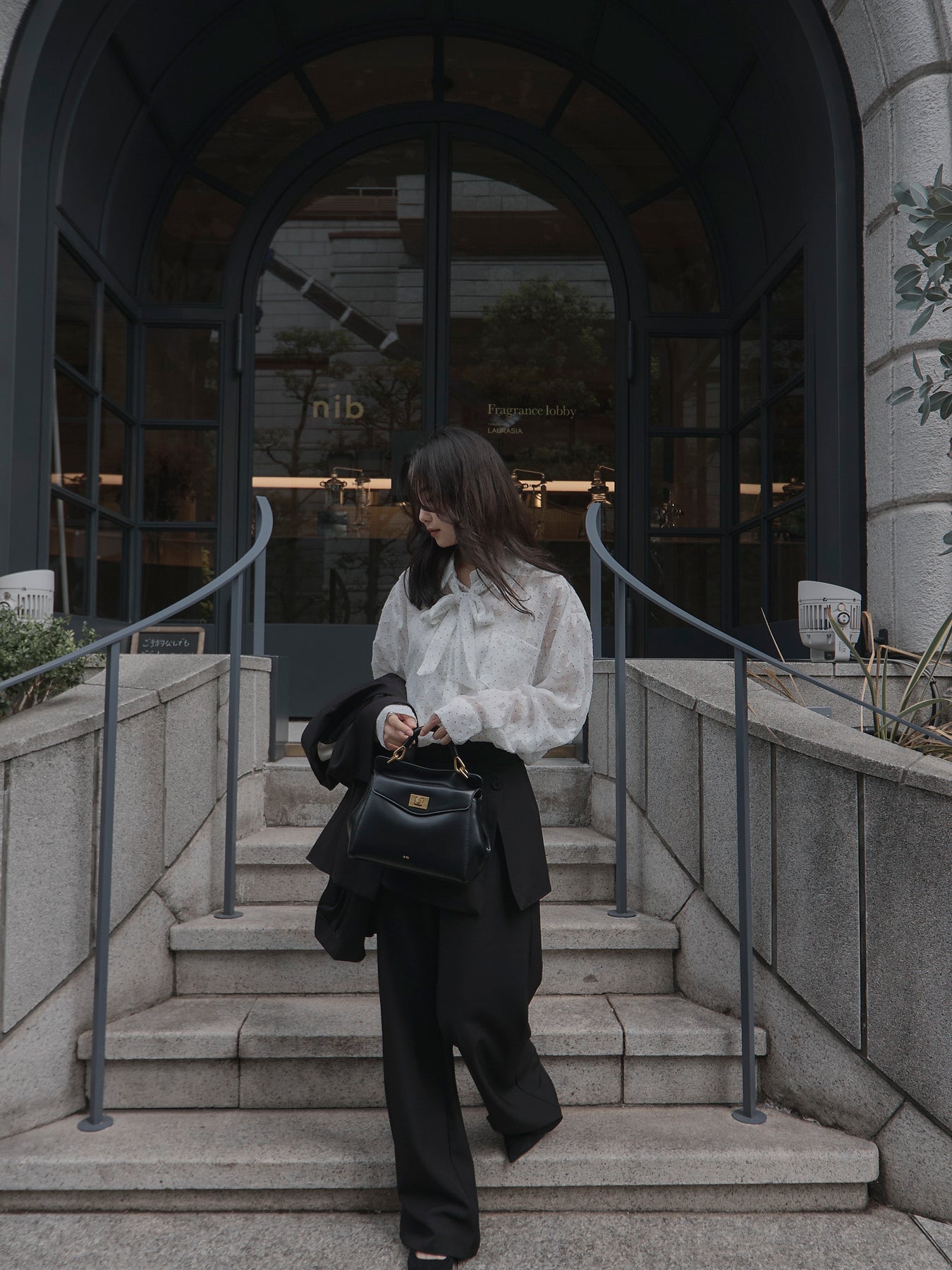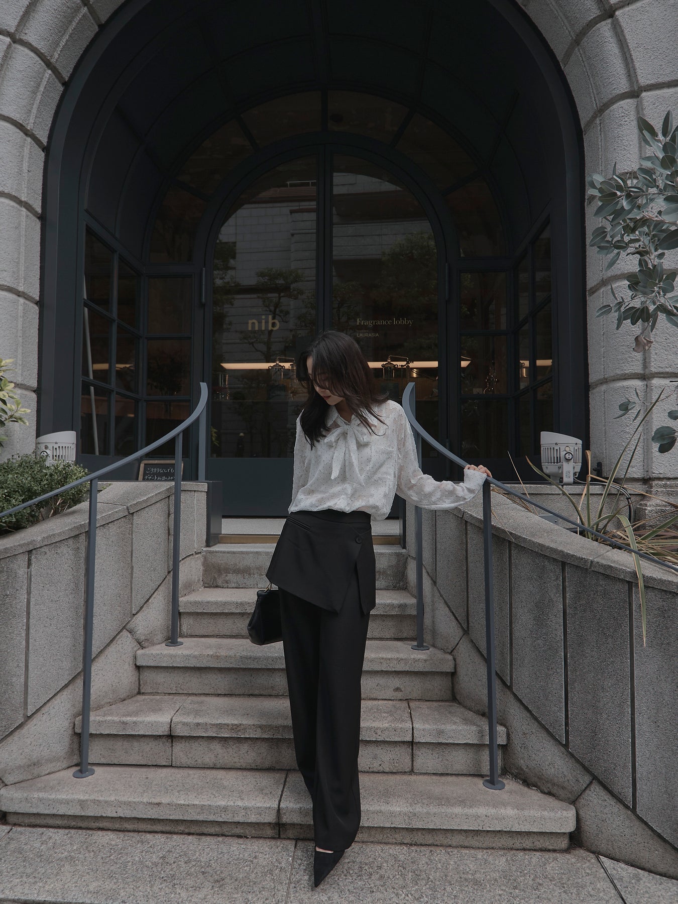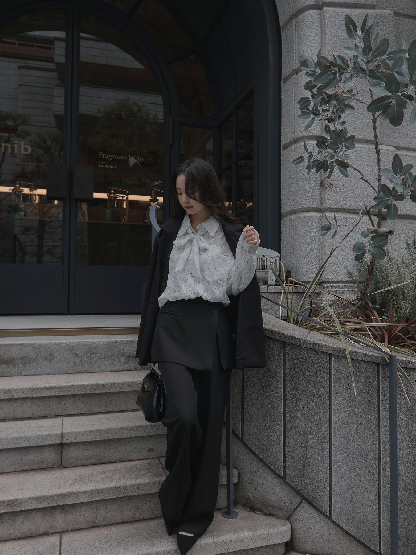 美しいシアージャガード素材にドット柄を合わせたボウタイシャツデザイン。リボンなしで着ていただくのもシンプルでおすすめです。透け感のあるアイテムなので同色のインナーを合わせていただくと綺麗に纏まります。秋だけでなく春先にも活躍するアイテムです。