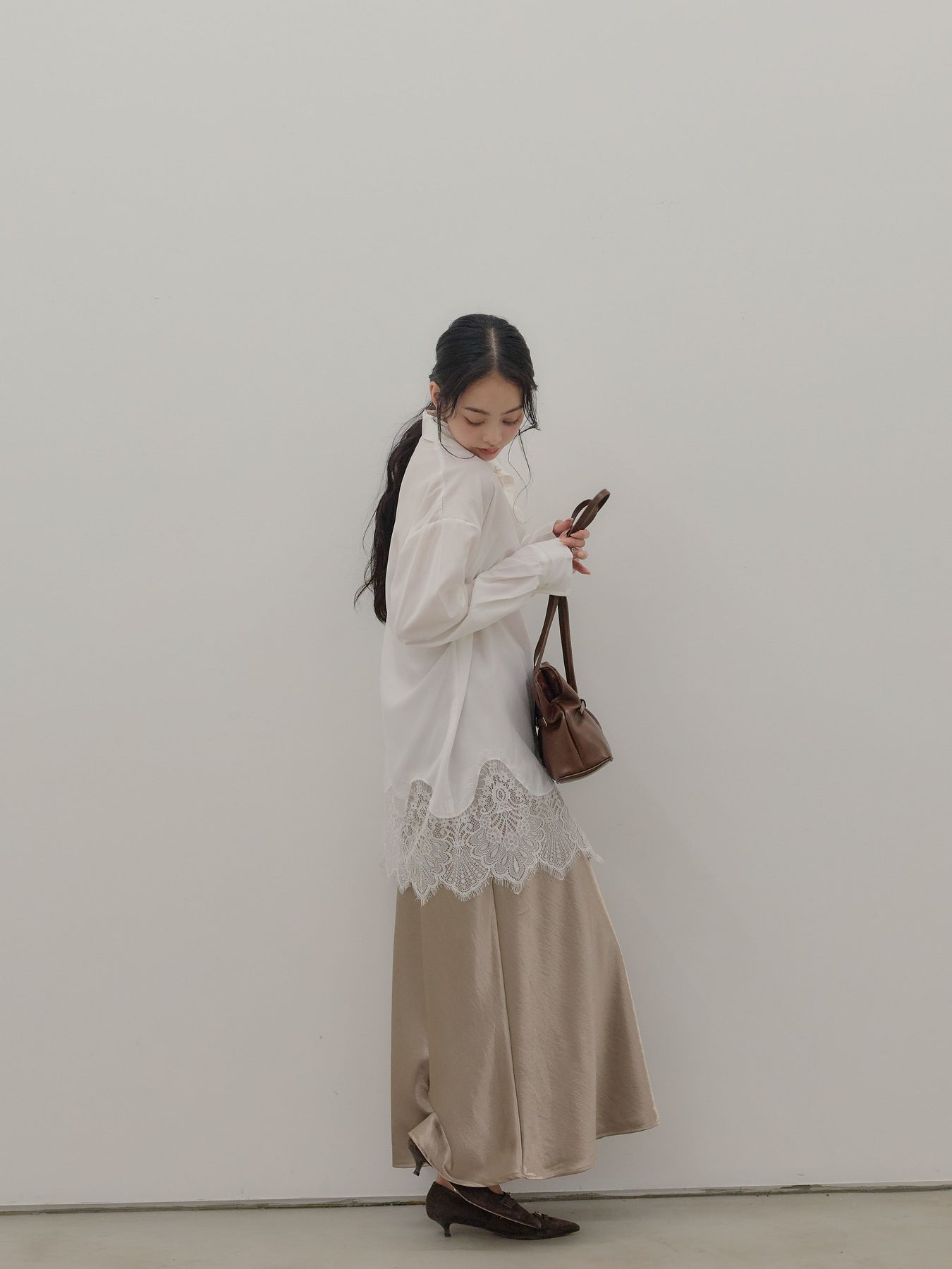 裾にあしらったレースとグロッシーな艶感ある素材でセンシュアルなムードをプラスしてくれる1着。