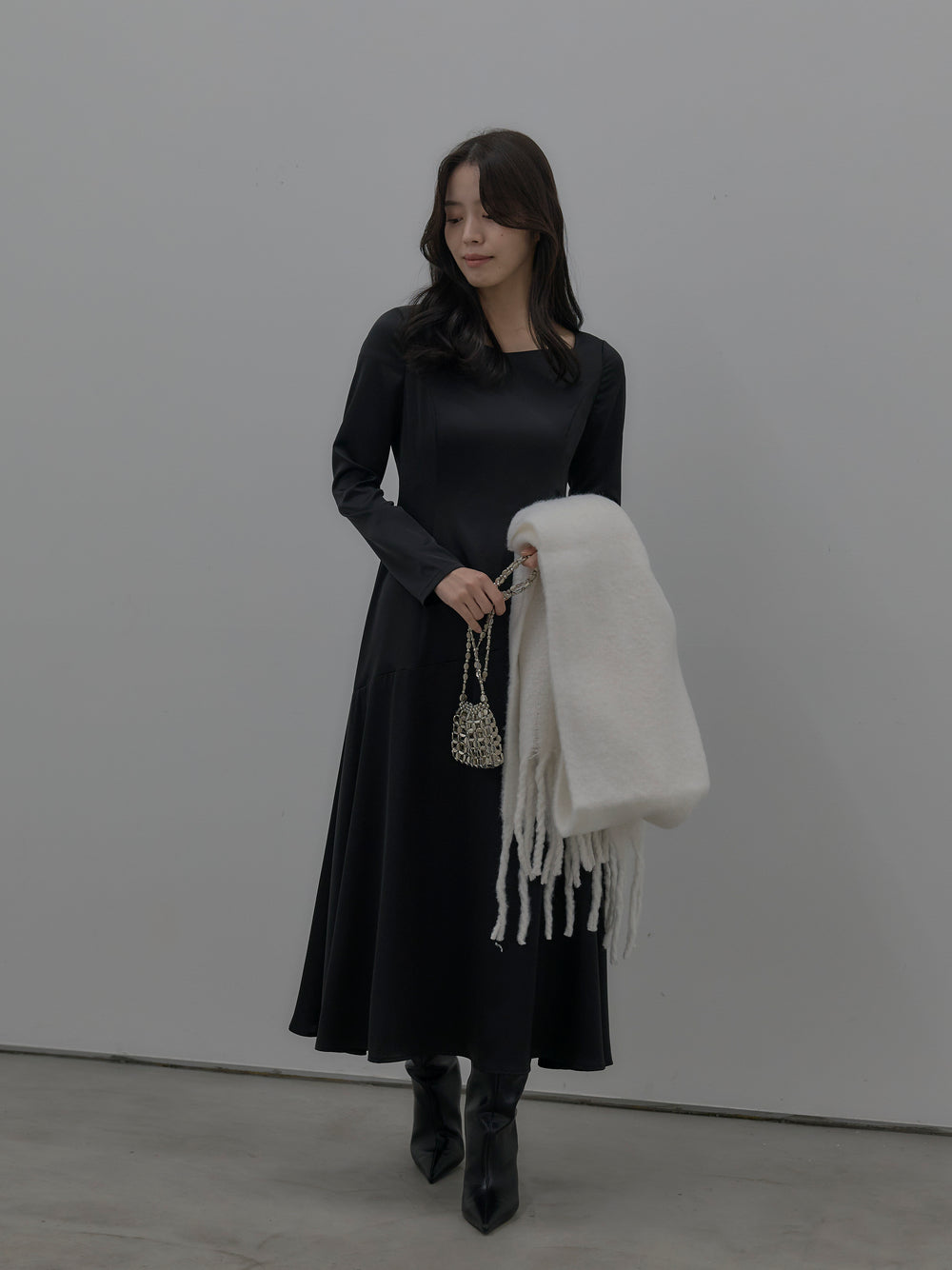 【モデル着用サイズ:BLACK/S】胸元のハートネックがデコルテ周りを綺麗に見せてくれます。リッチなサテン生地でおつくりしました。ウエスト周りは絞られていて美しいシルエットになるように設計。オケージョンシーンにもおすすめのワンピースです。