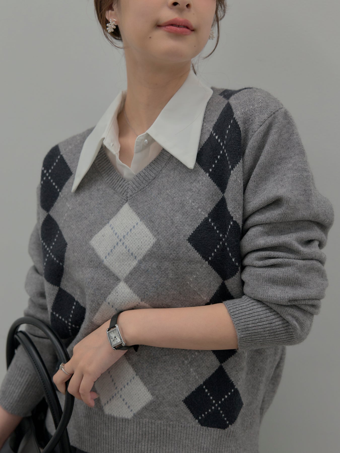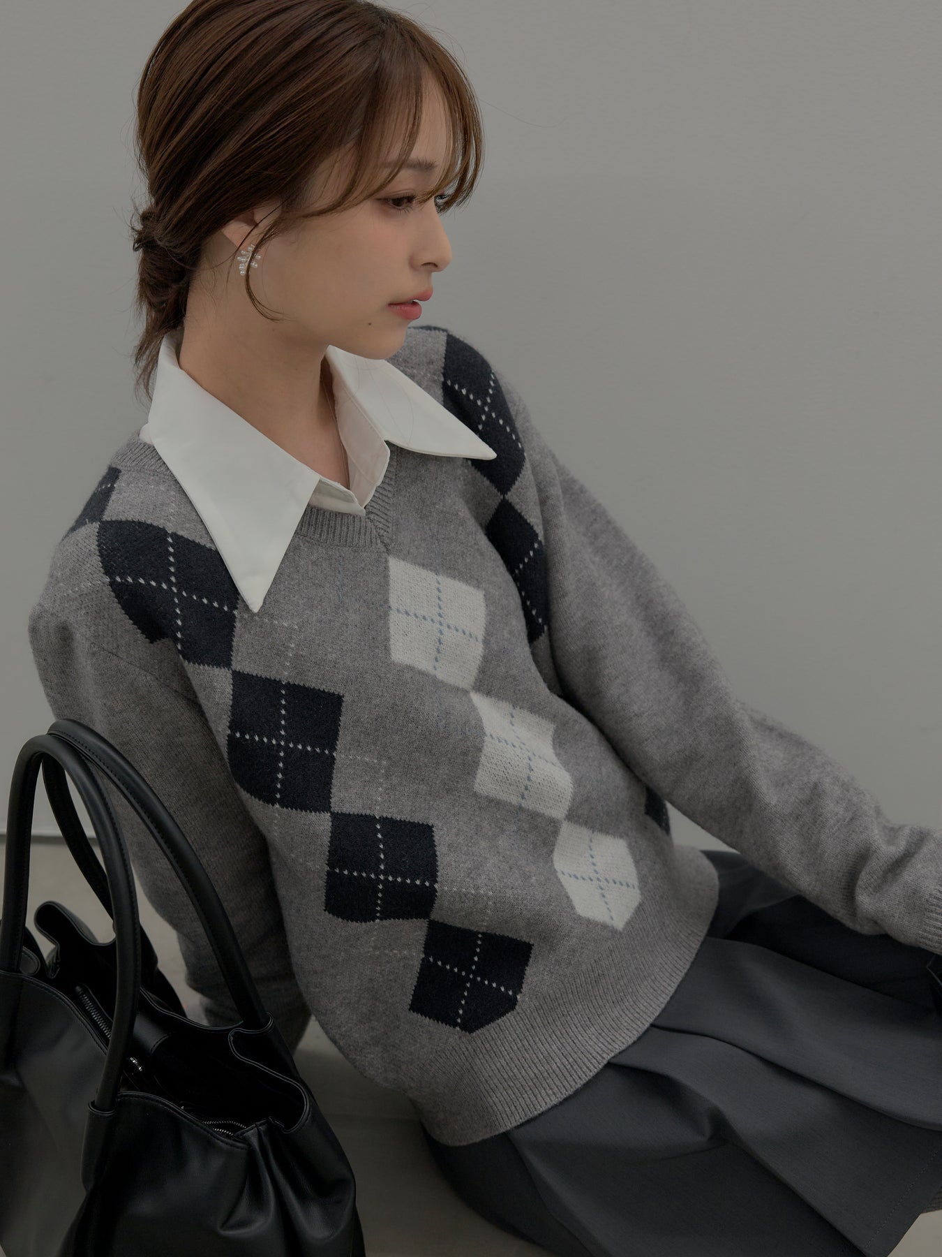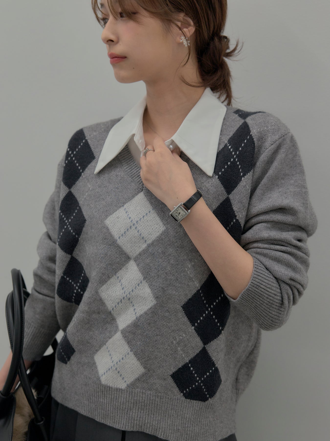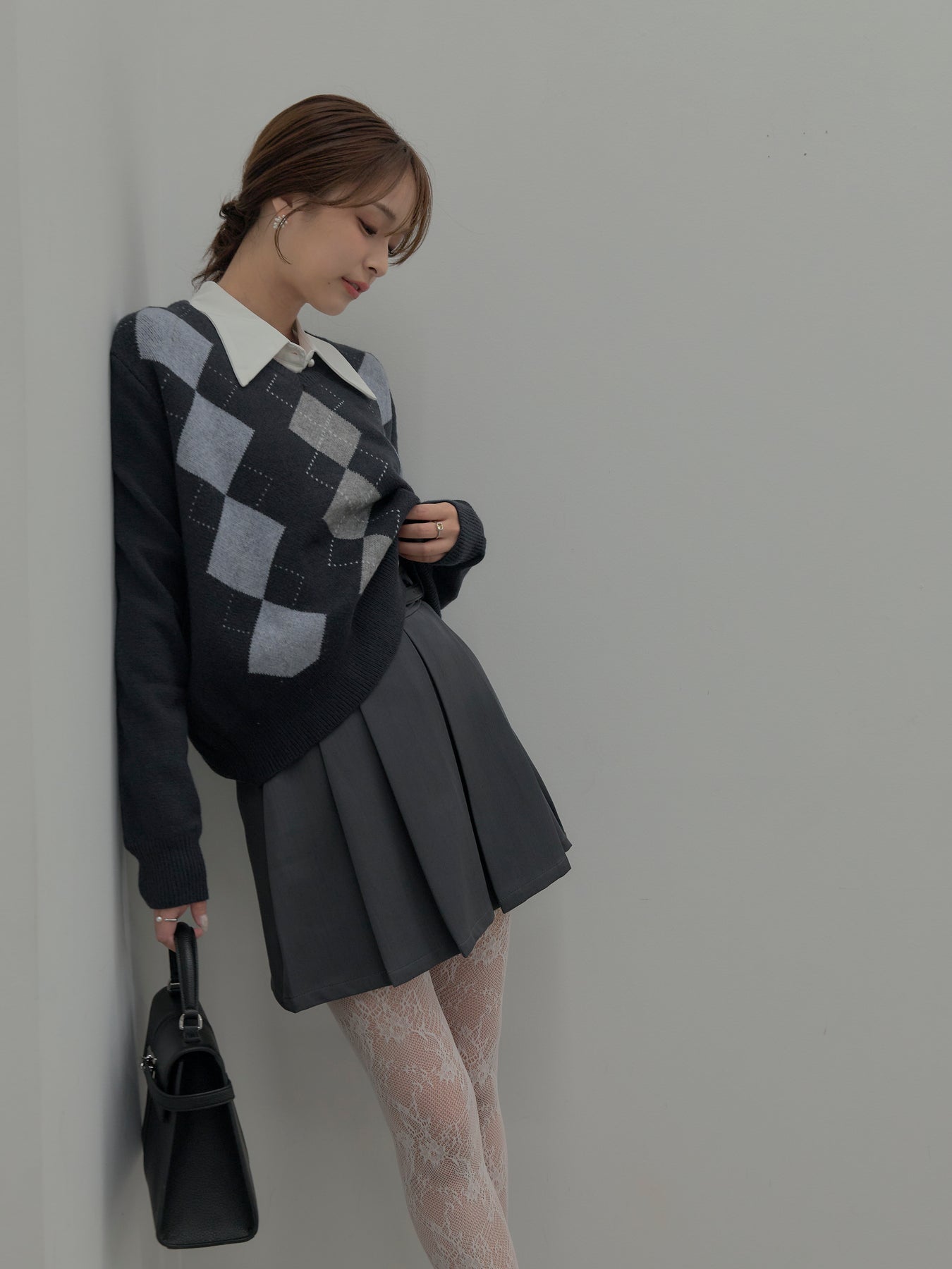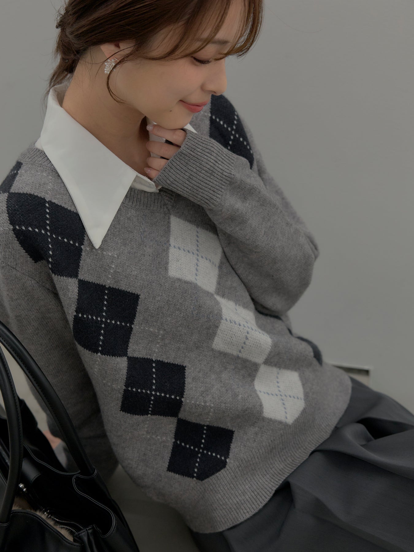 ベーシックカラーの配色がデイリーコーデに馴染みやすいアーガイル柄のプルオーバー。程よくゆとりのあるシルエットでスタイリングしやすいサイズ感です。中にサテンシャツを仕込んで大人のスクールガールテイストに仕上げるのがnairoのおすすめスタイル。ミニスカートだけでなくお手持ちのパンツやスカートにも合わせやすいです。