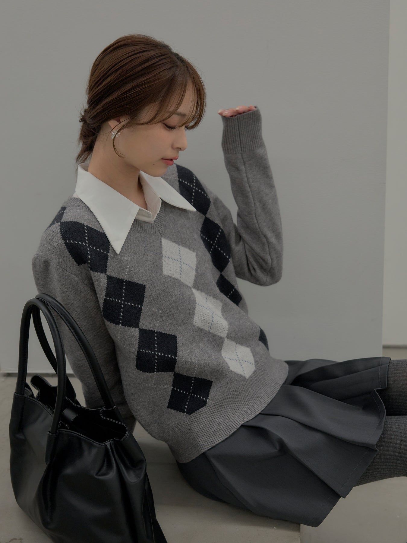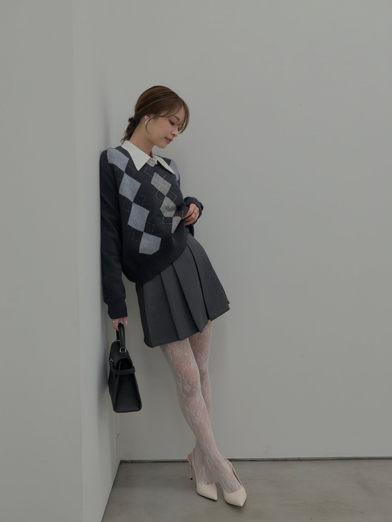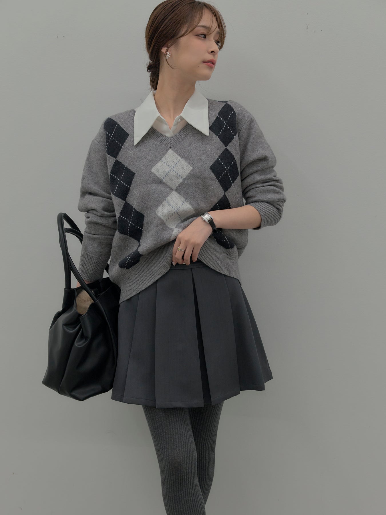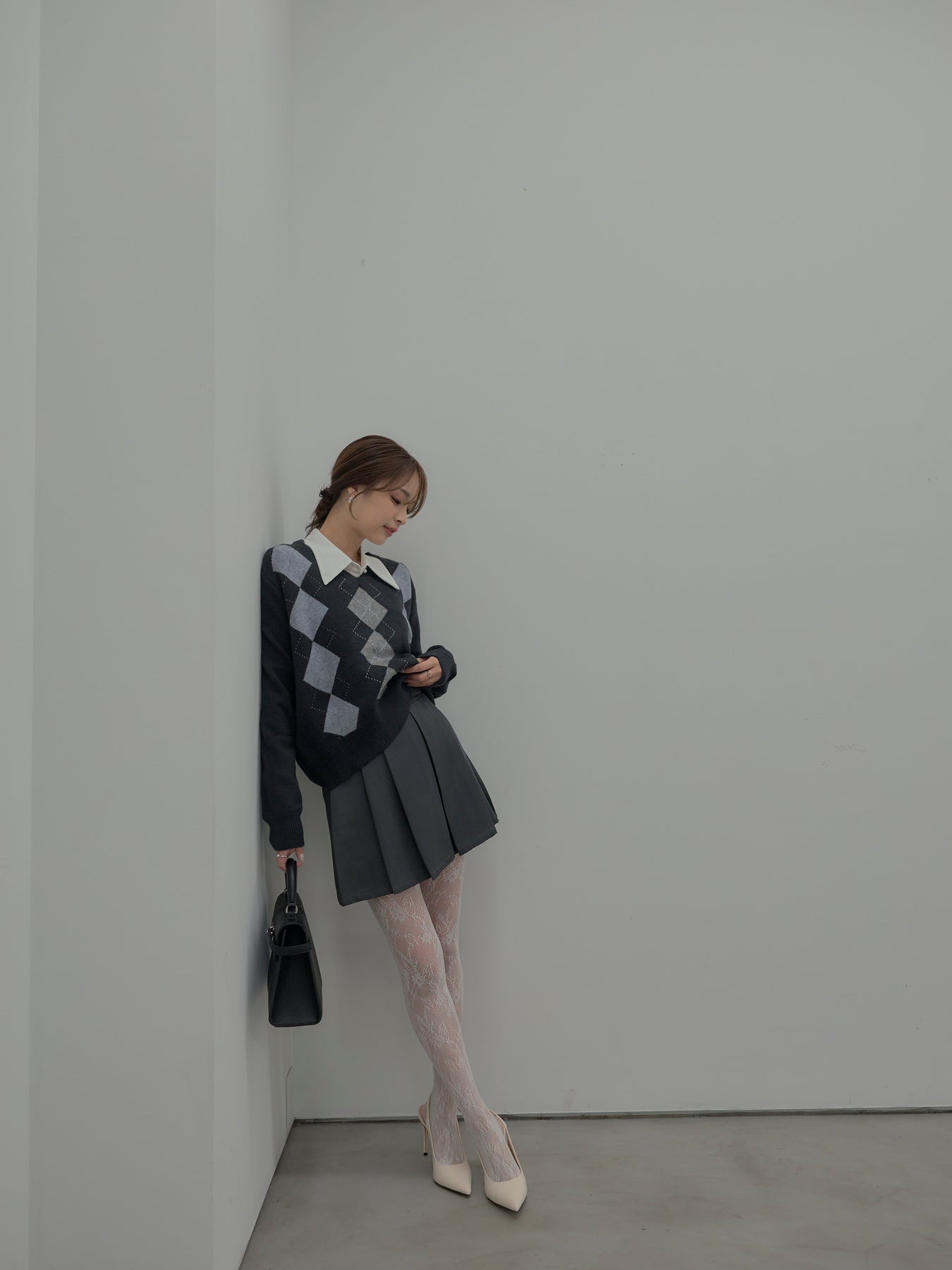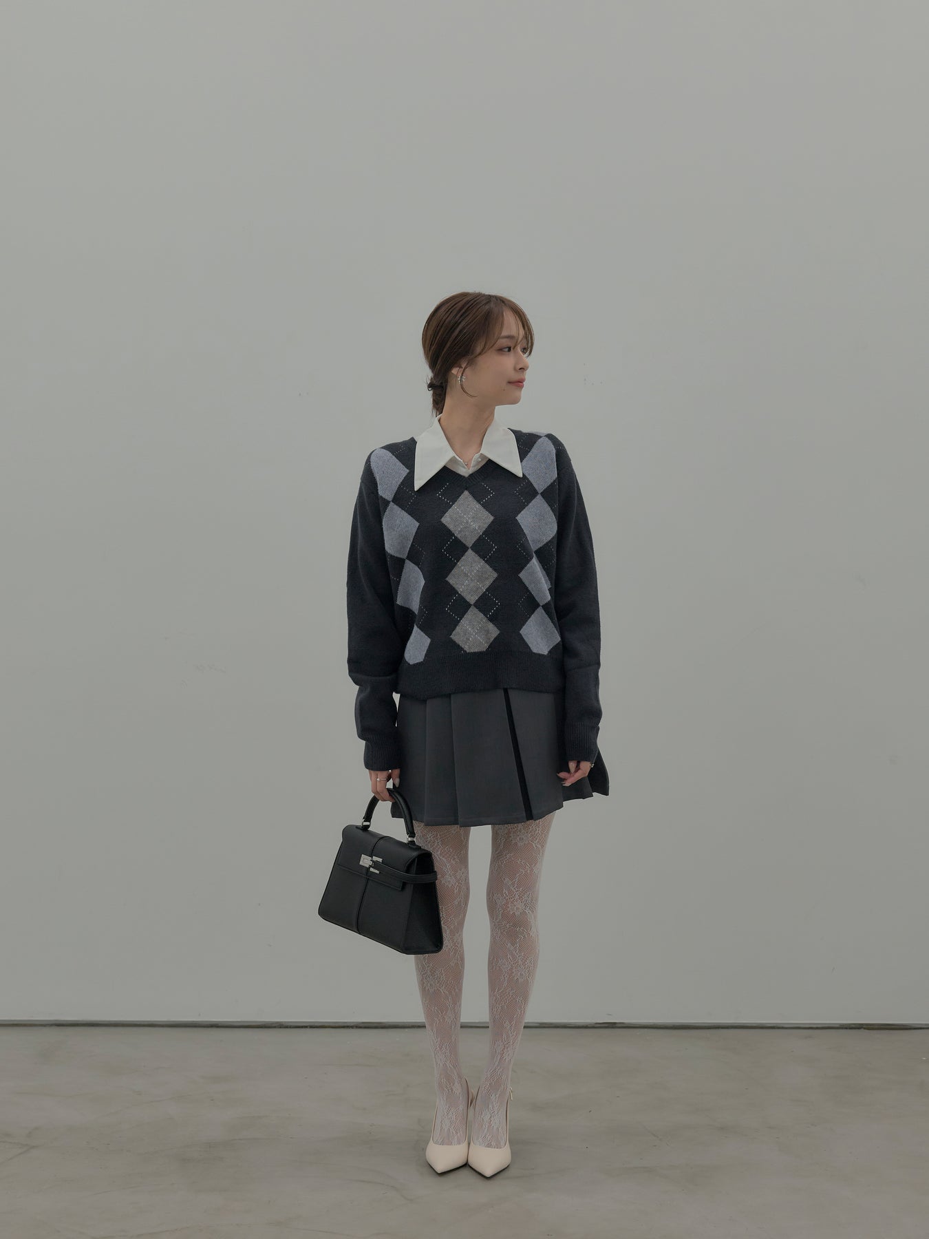 ベーシックカラーの配色がデイリーコーデに馴染みやすいアーガイル柄のプルオーバー。程よくゆとりのあるシルエットでスタイリングしやすいサイズ感です。中にサテンシャツを仕込んで大人のスクールガールテイストに仕上げるのがnairoのおすすめスタイル。ミニスカートだけでなくお手持ちのパンツやスカートにも合わせやすいです。