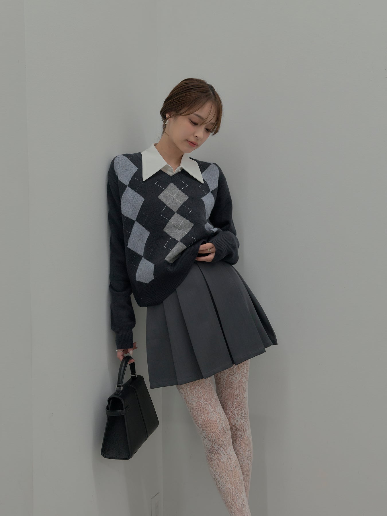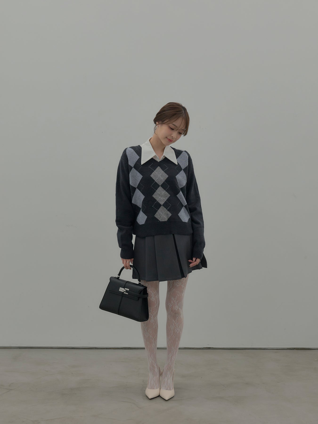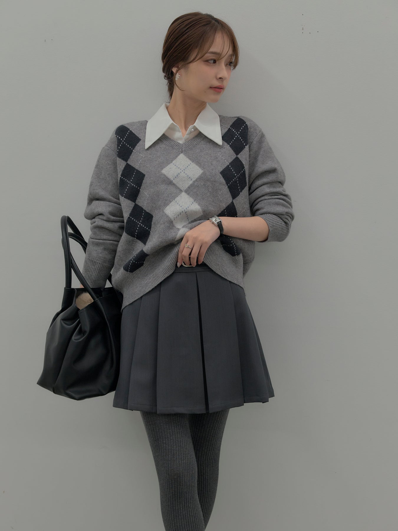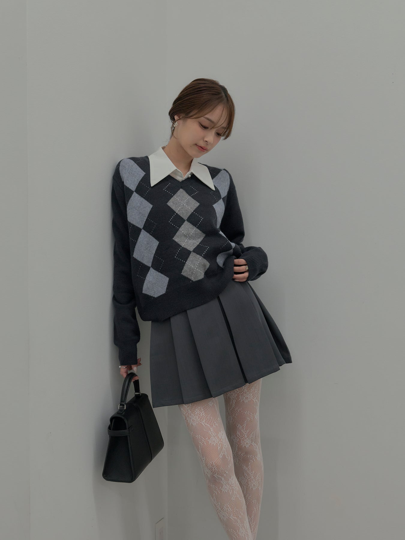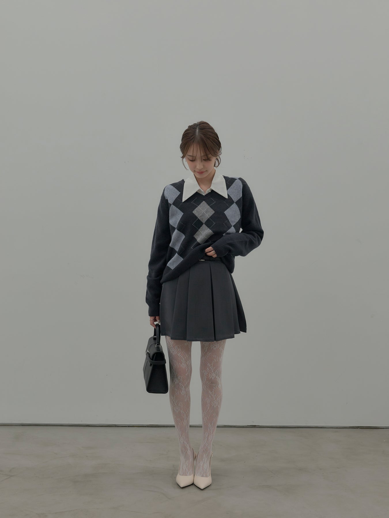 ベーシックカラーの配色がデイリーコーデに馴染みやすいアーガイル柄のプルオーバー。程よくゆとりのあるシルエットでスタイリングしやすいサイズ感です。中にサテンシャツを仕込んで大人のスクールガールテイストに仕上げるのがnairoのおすすめスタイル。ミニスカートだけでなくお手持ちのパンツやスカートにも合わせやすいです。