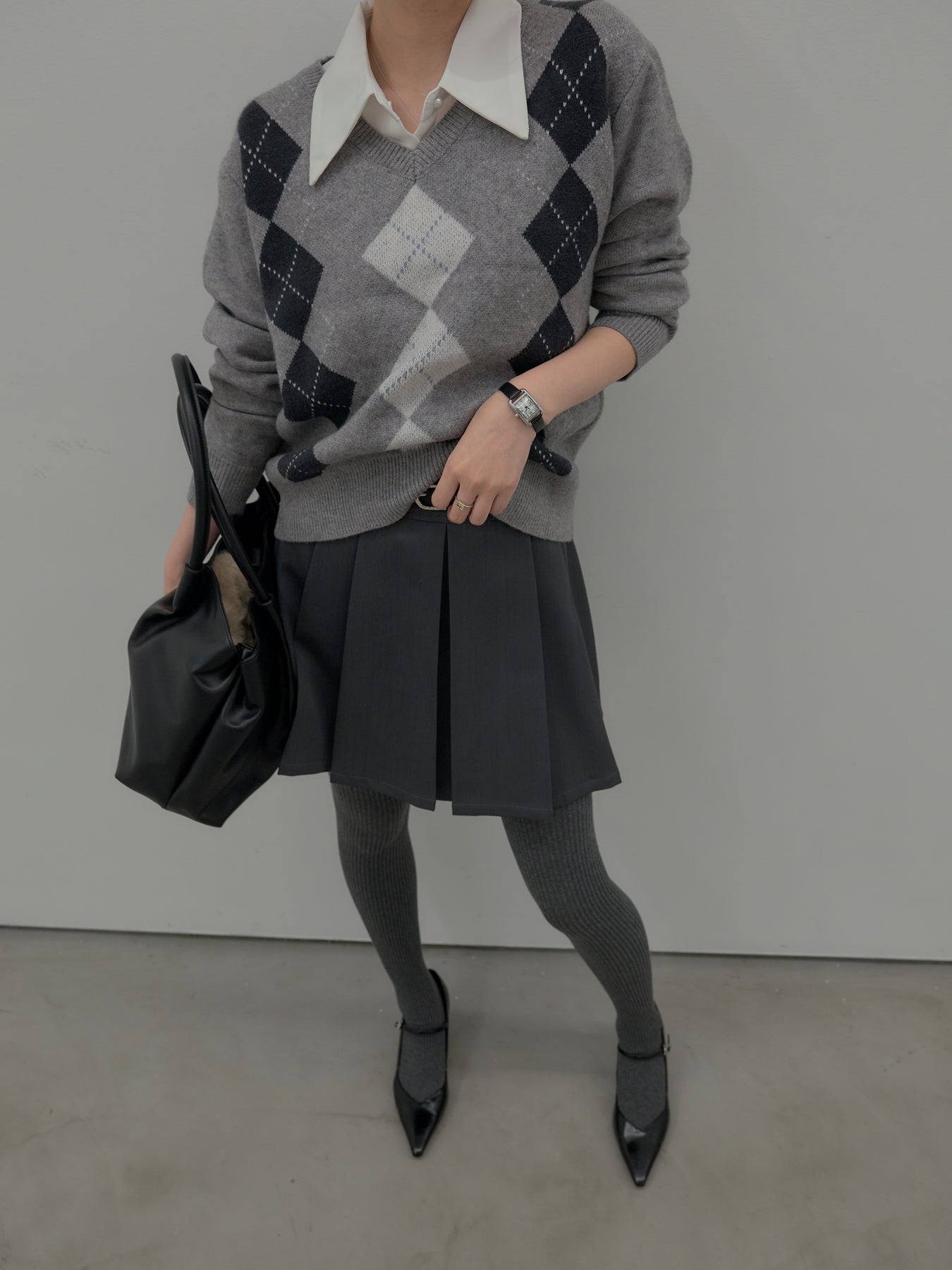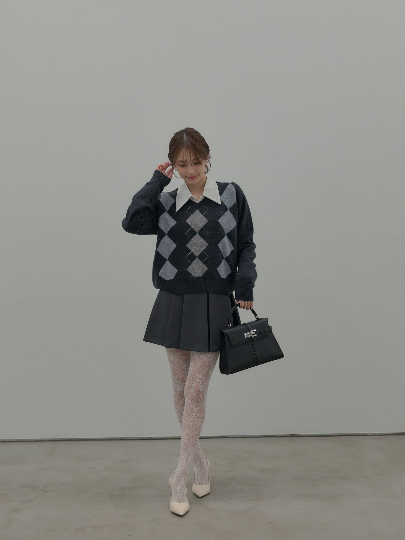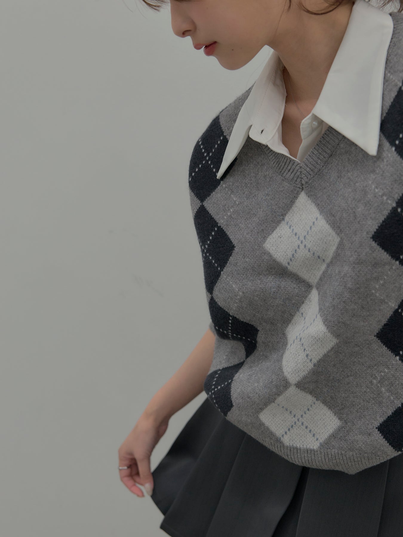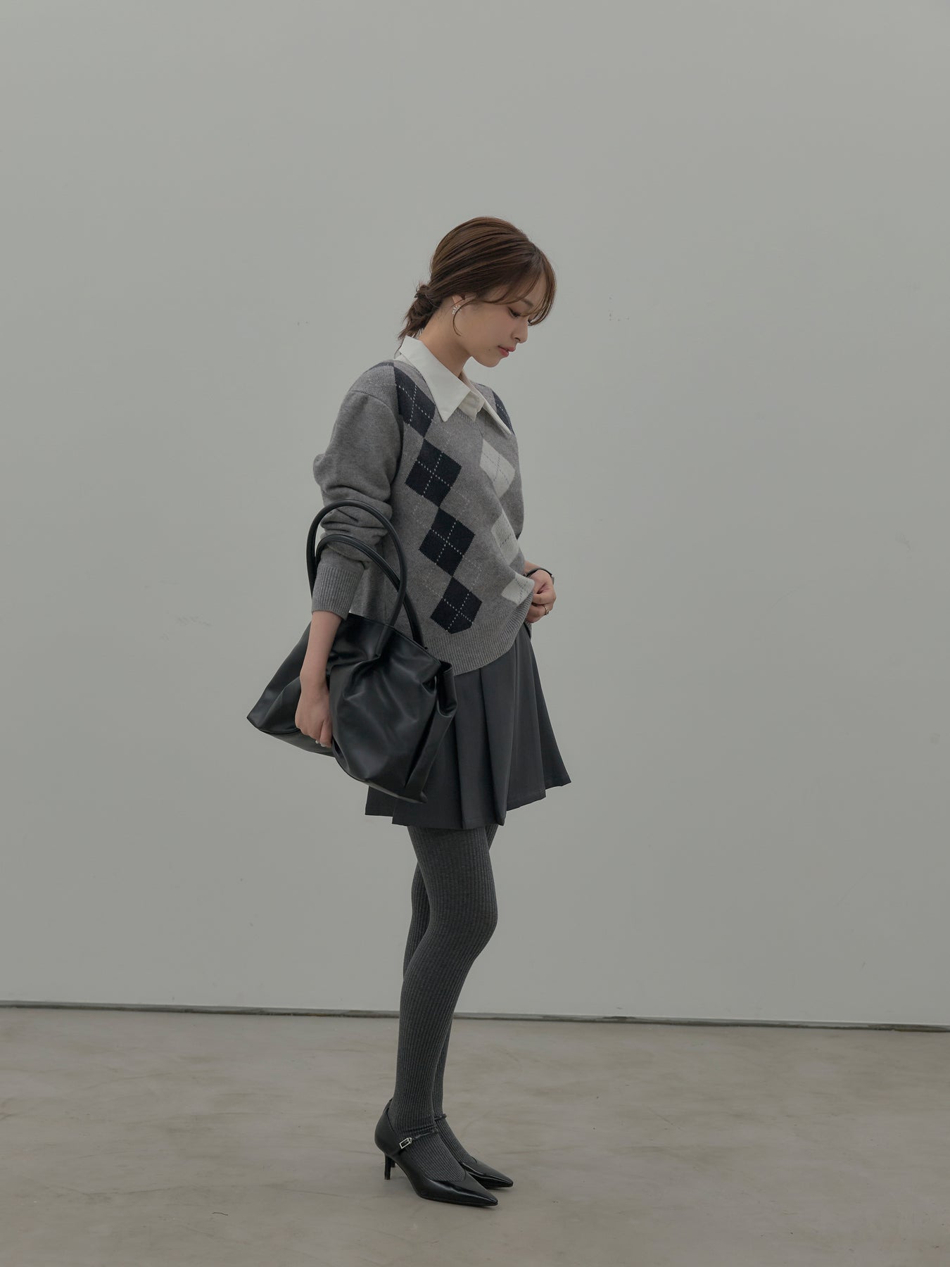 ベーシックカラーの配色がデイリーコーデに馴染みやすいアーガイル柄のプルオーバー。程よくゆとりのあるシルエットでスタイリングしやすいサイズ感です。中にサテンシャツを仕込んで大人のスクールガールテイストに仕上げるのがnairoのおすすめスタイル。ミニスカートだけでなくお手持ちのパンツやスカートにも合わせやすいです。