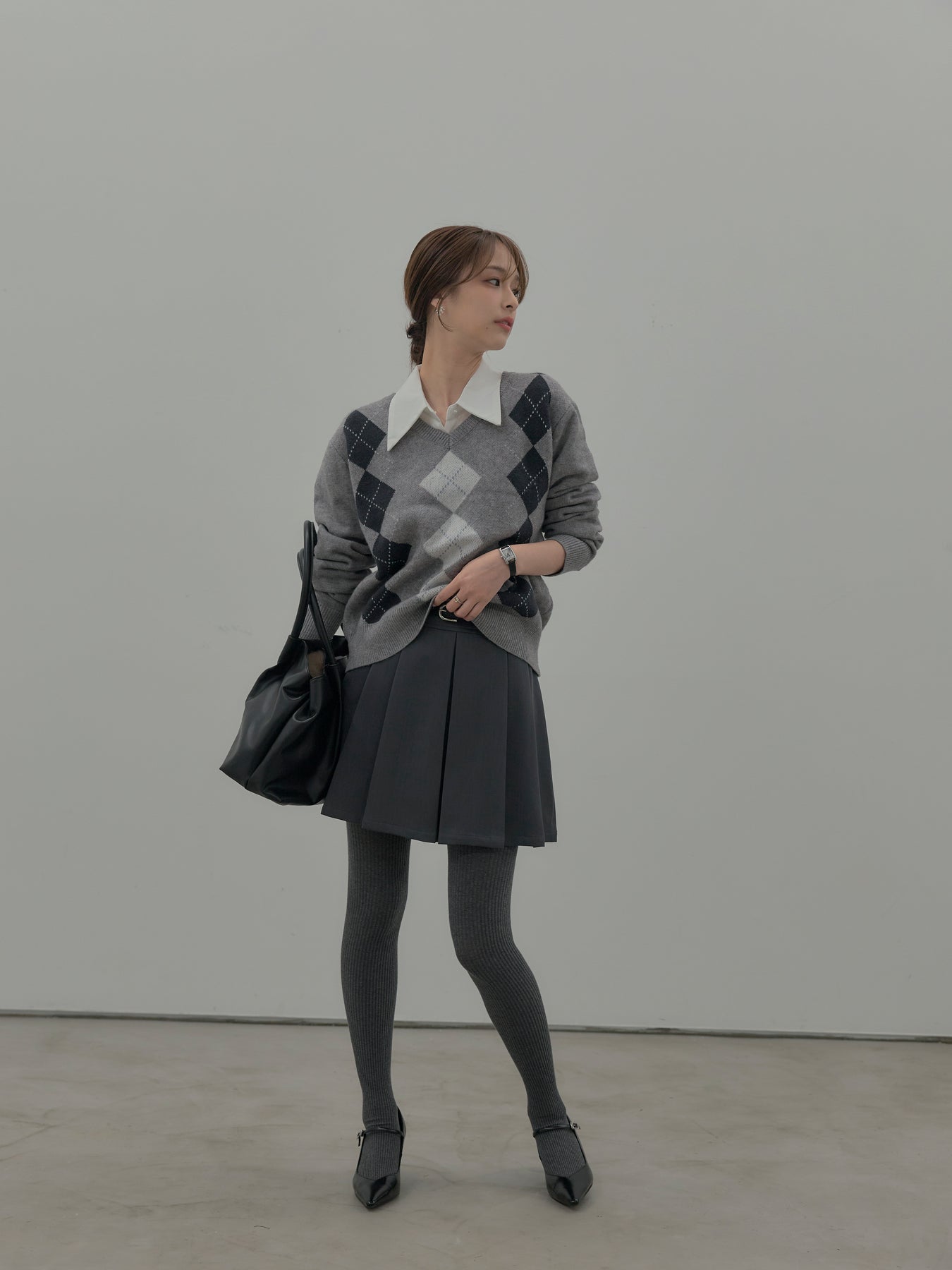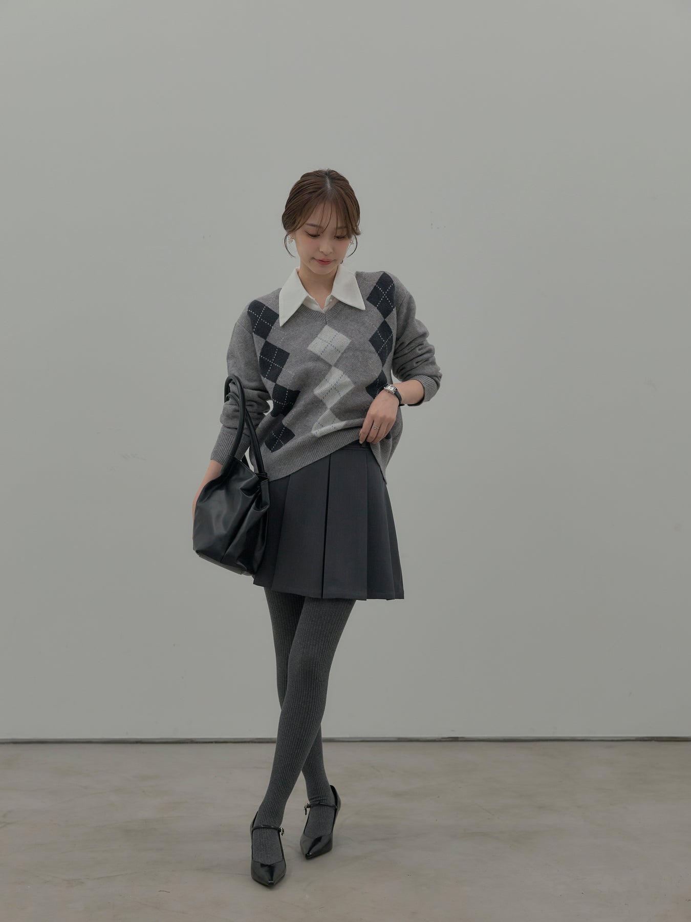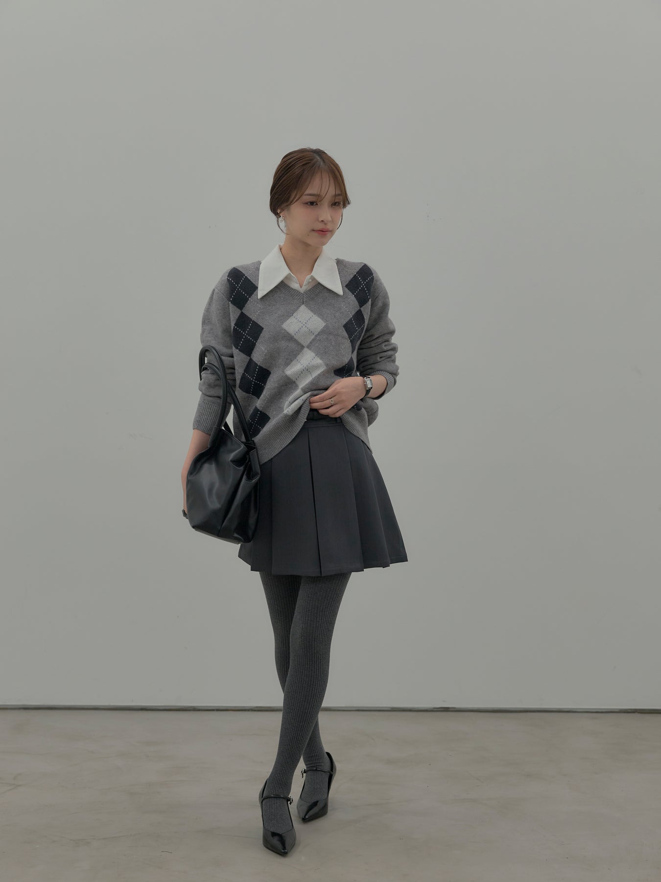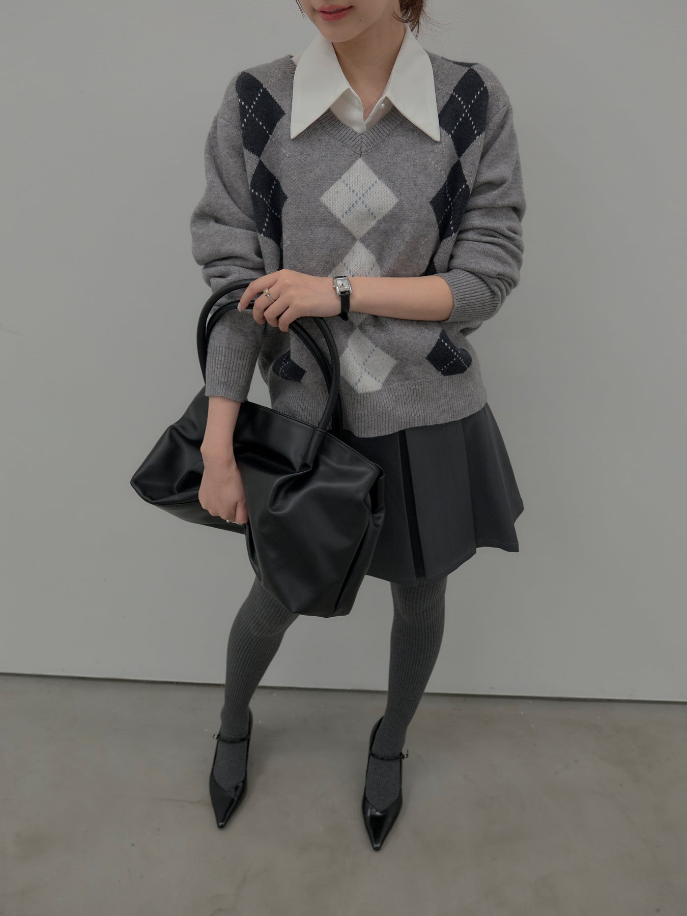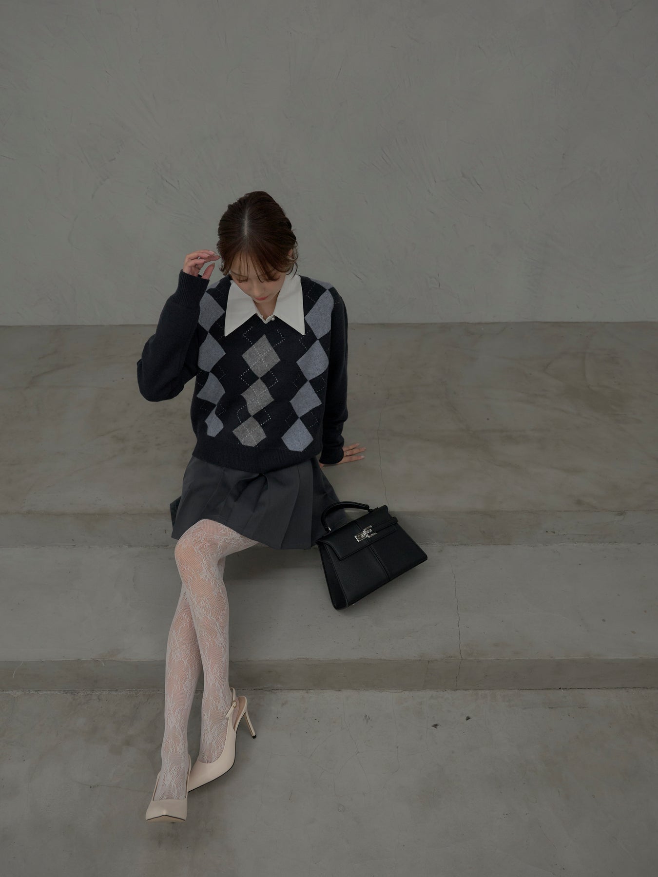 ベーシックカラーの配色がデイリーコーデに馴染みやすいアーガイル柄のプルオーバー。程よくゆとりのあるシルエットでスタイリングしやすいサイズ感です。中にサテンシャツを仕込んで大人のスクールガールテイストに仕上げるのがnairoのおすすめスタイル。ミニスカートだけでなくお手持ちのパンツやスカートにも合わせやすいです。