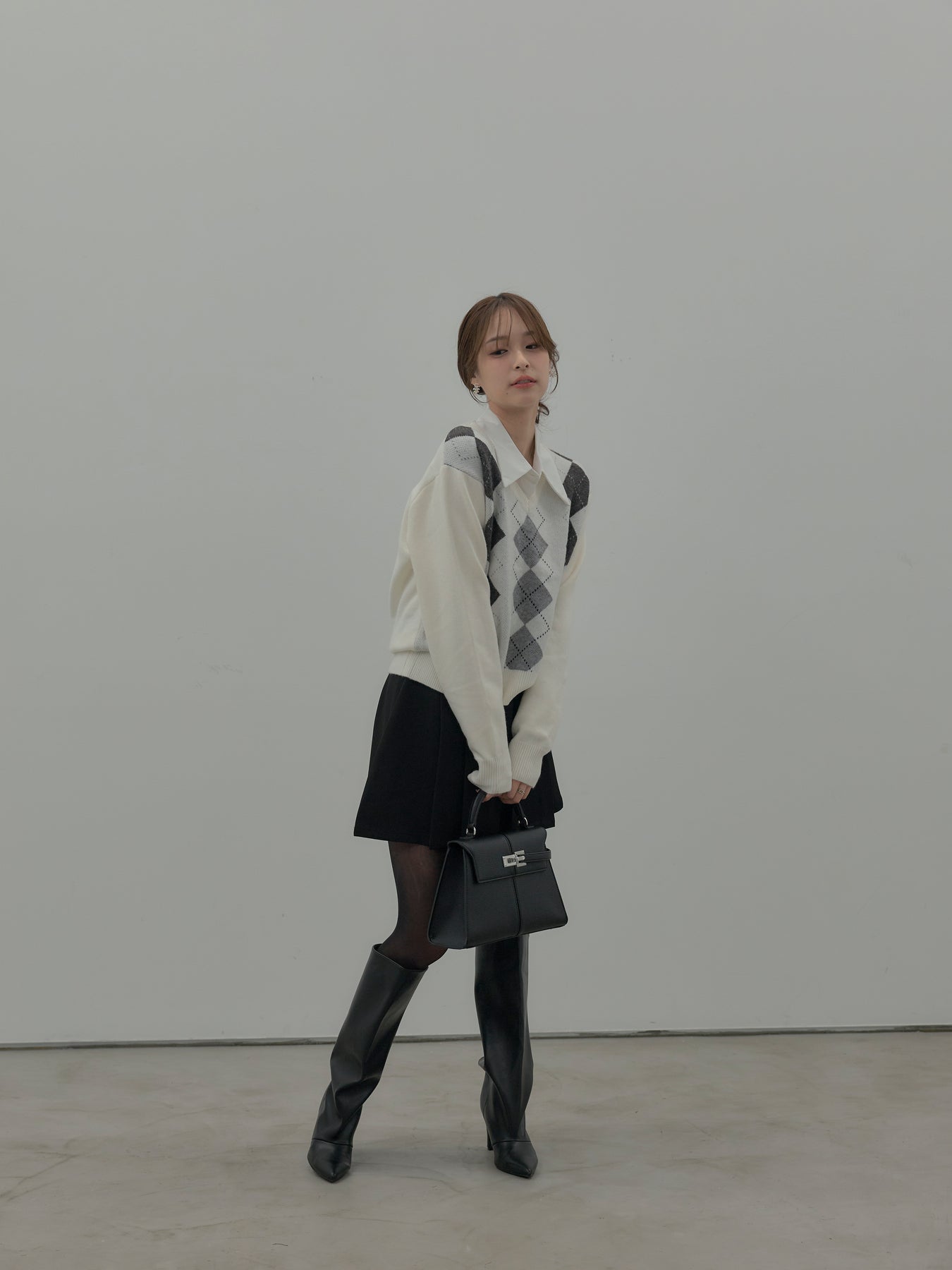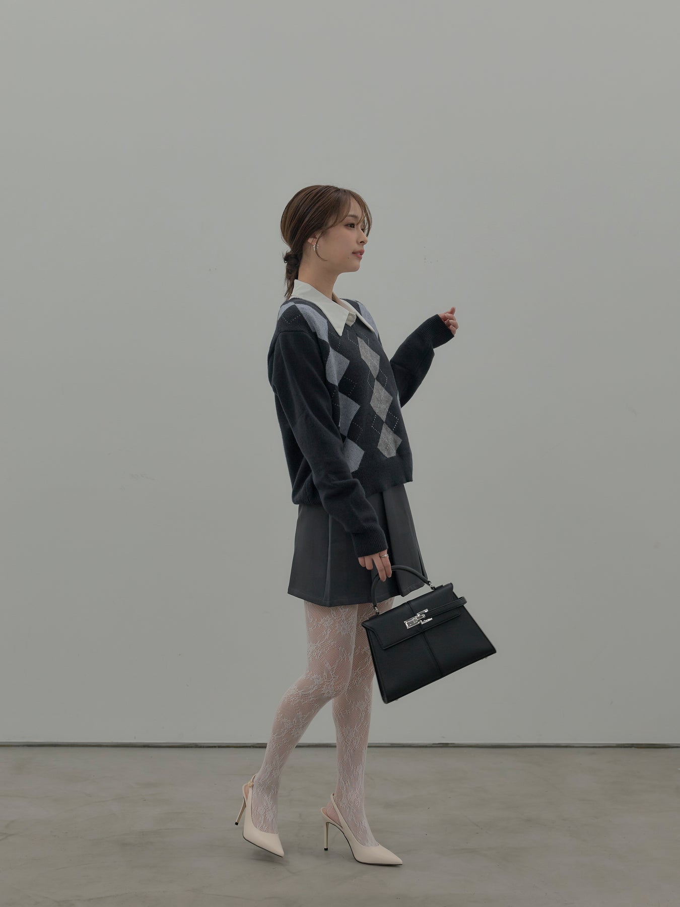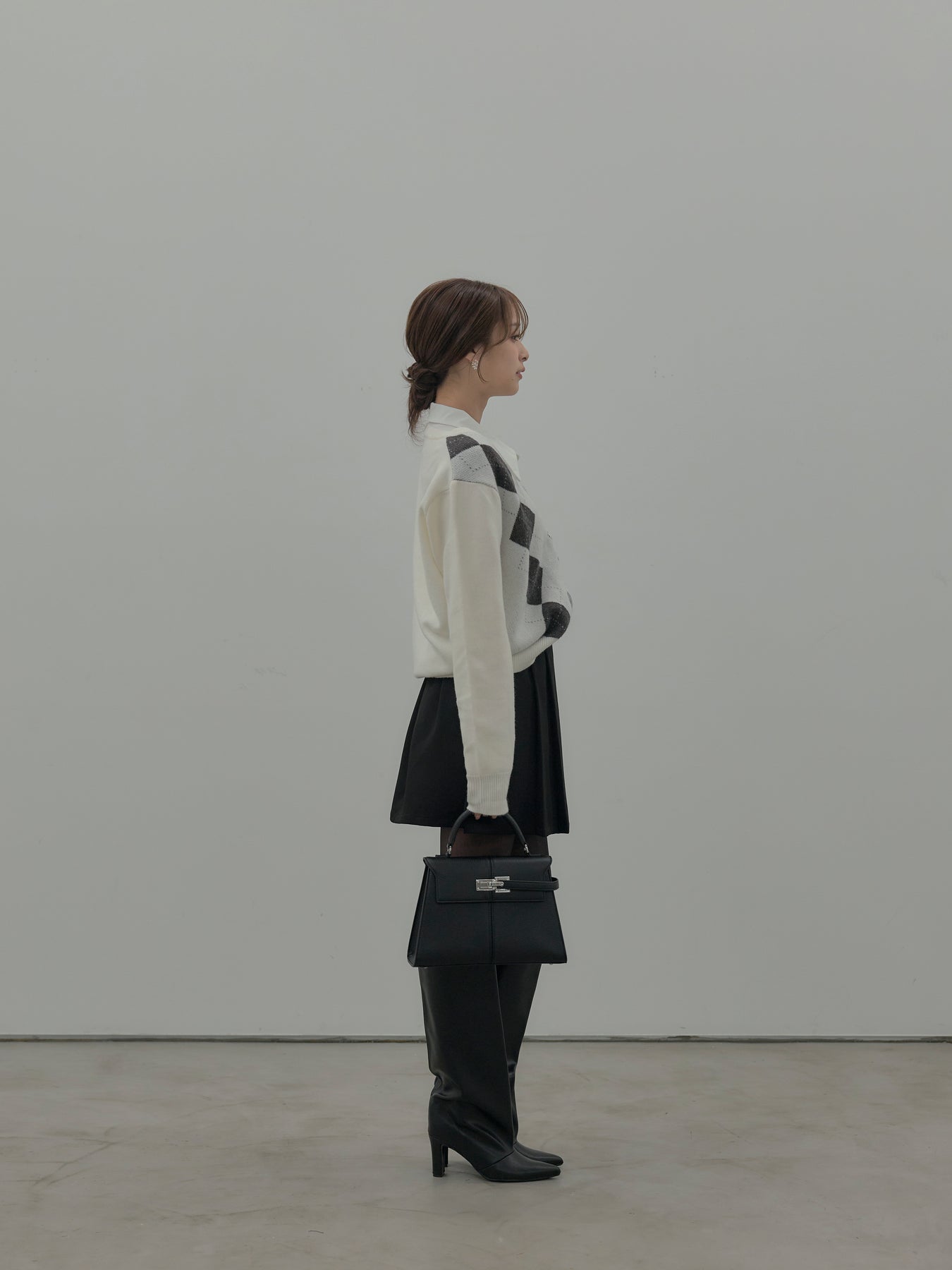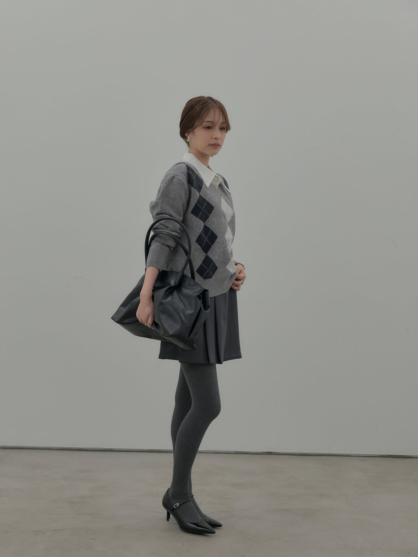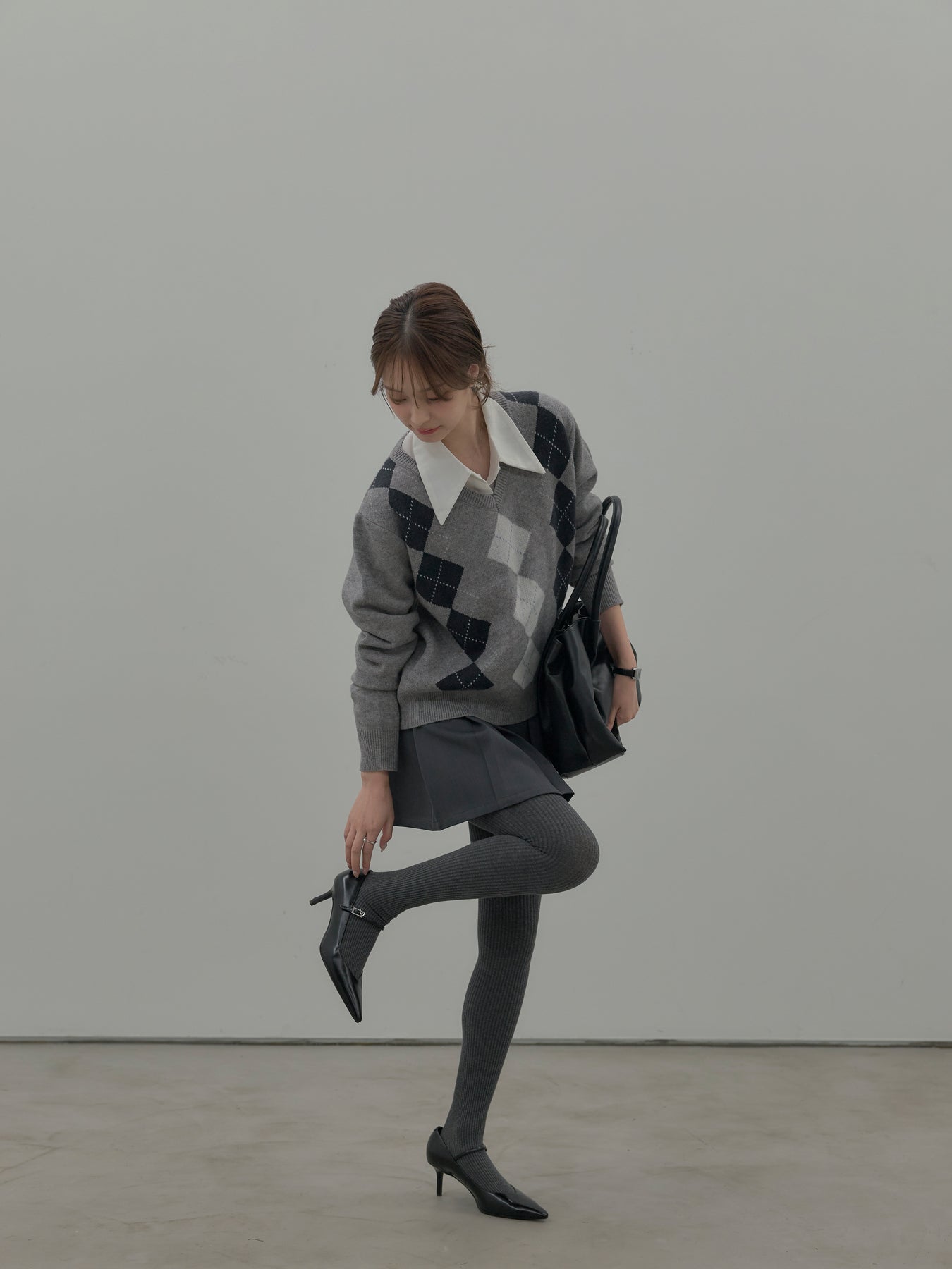 ベーシックカラーの配色がデイリーコーデに馴染みやすいアーガイル柄のプルオーバー。程よくゆとりのあるシルエットでスタイリングしやすいサイズ感です。中にサテンシャツを仕込んで大人のスクールガールテイストに仕上げるのがnairoのおすすめスタイル。ミニスカートだけでなくお手持ちのパンツやスカートにも合わせやすいです。