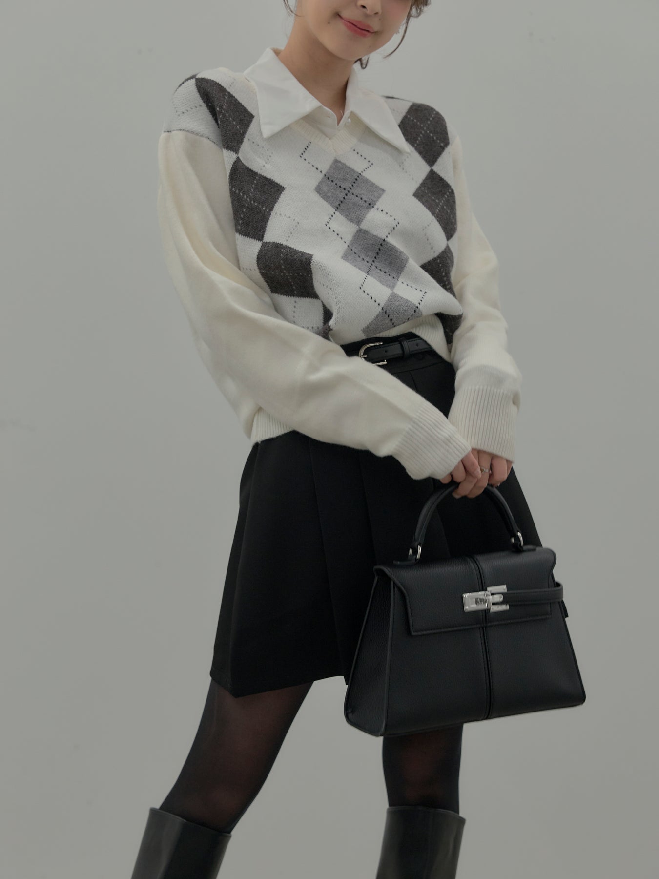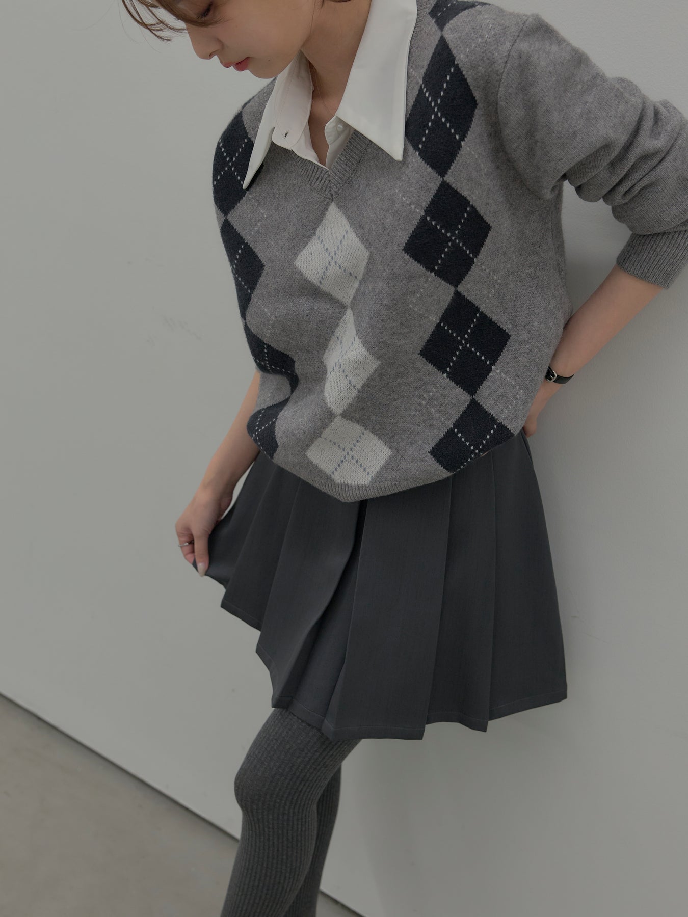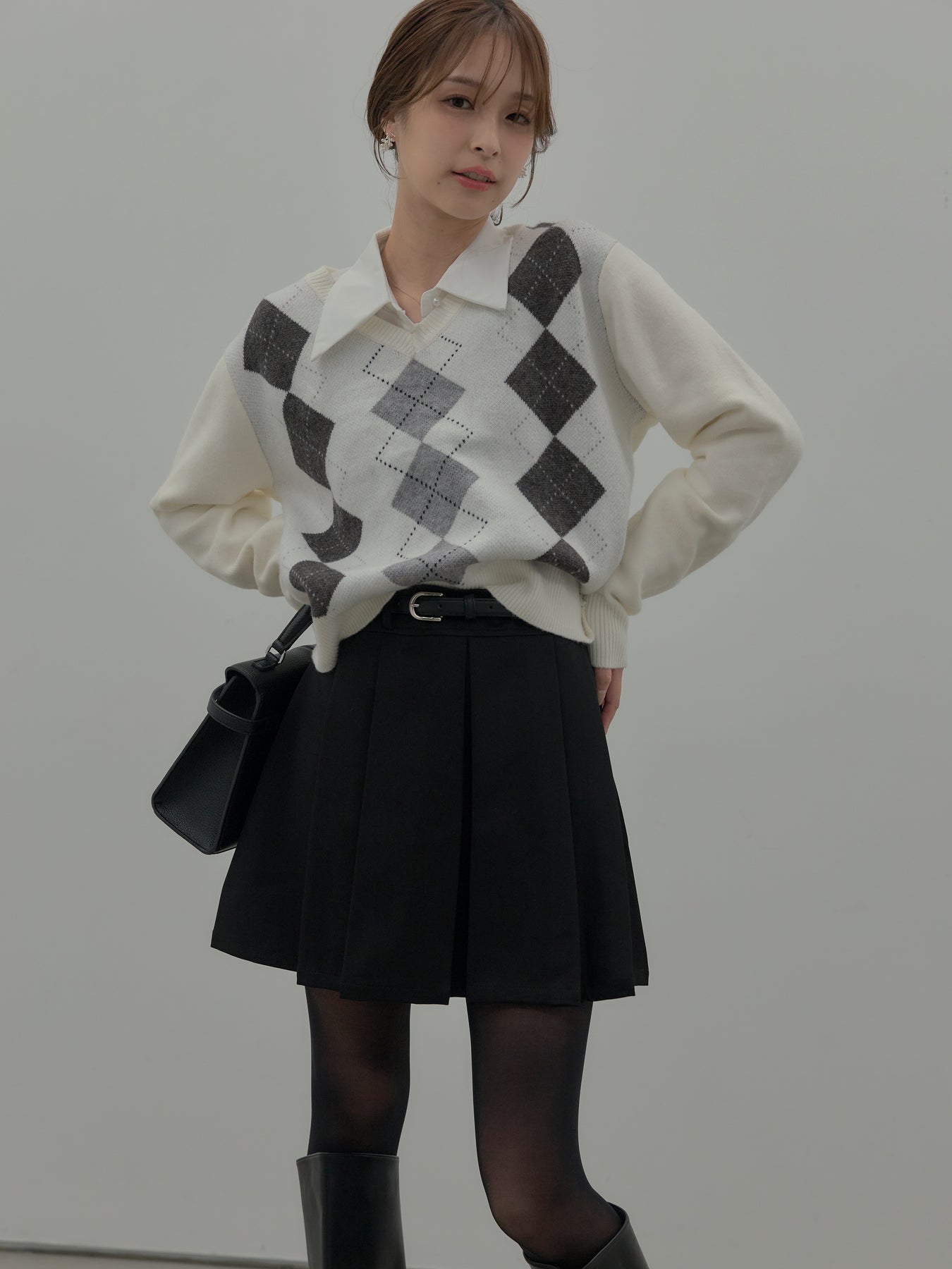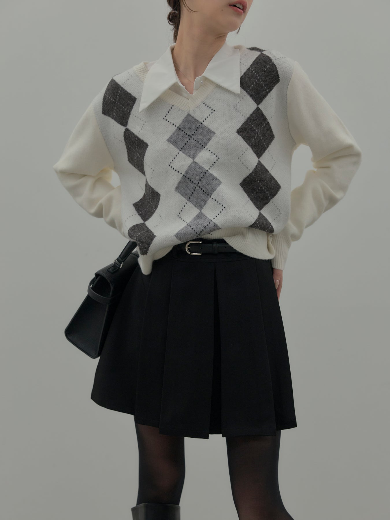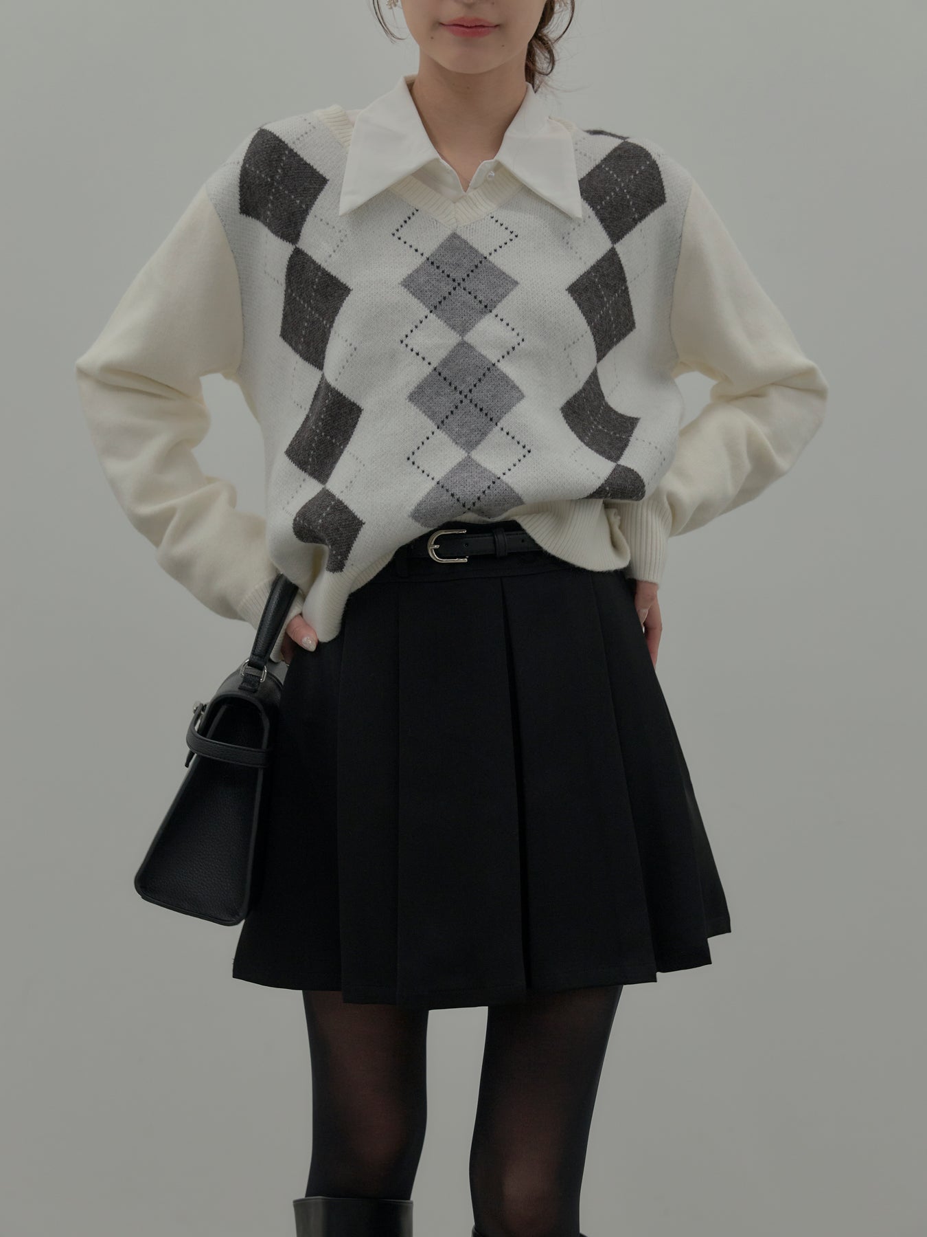 【SET】アーガイル柄Vネックニットプルオーバー+ベルト付きプリーツミニスカート(2set)