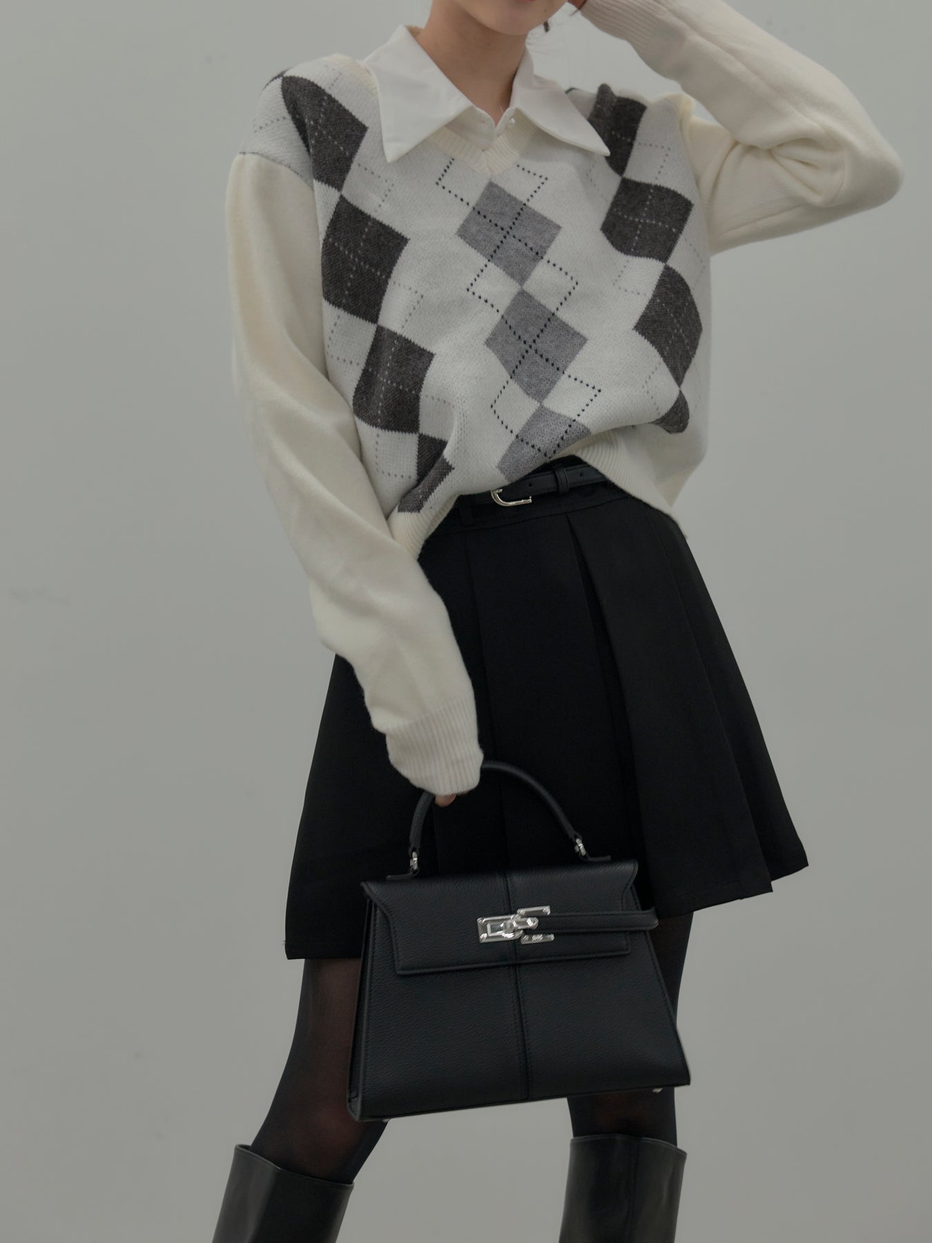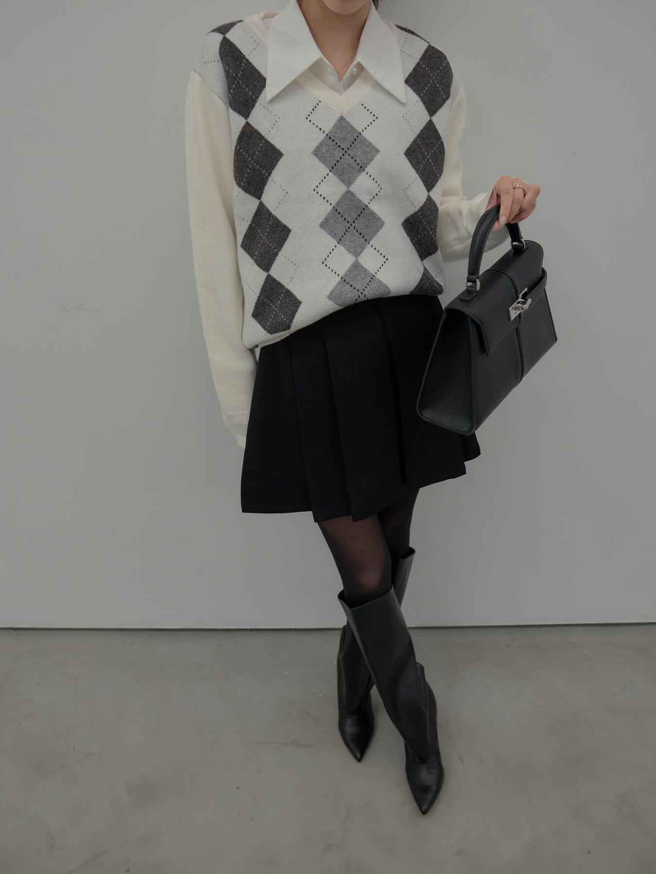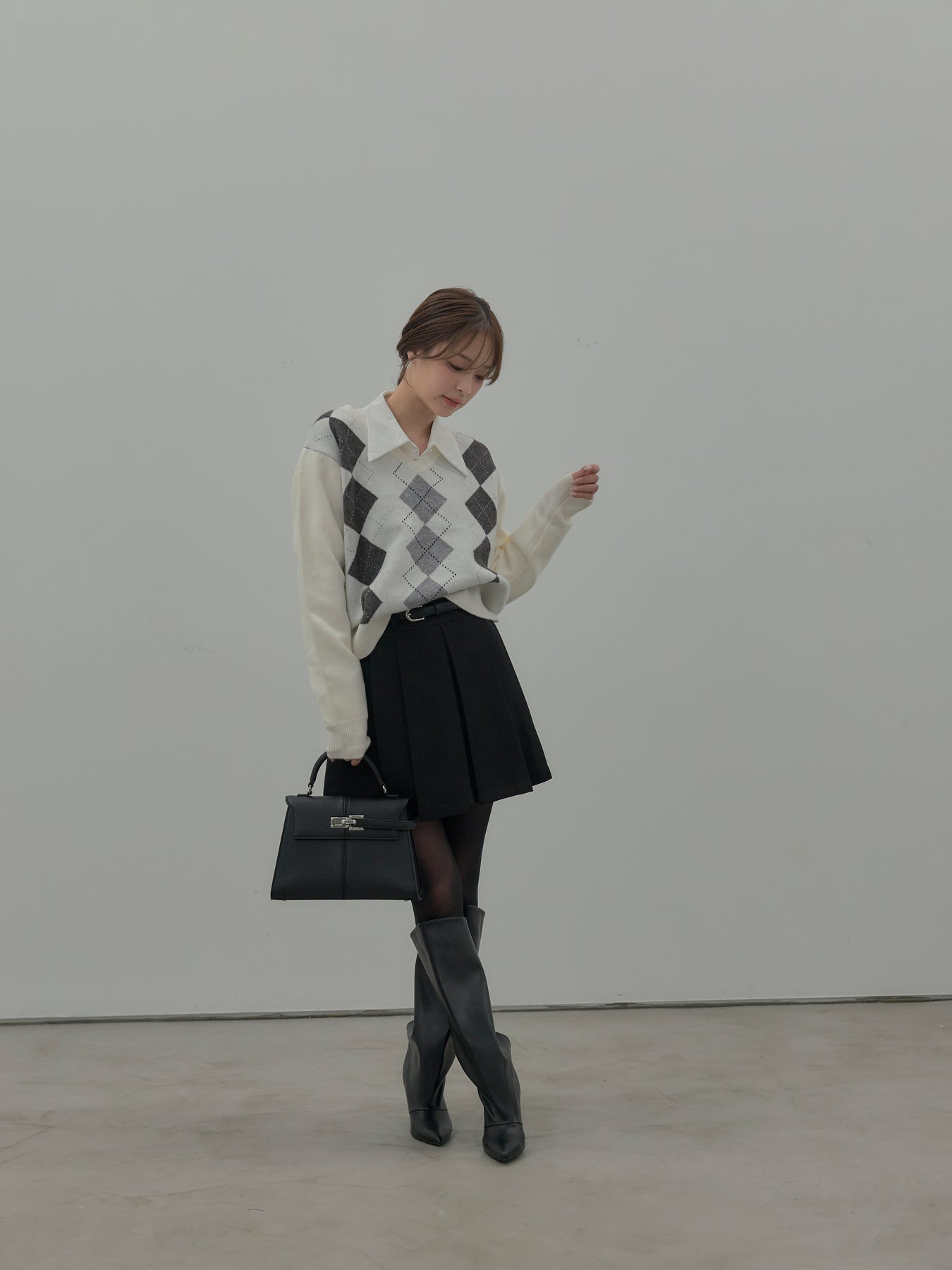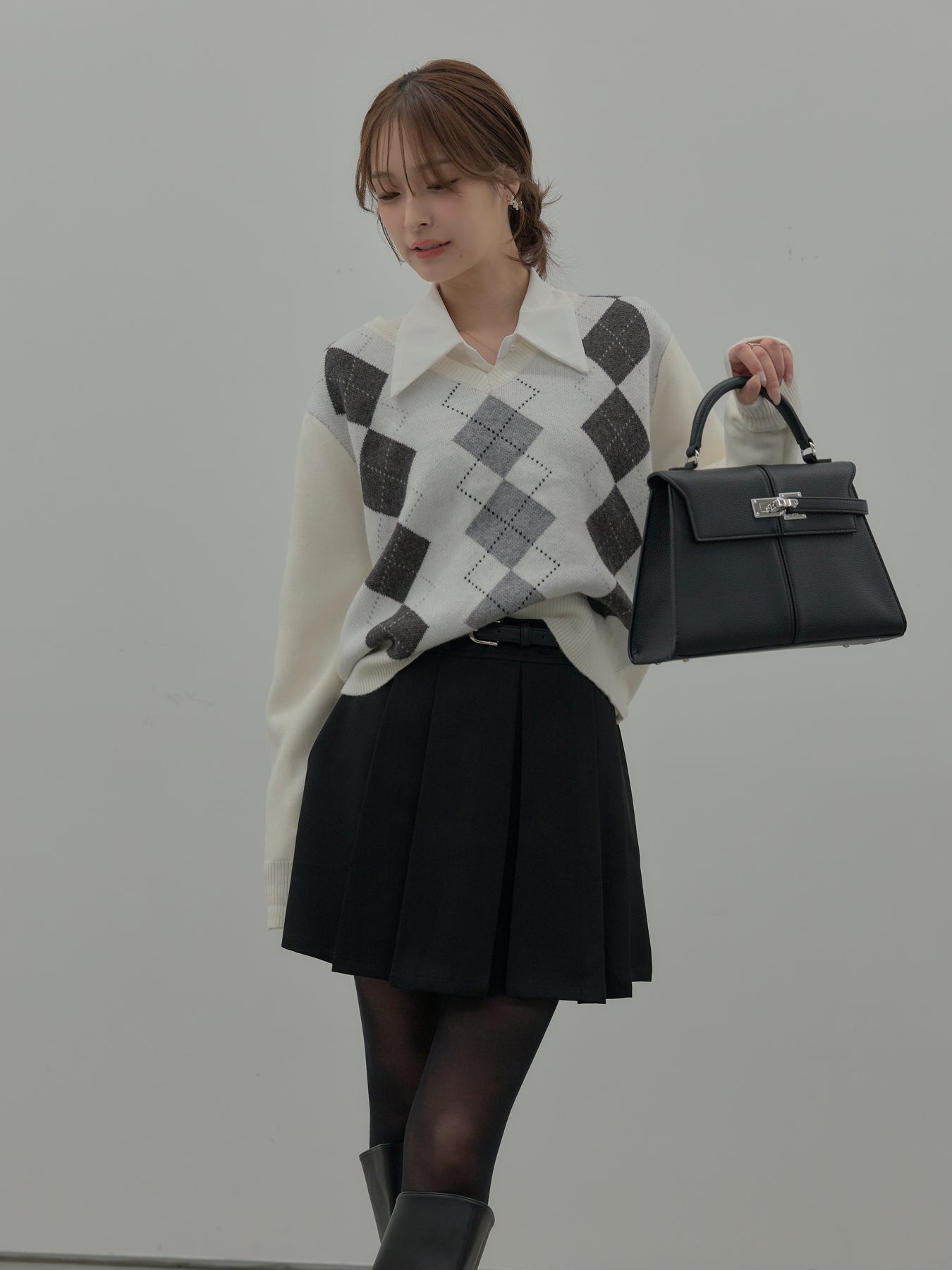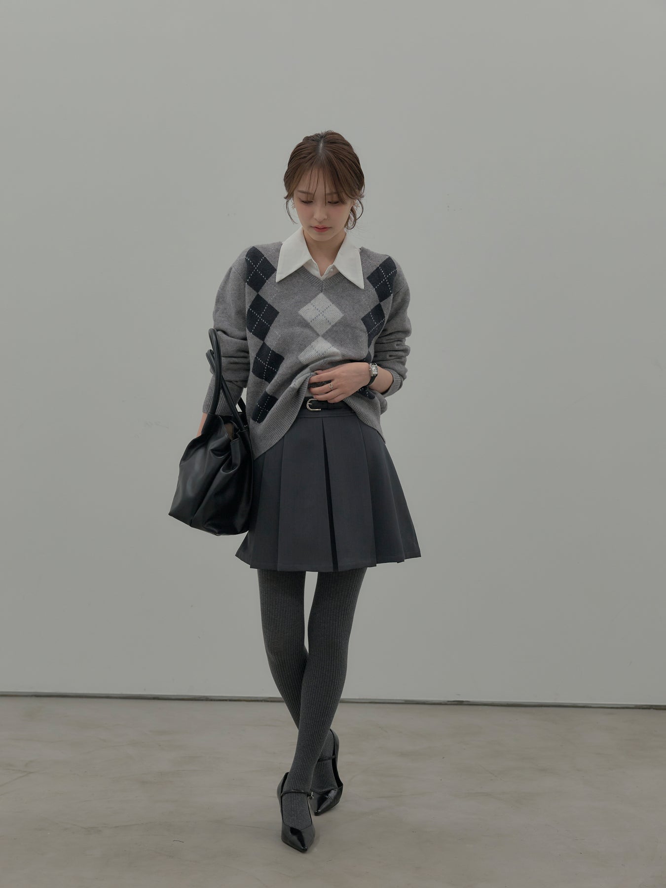 【SET】アーガイル柄Vネックニットプルオーバー+ベルト付きプリーツミニスカート(2set)