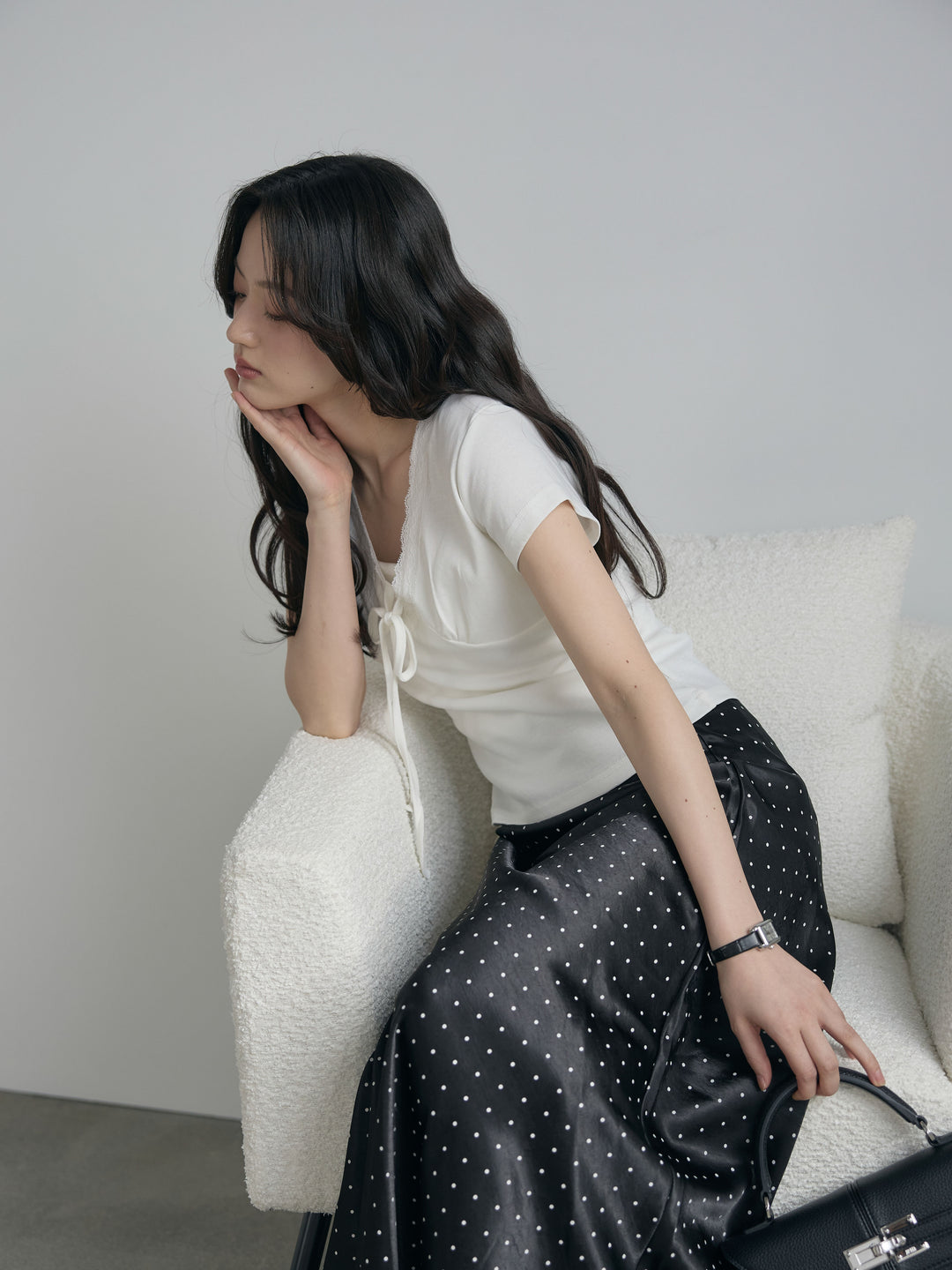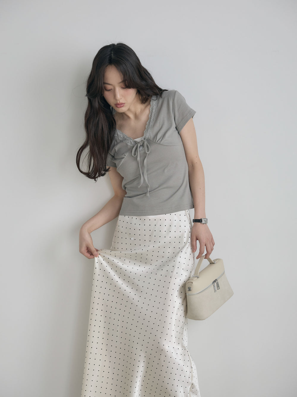 【SET】レーストリムフロントリボンカットソー+ドットパターンAラインサテンスカート(2set)