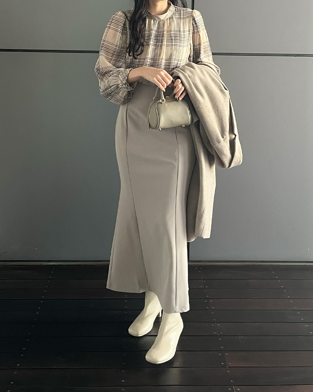 春先にピッタリの上品な淡色カラーで纏めたワントーンコーデ。シフォンのふんわりとしたエアリーシルエットにマーメイドスカートでスタイルアップ。スクエアトゥがきちんと感をプラスしてくれるのでオフィスシーンにもおすすめです。