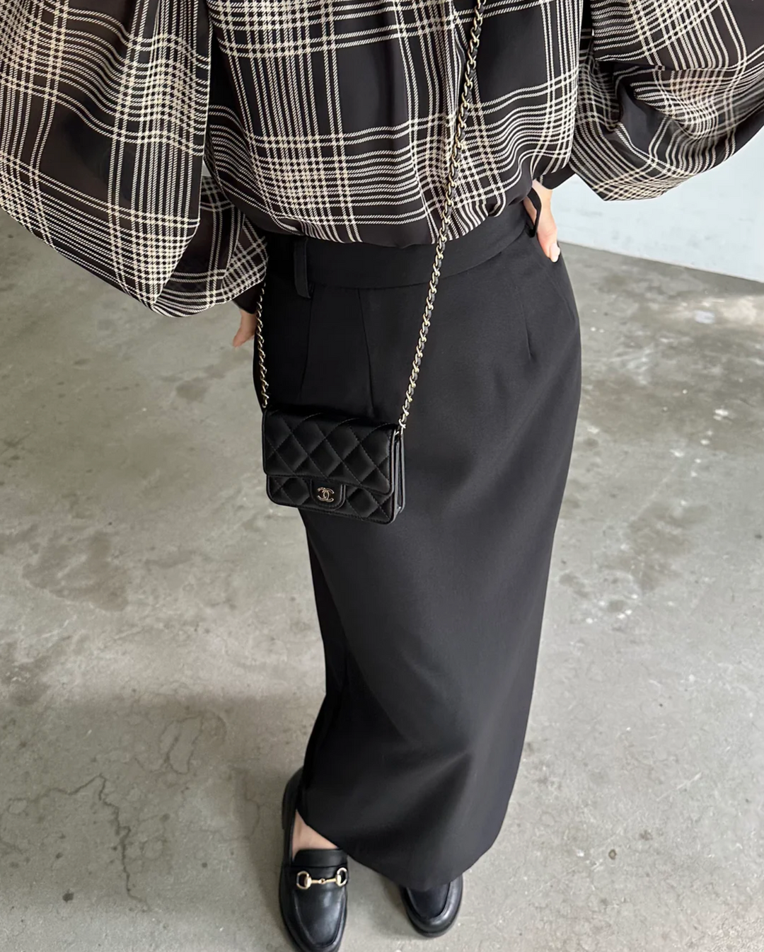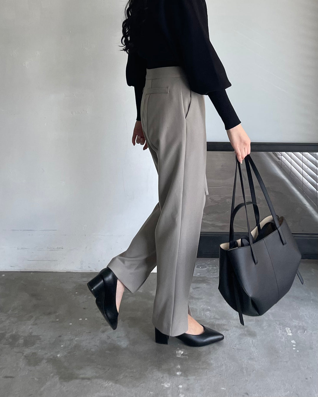 裾のスリットデザインがカチッとしたオフィスコーデに抜け感をプラスし、チャンキーヒールがパンツスタイルの立ち姿を凛と見せてくれます。