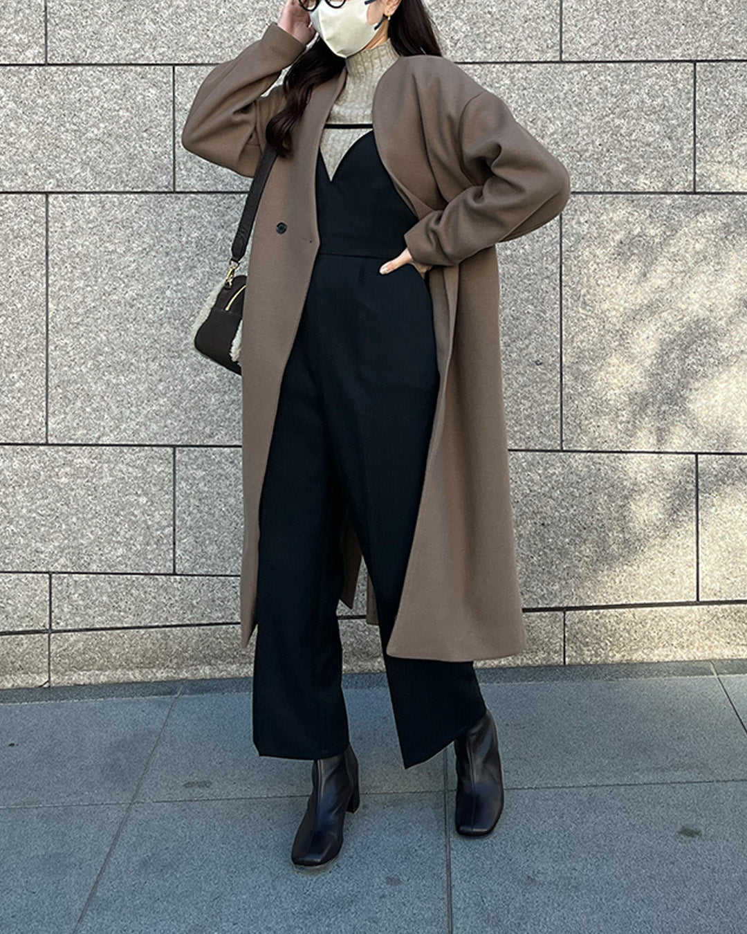 女性らしいデザインが魅力のコートとオールインワンに、スクエアトゥの凛としたシルエットが大人上品さをプラス。