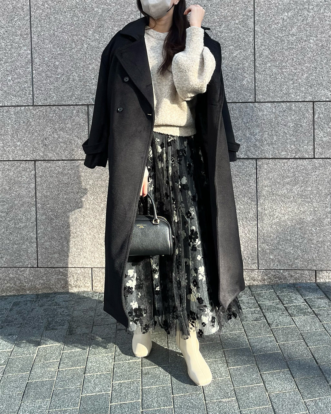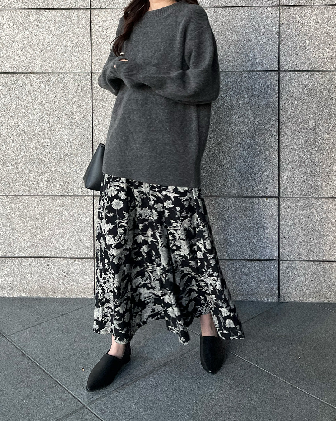 オーバーサイズニットに軽やかな花柄スカートを合わせたリラックス感あるダークトーンコーデ。足元のシャープなシルエットがコーデを引き締めて大人っぽく纏めてくれます。