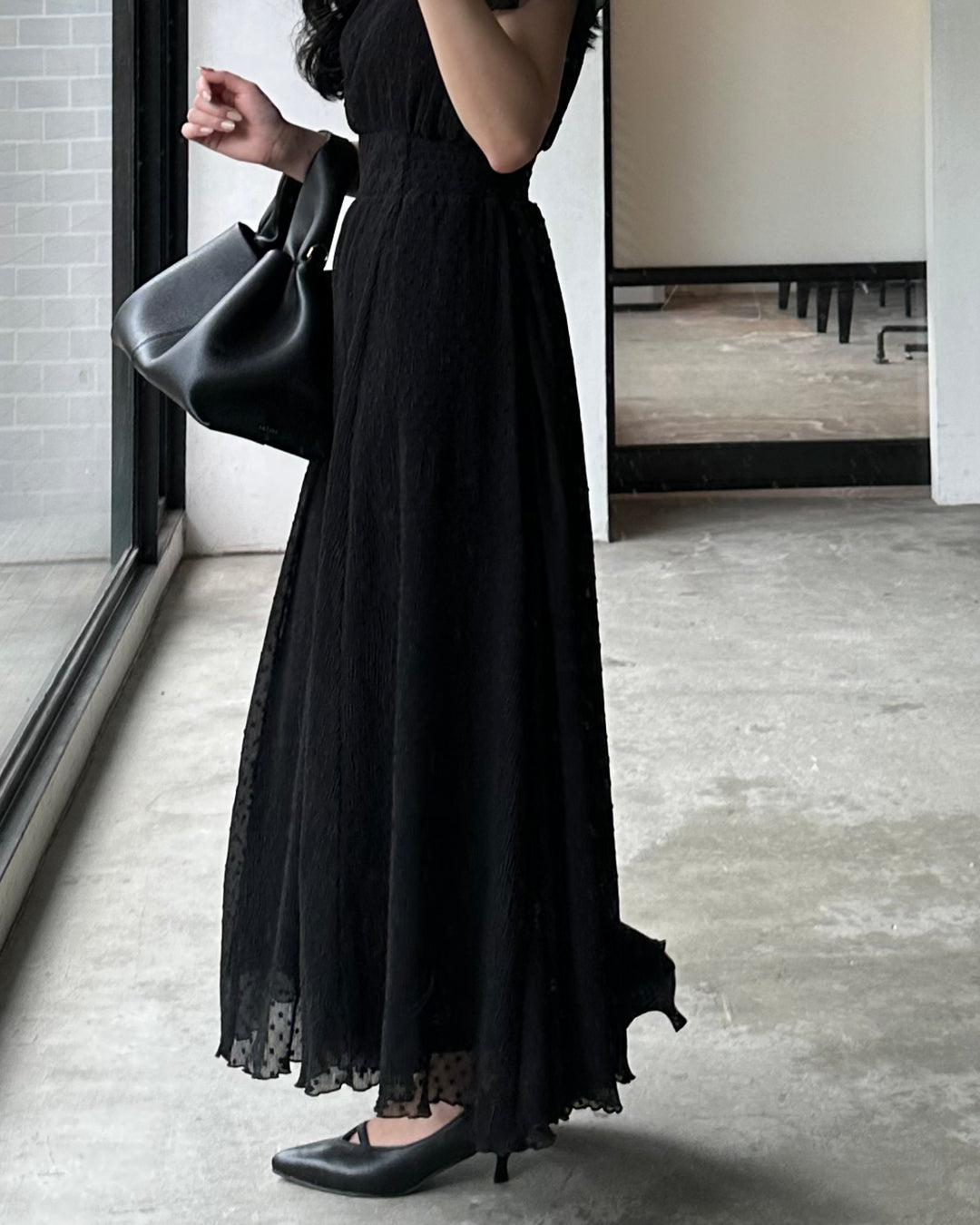 ドットが散りばめられた可憐なシフォンワンピースに合わせれば、ぐっと大人レディ感がアップ。
