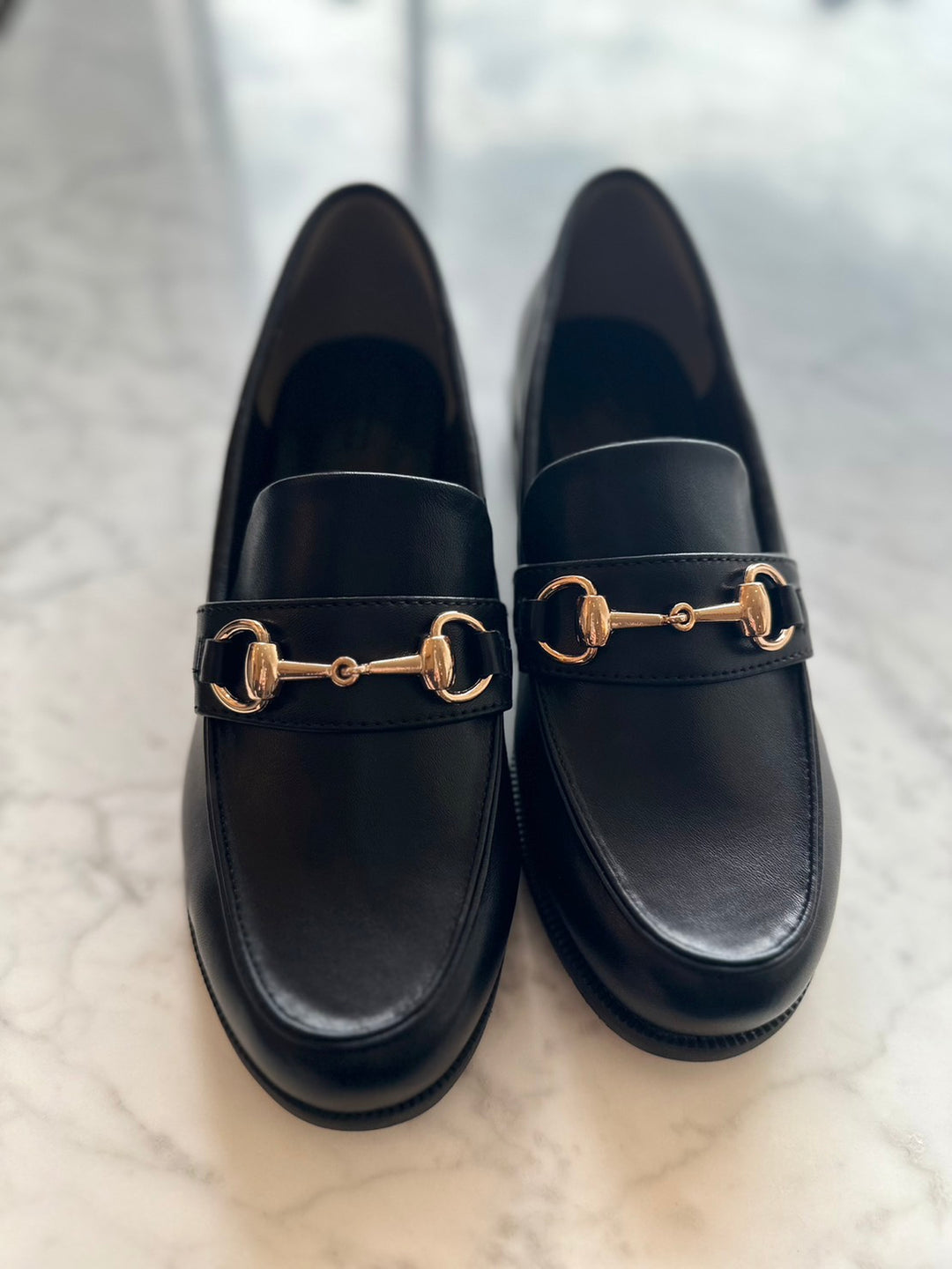 上品なゴールドのビットデザインが目を惹くローファー。パンツ・スカートスタイルどちらにも馴染むすっきりとしたシルエットは、オフィスシーンにも馴染むきちんと感も備えています。