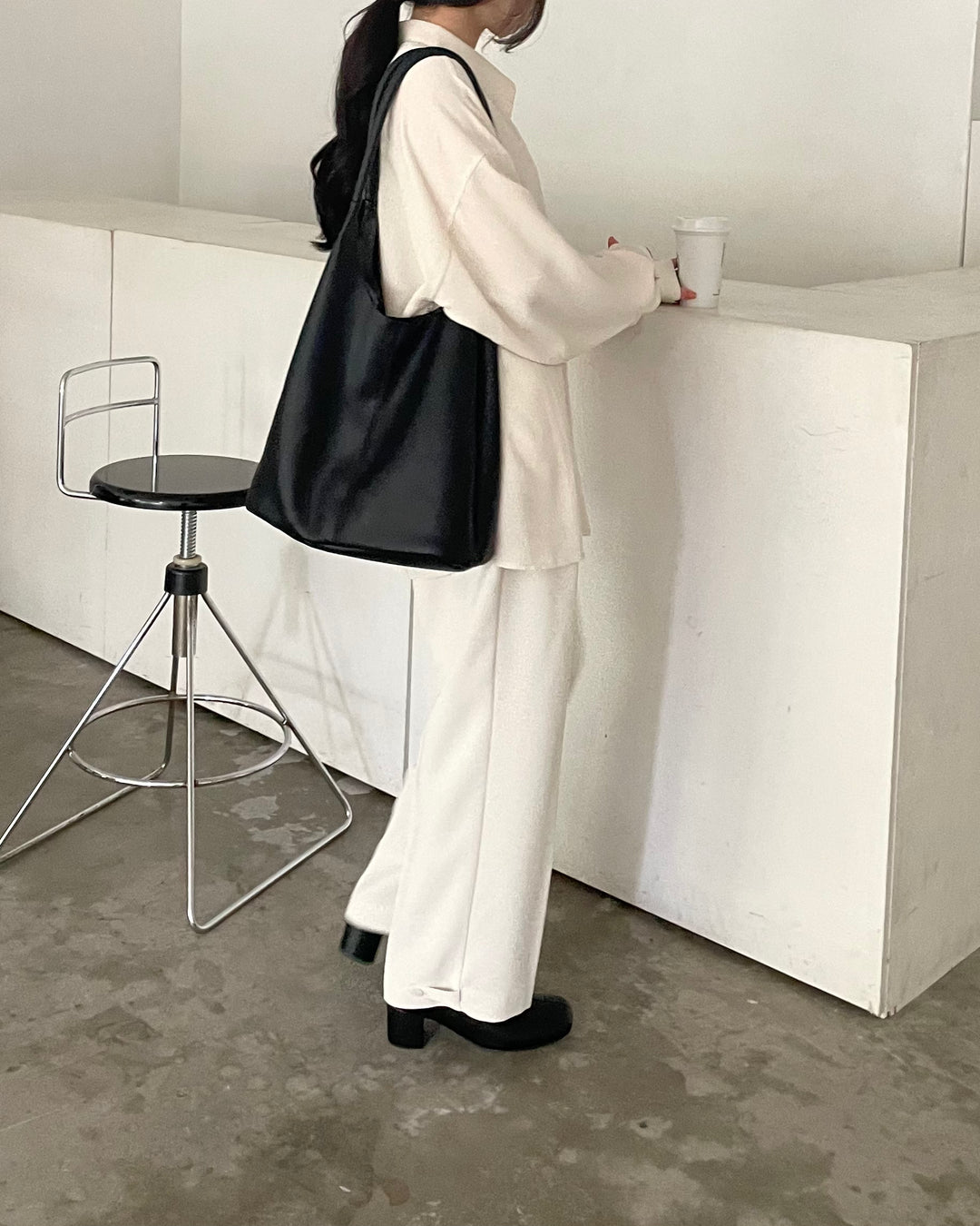 メンズライクなシャツ×ゆったりシルエットのストレートパンツを合わせたハンサムコーデにミュールをあわせれば、一気にこなれ感のある綺麗めコーデに。