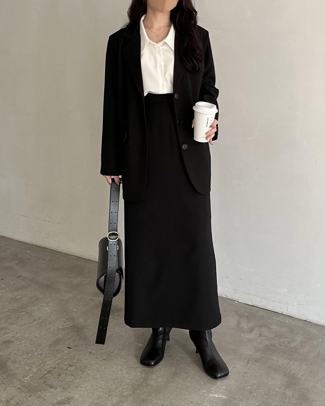スカートにジャケットを合わせれば、LOOK4とは雰囲気の違うオフィスコーデに◎