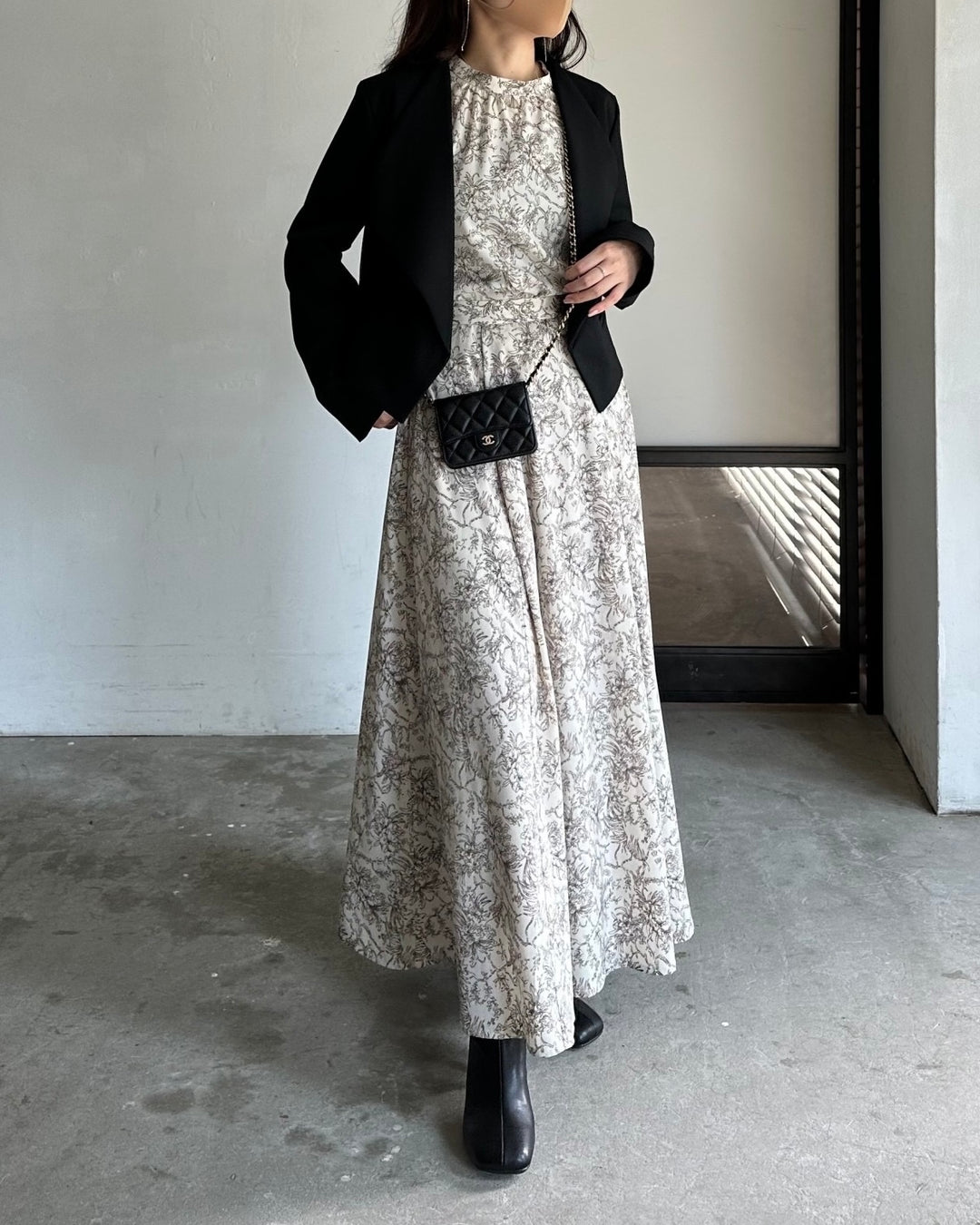 華やかさをもっとUPするなら、ブラウスとスカートをワンピース風にセットアップで着用してジャケットをONがおすすめ。