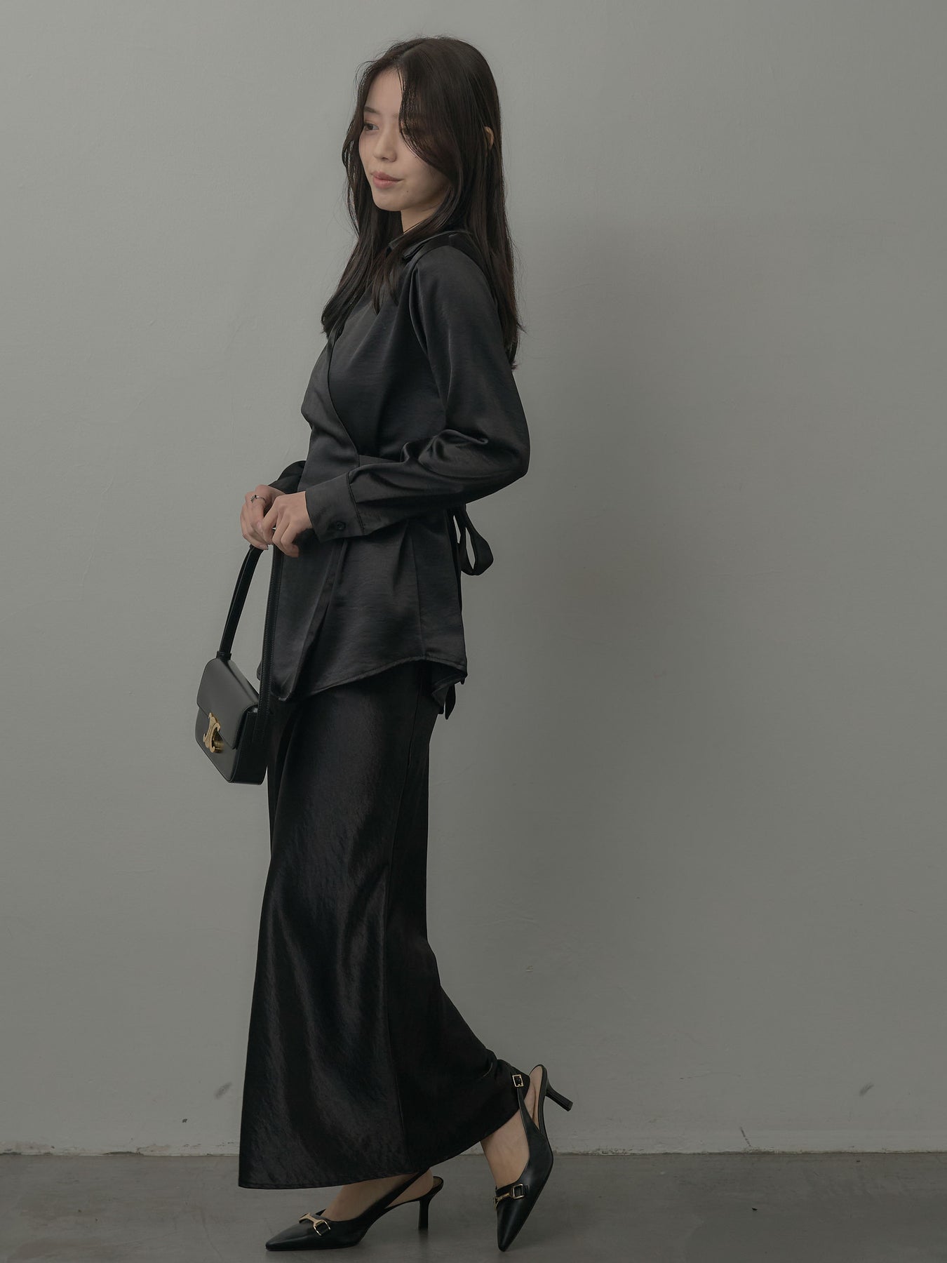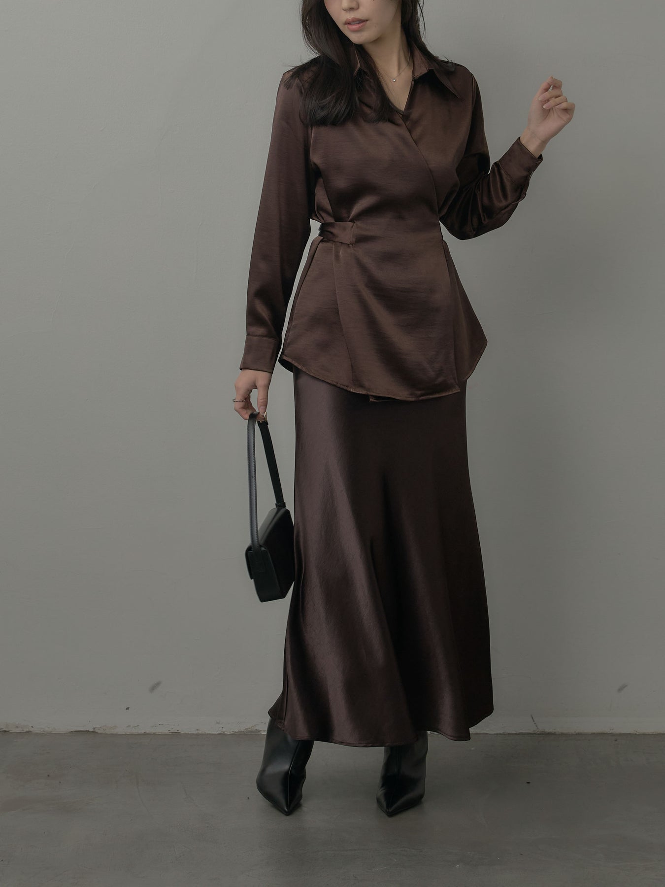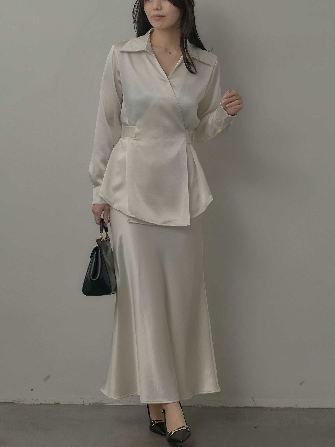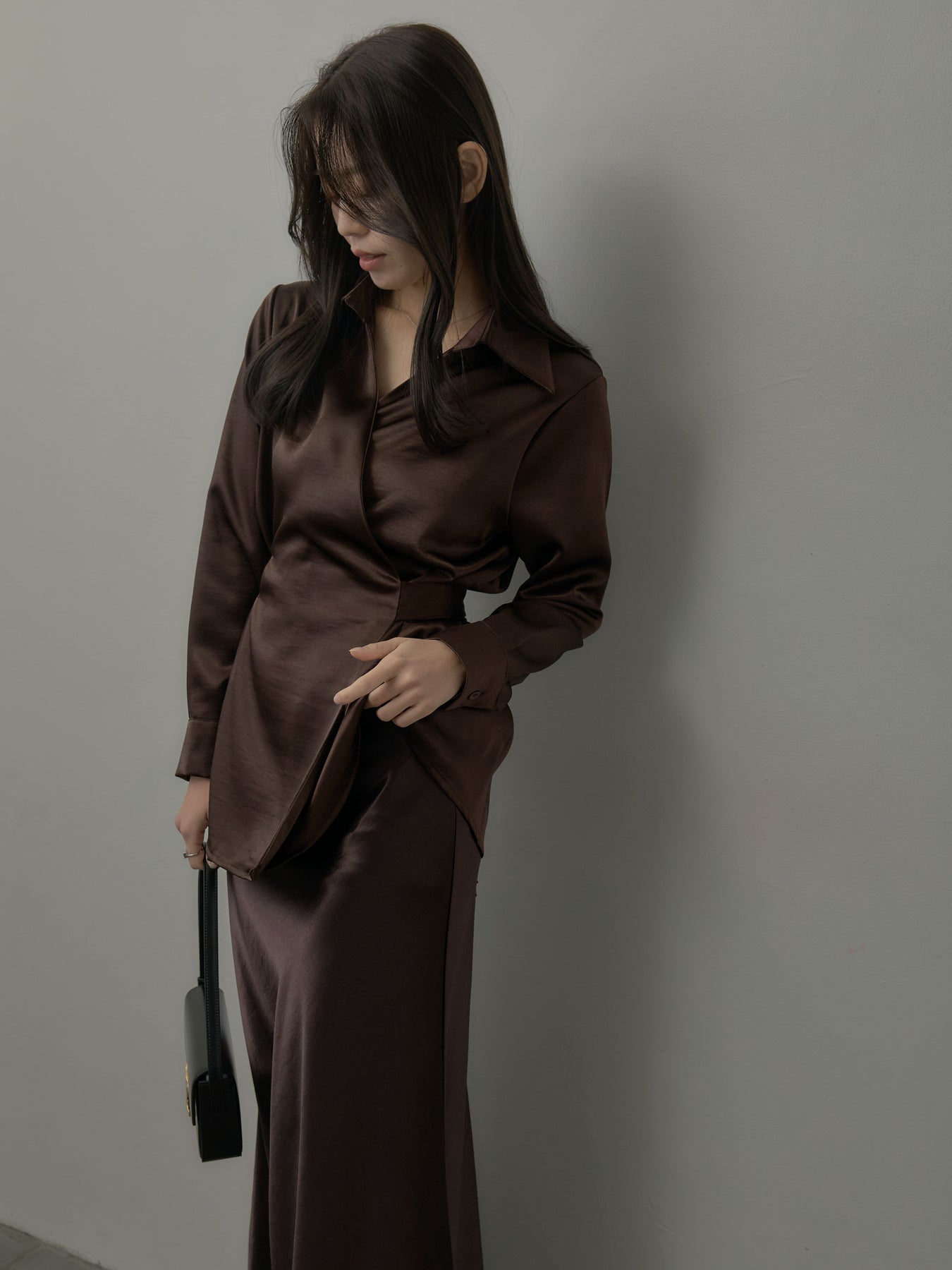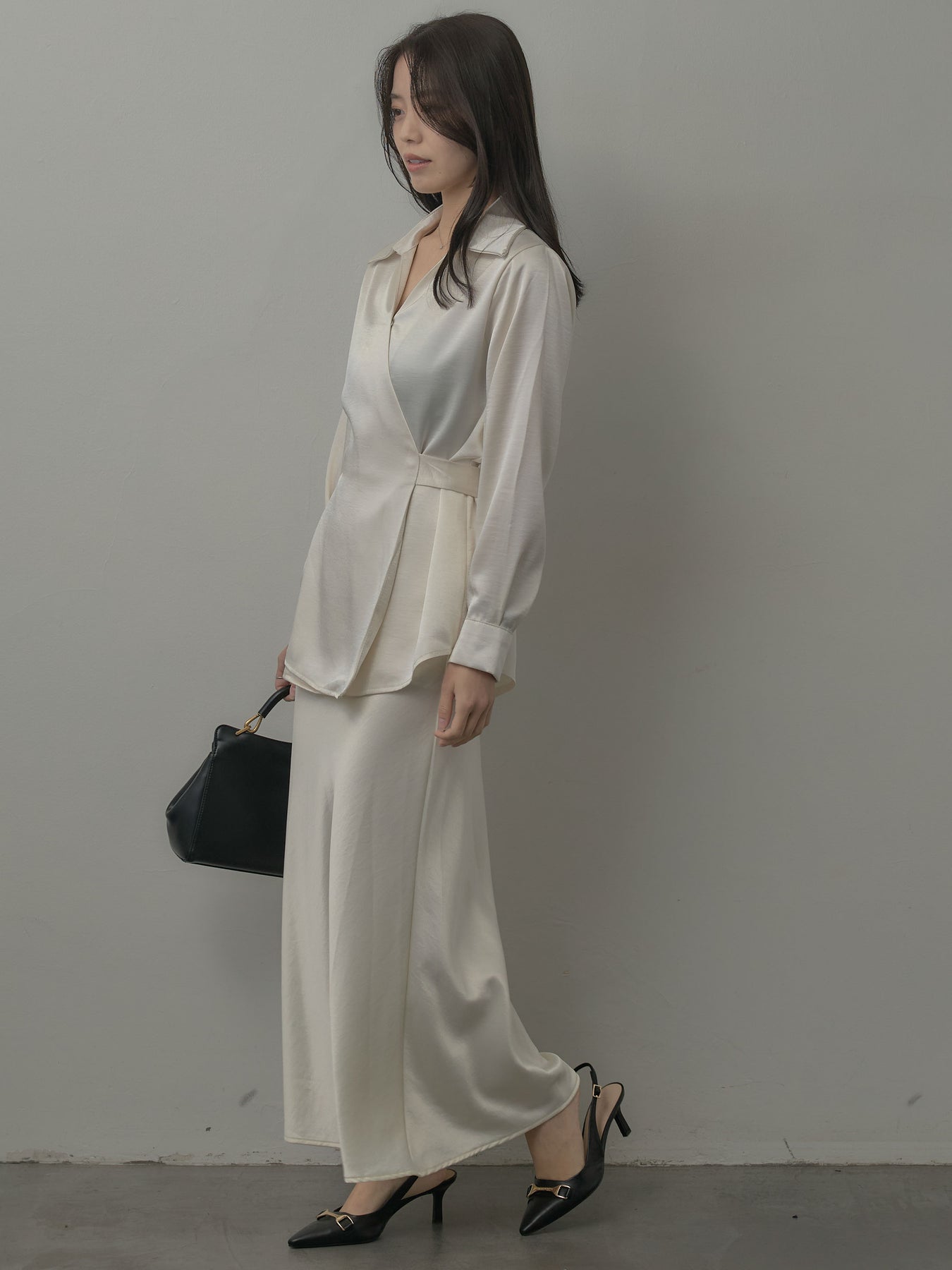 【SET】ウエストベルトサテンVネックシャツ+ナローAラインサテンスカート(2set)