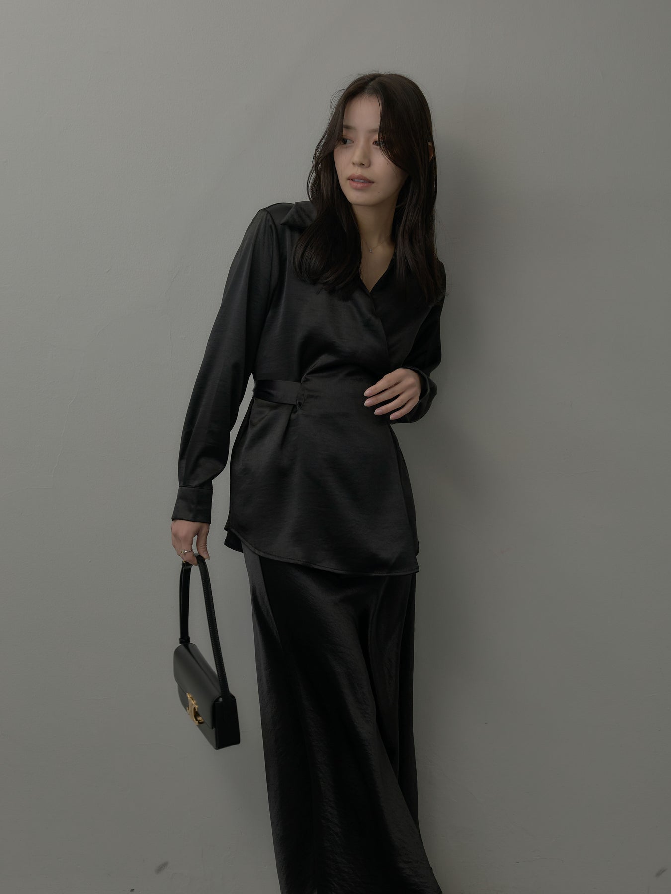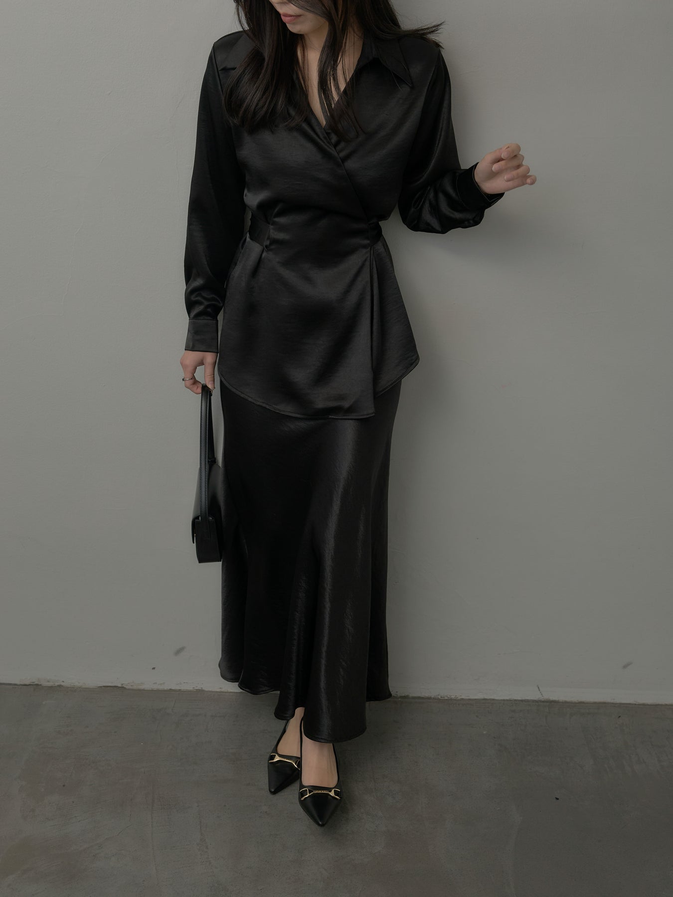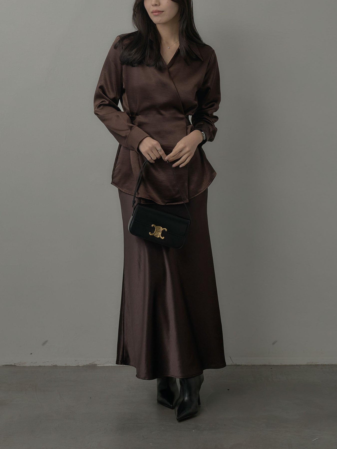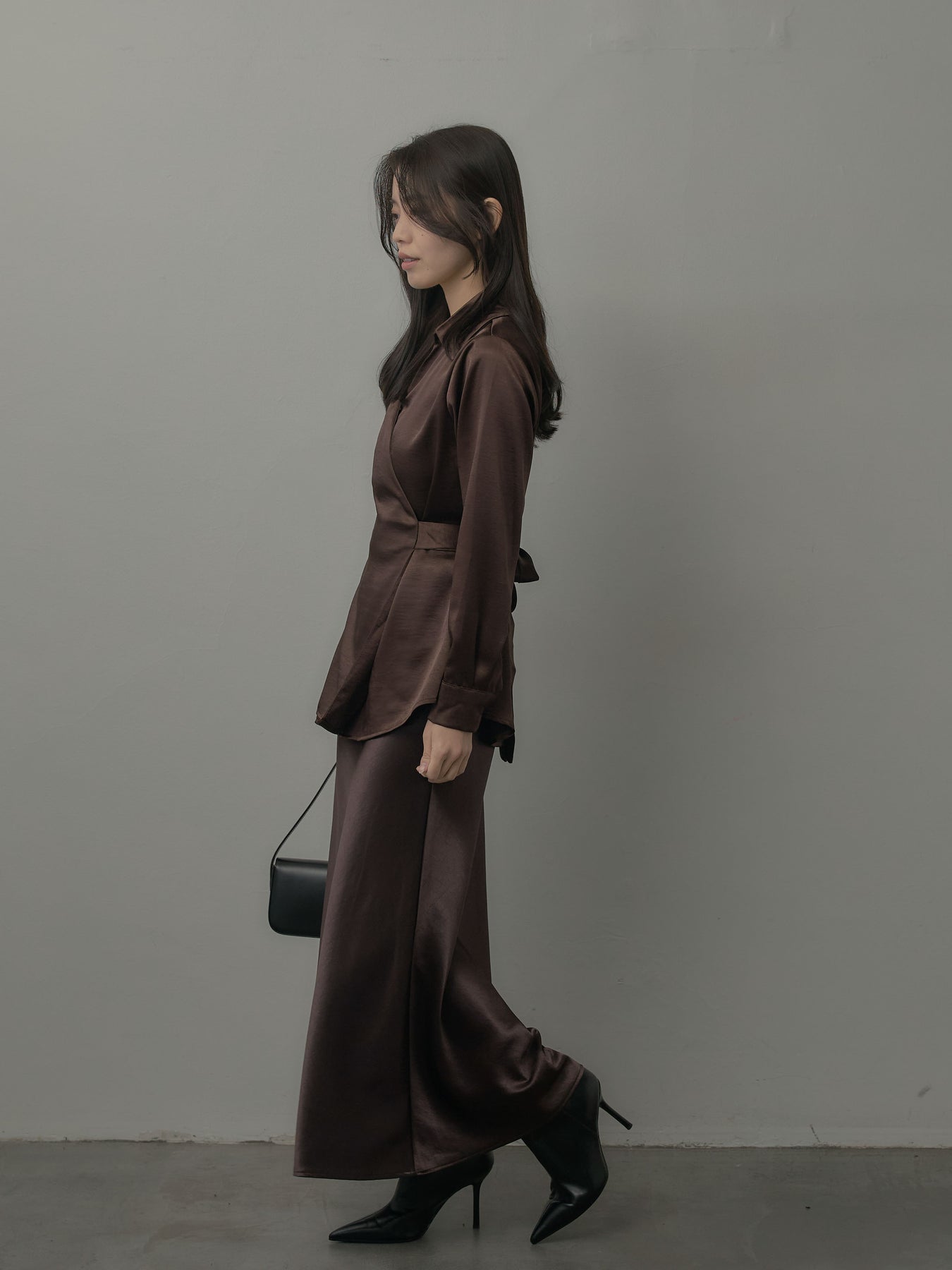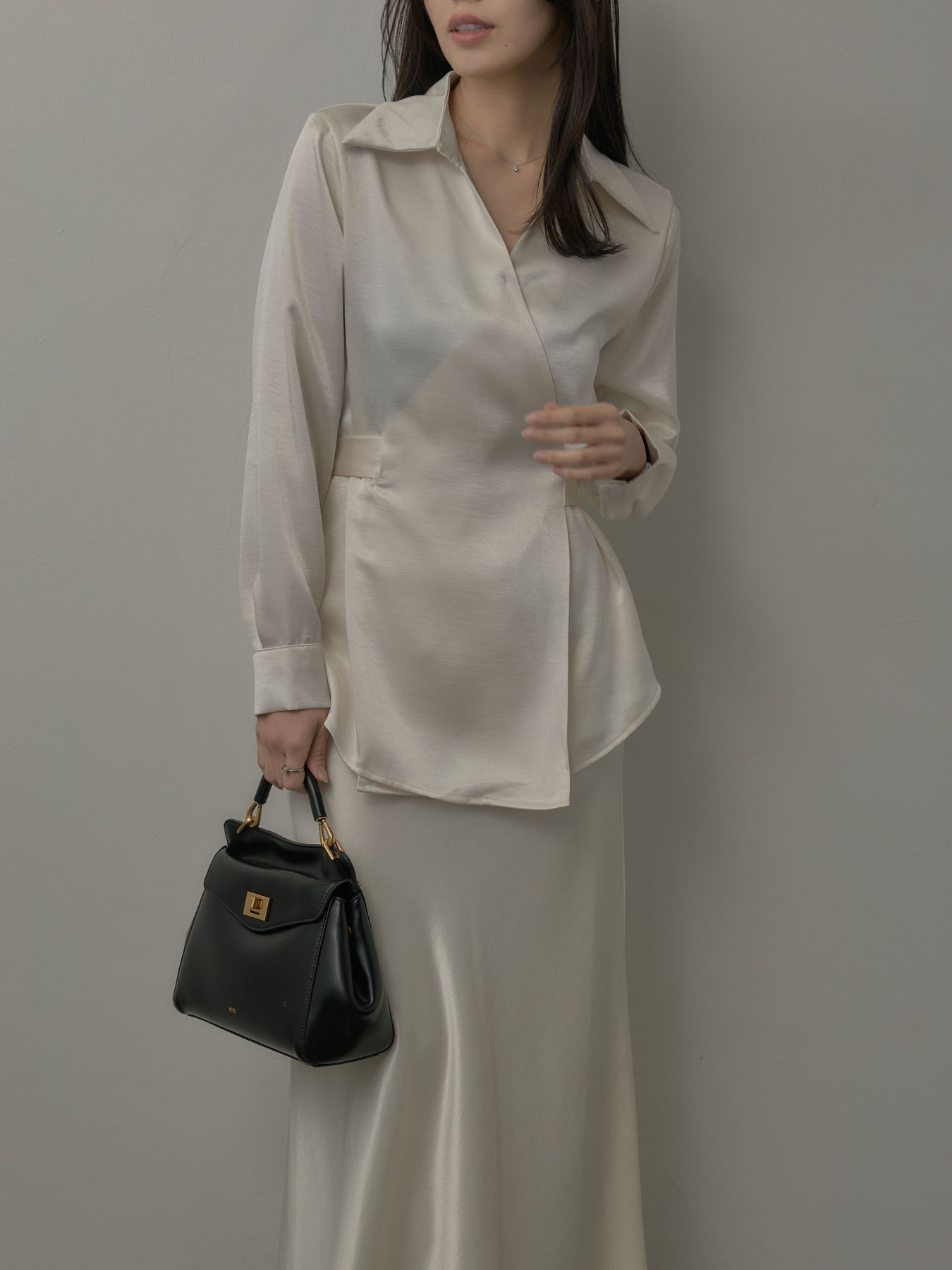 【SET】ウエストベルトサテンVネックシャツ+ナローAラインサテンスカート(2set)