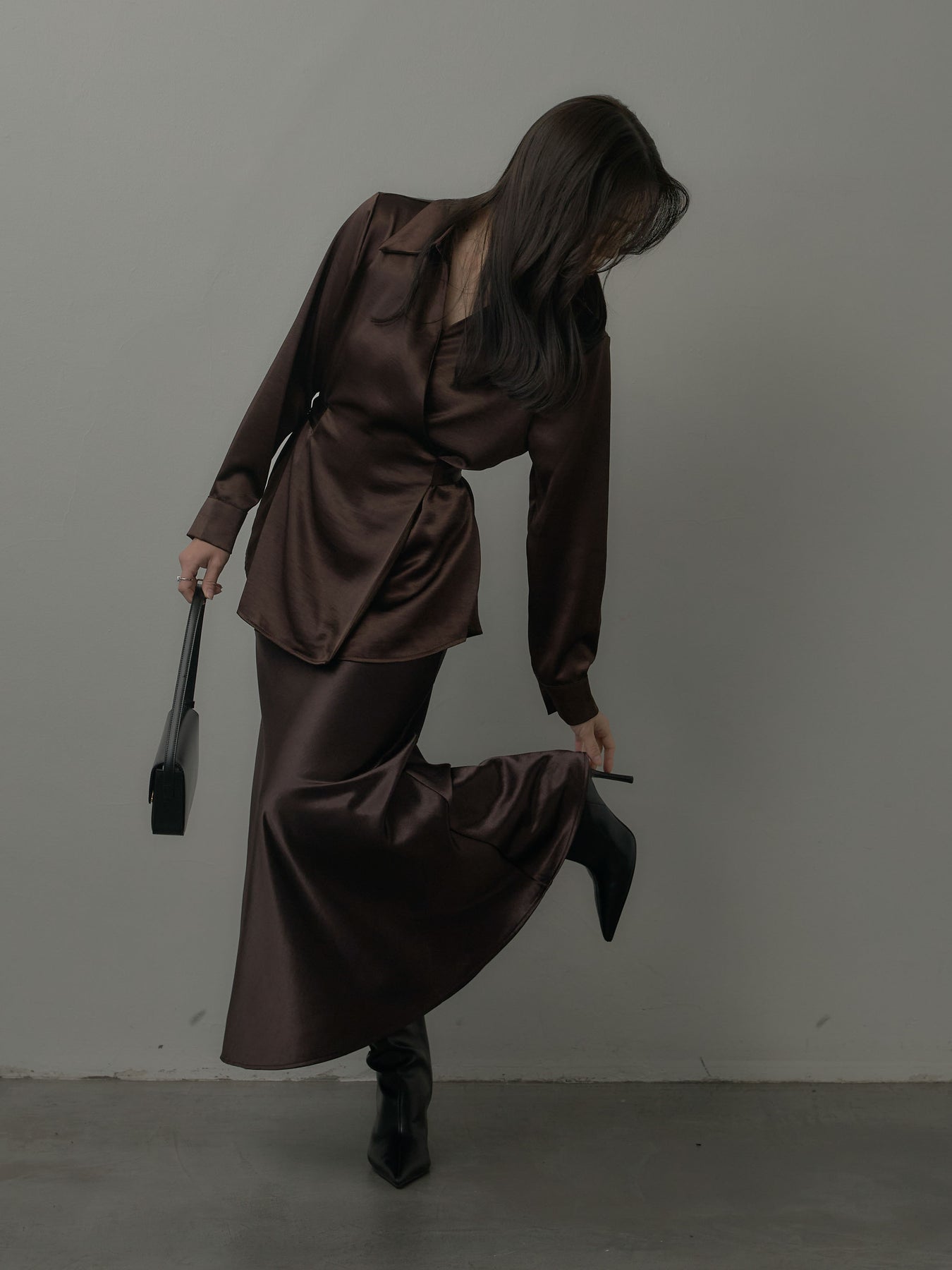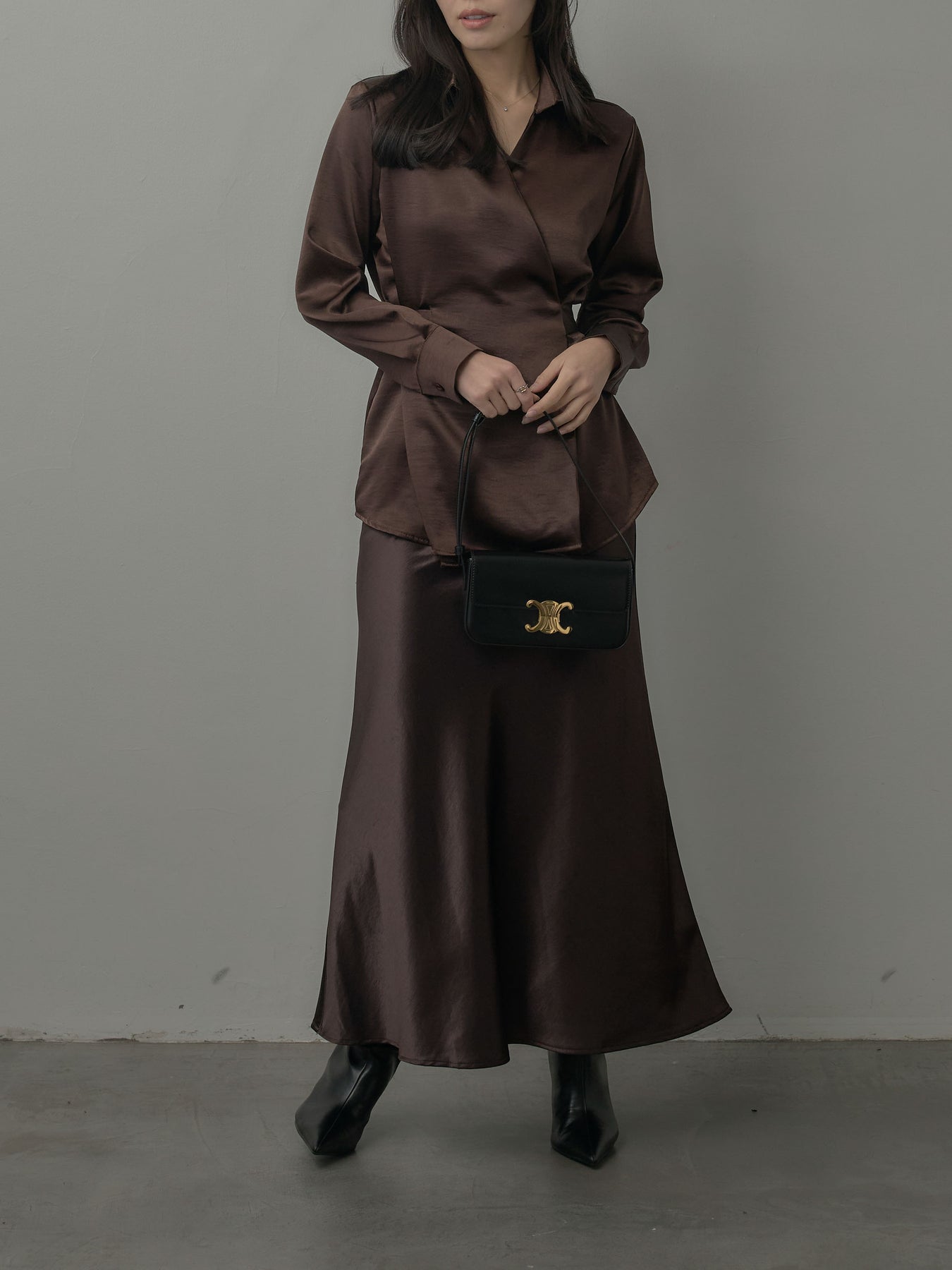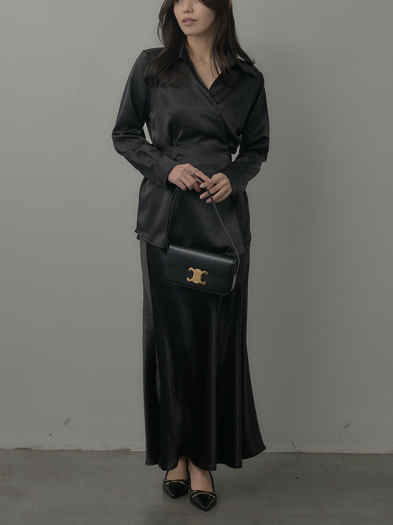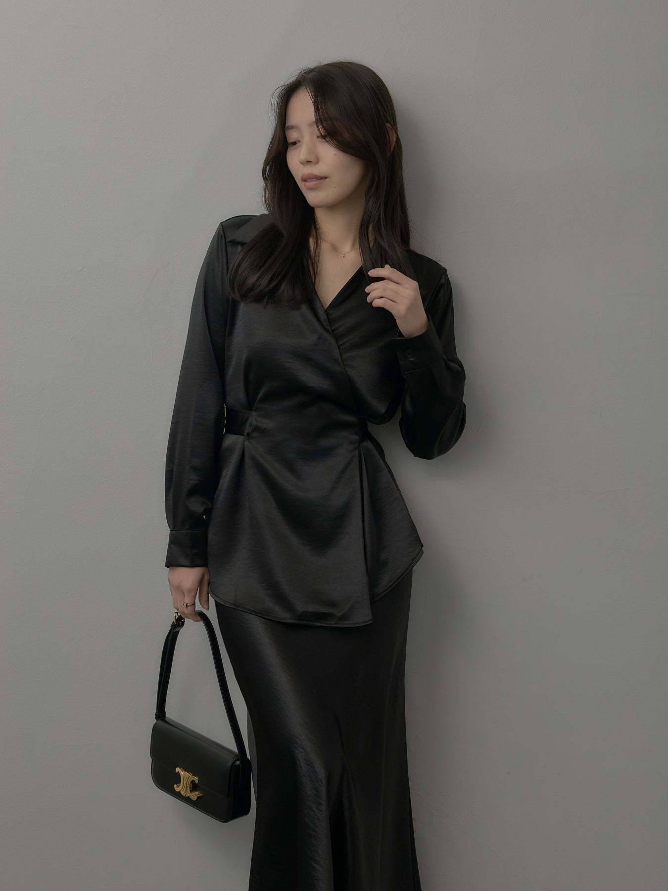 【SET】ウエストベルトサテンVネックシャツ+ナローAラインサテンスカート(2set)