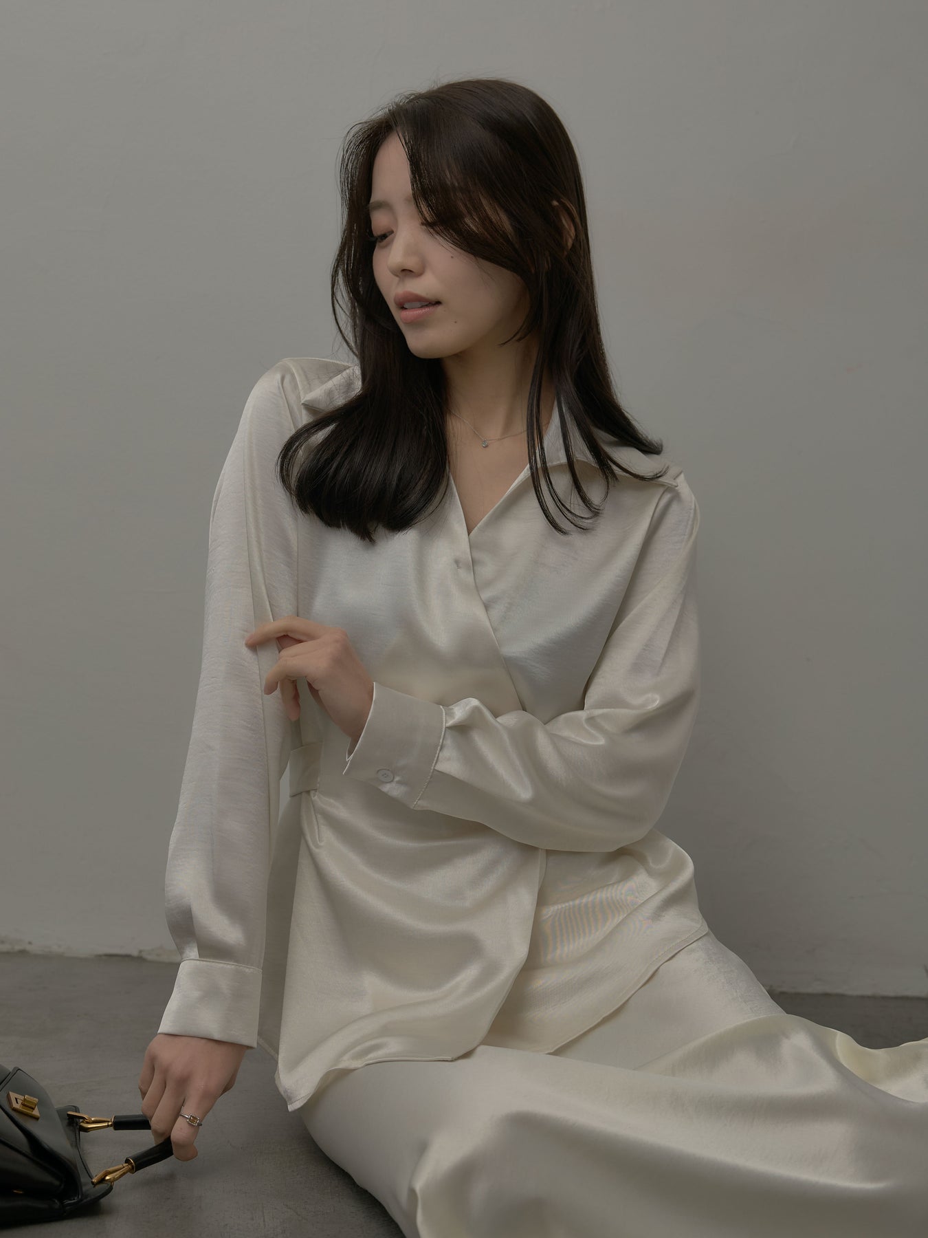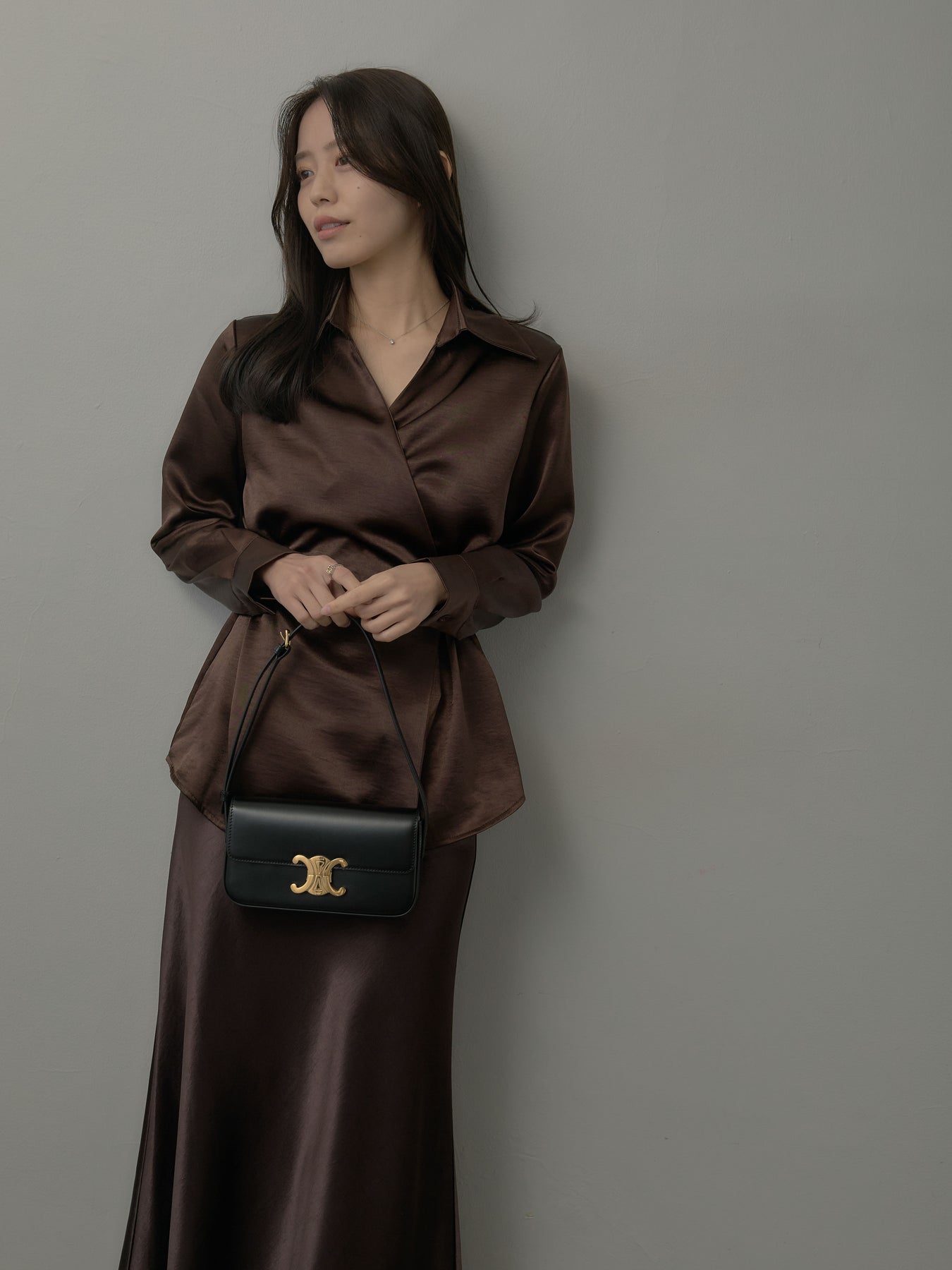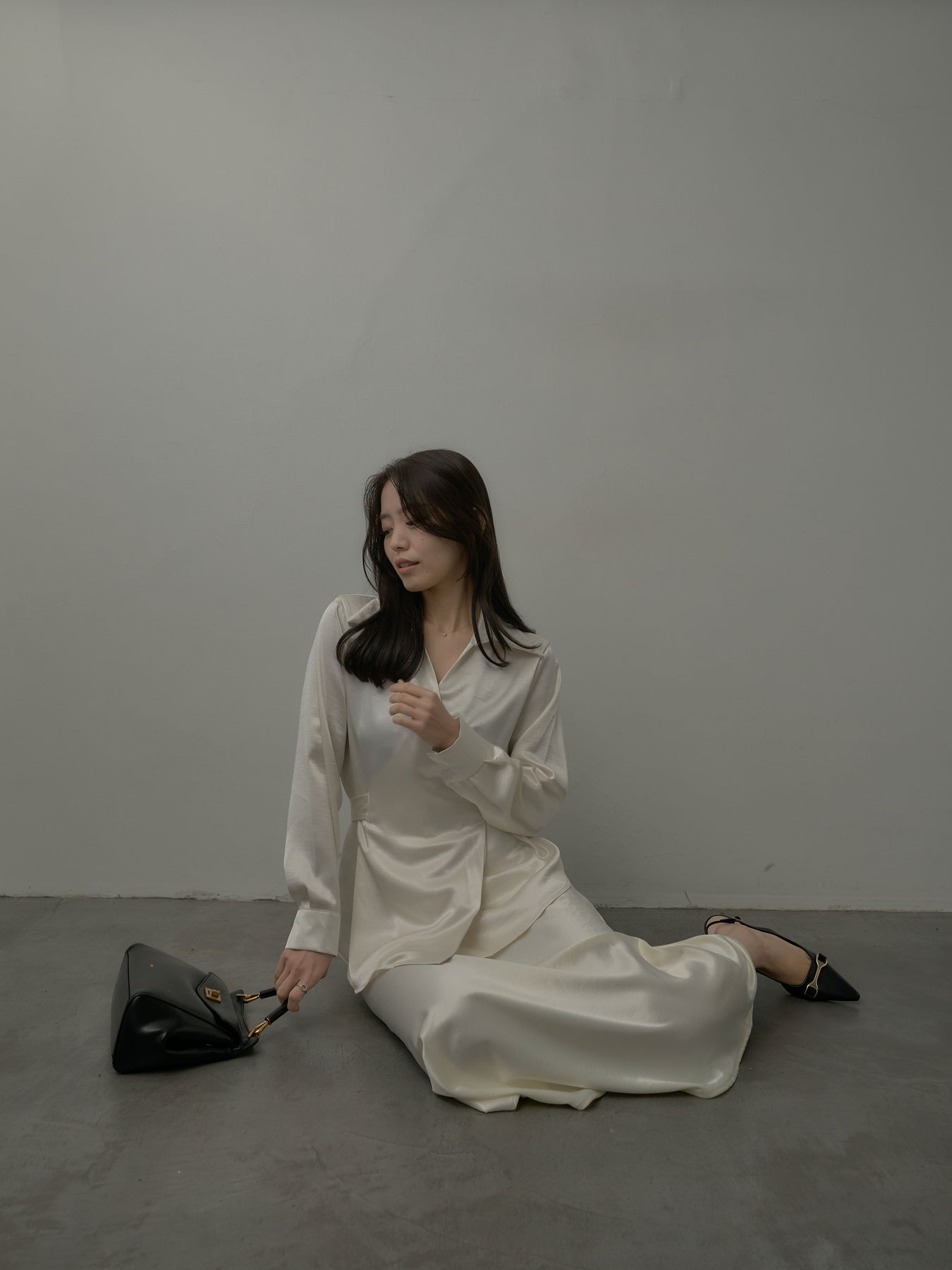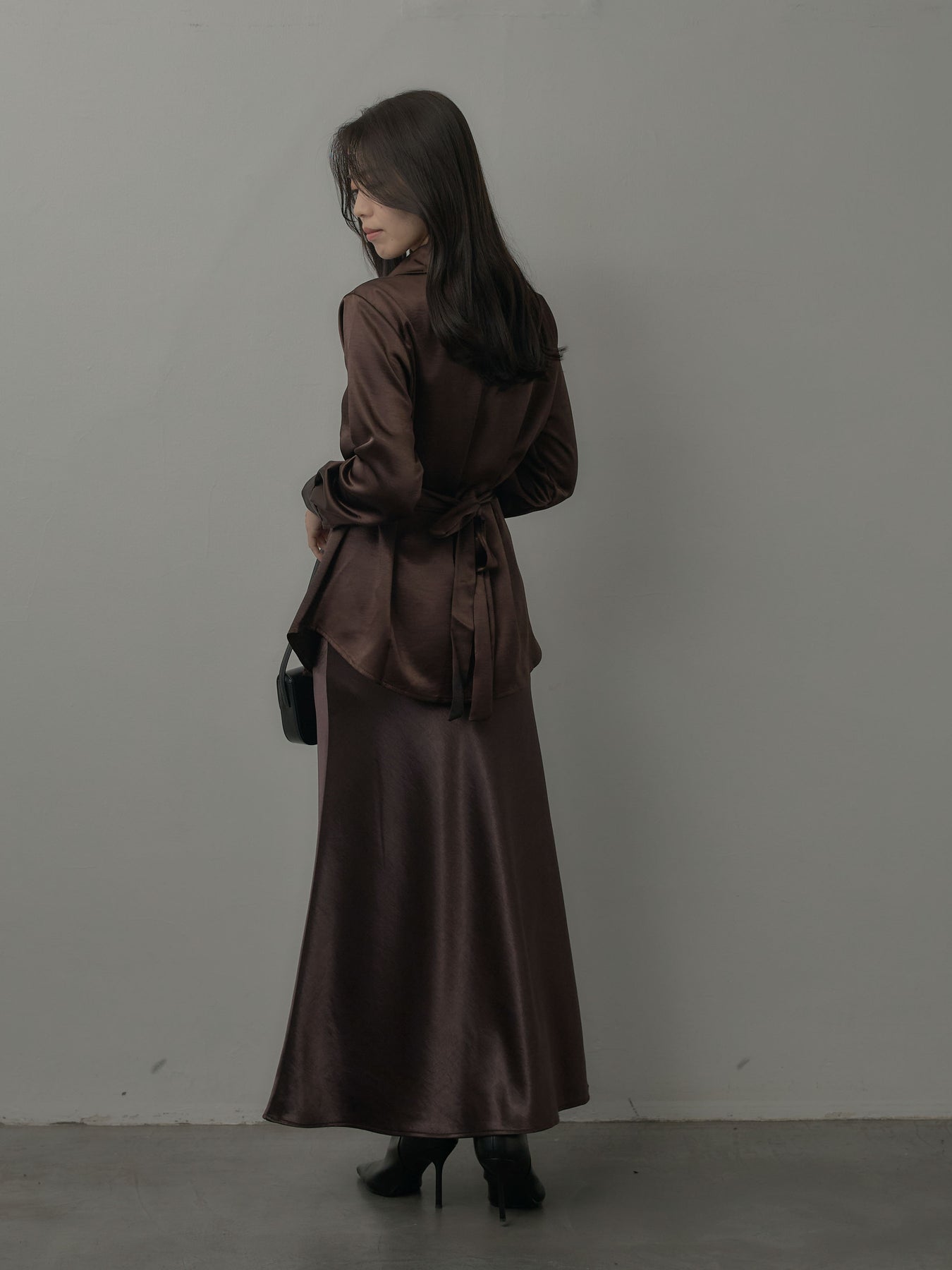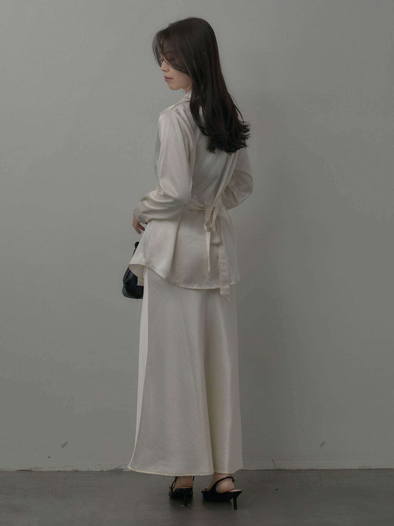 【SET】ウエストベルトサテンVネックシャツ+ナローAラインサテンスカート(2set)