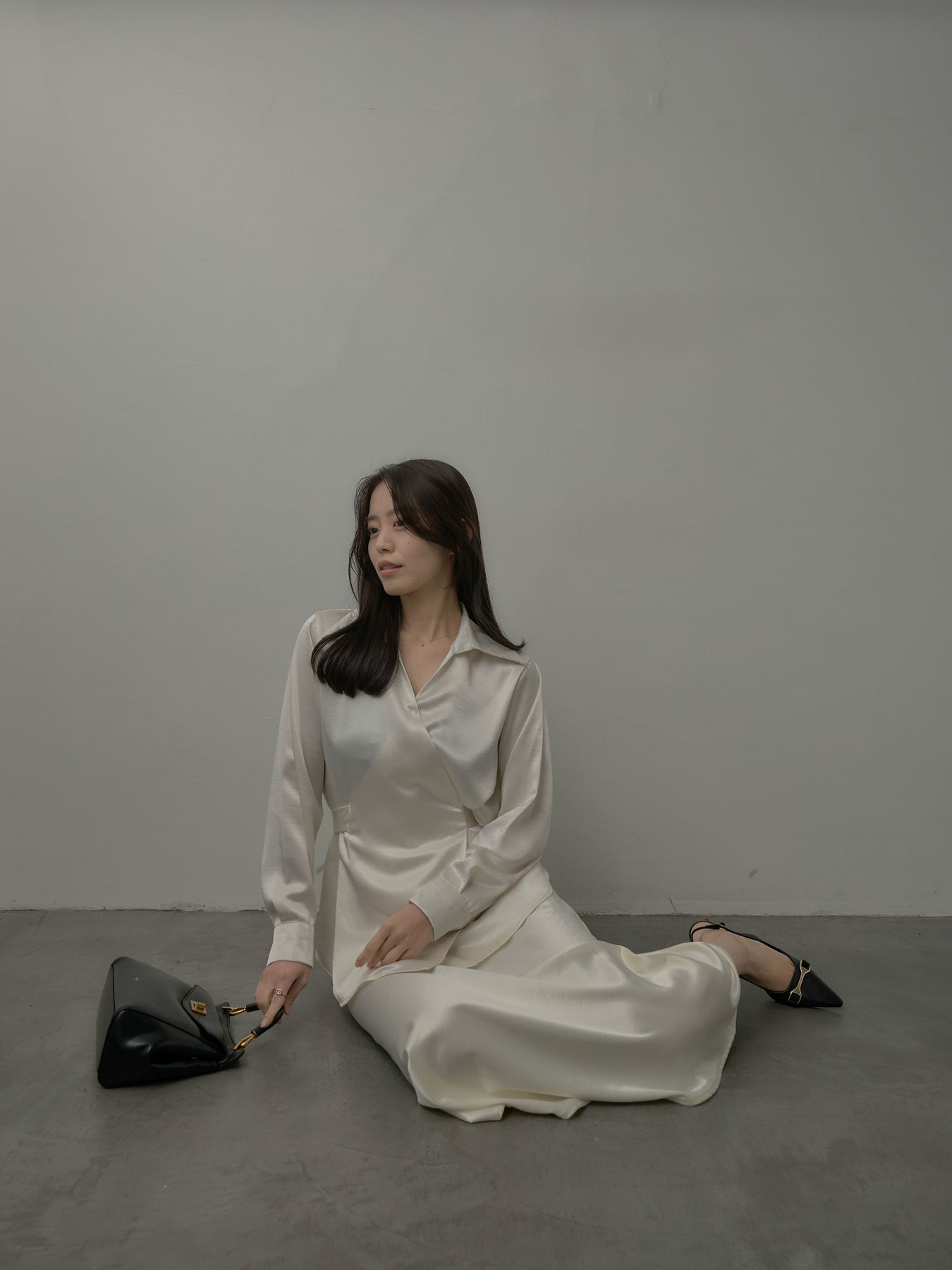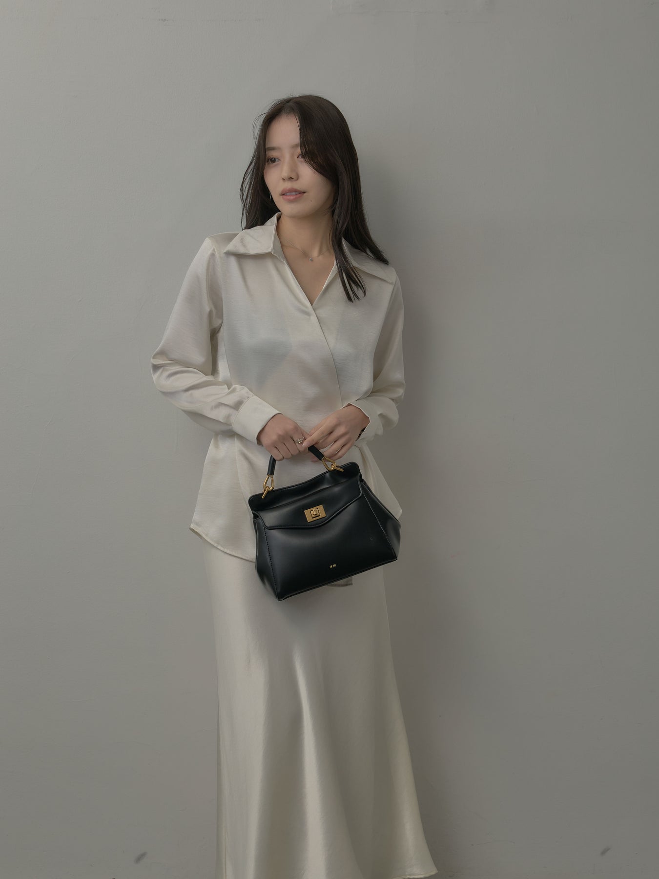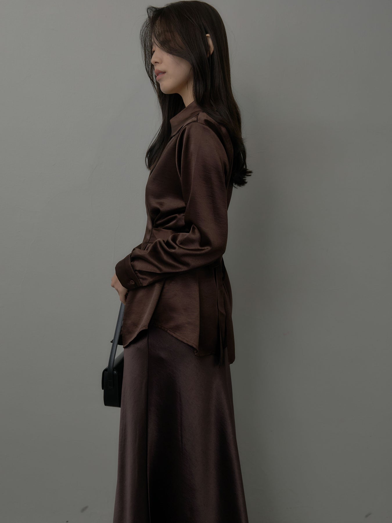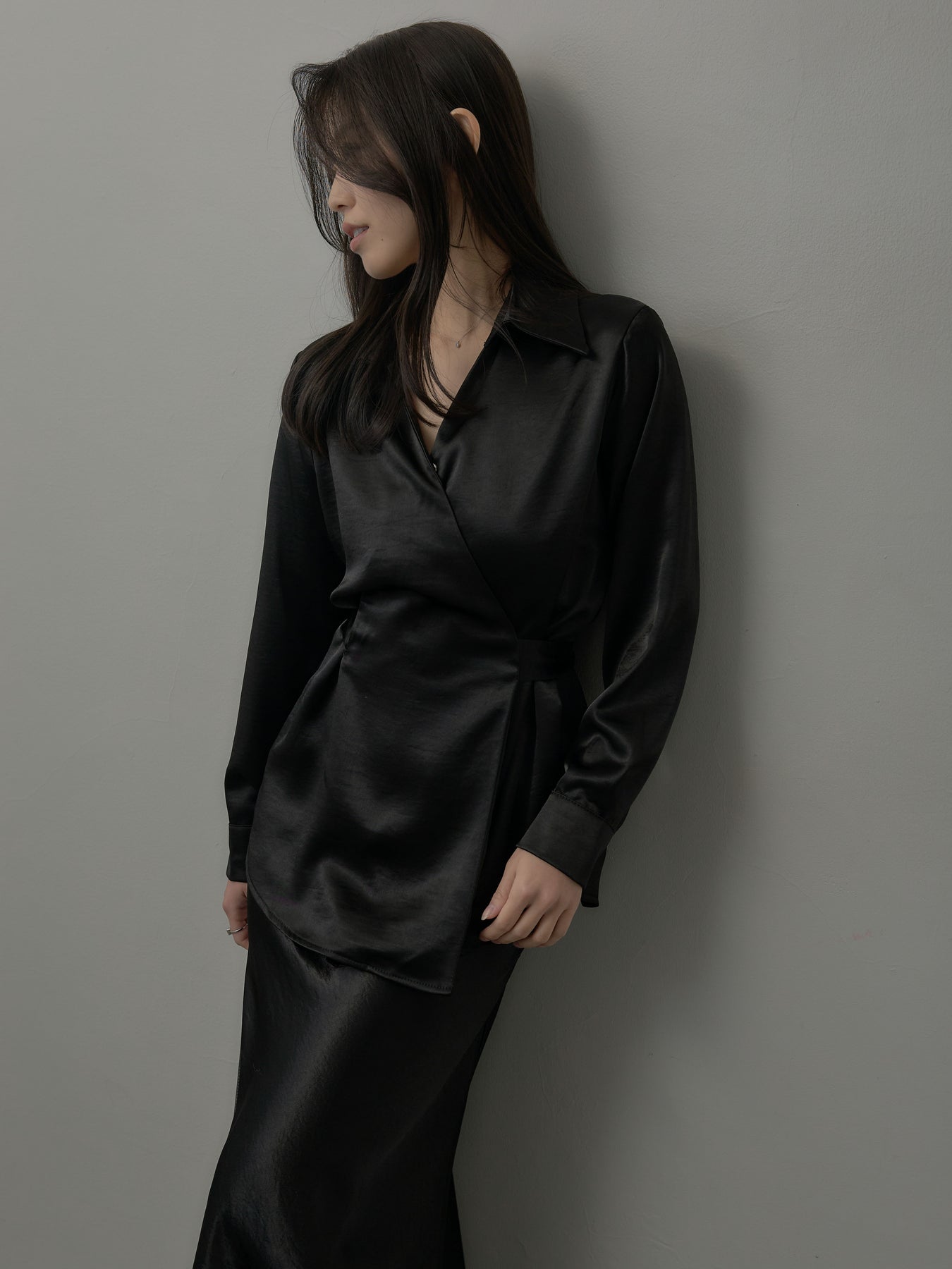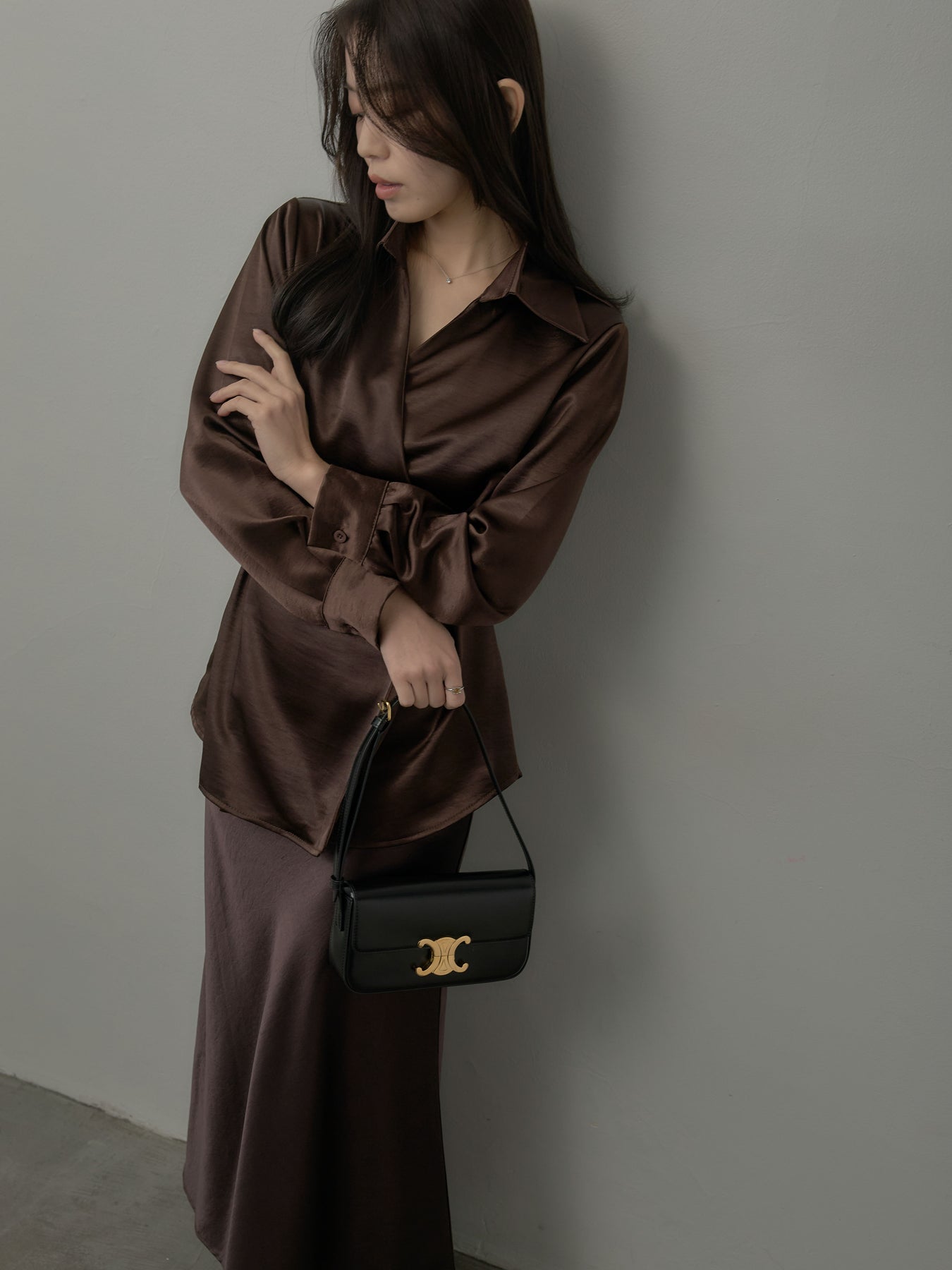 【SET】ウエストベルトサテンVネックシャツ+ナローAラインサテンスカート(2set)