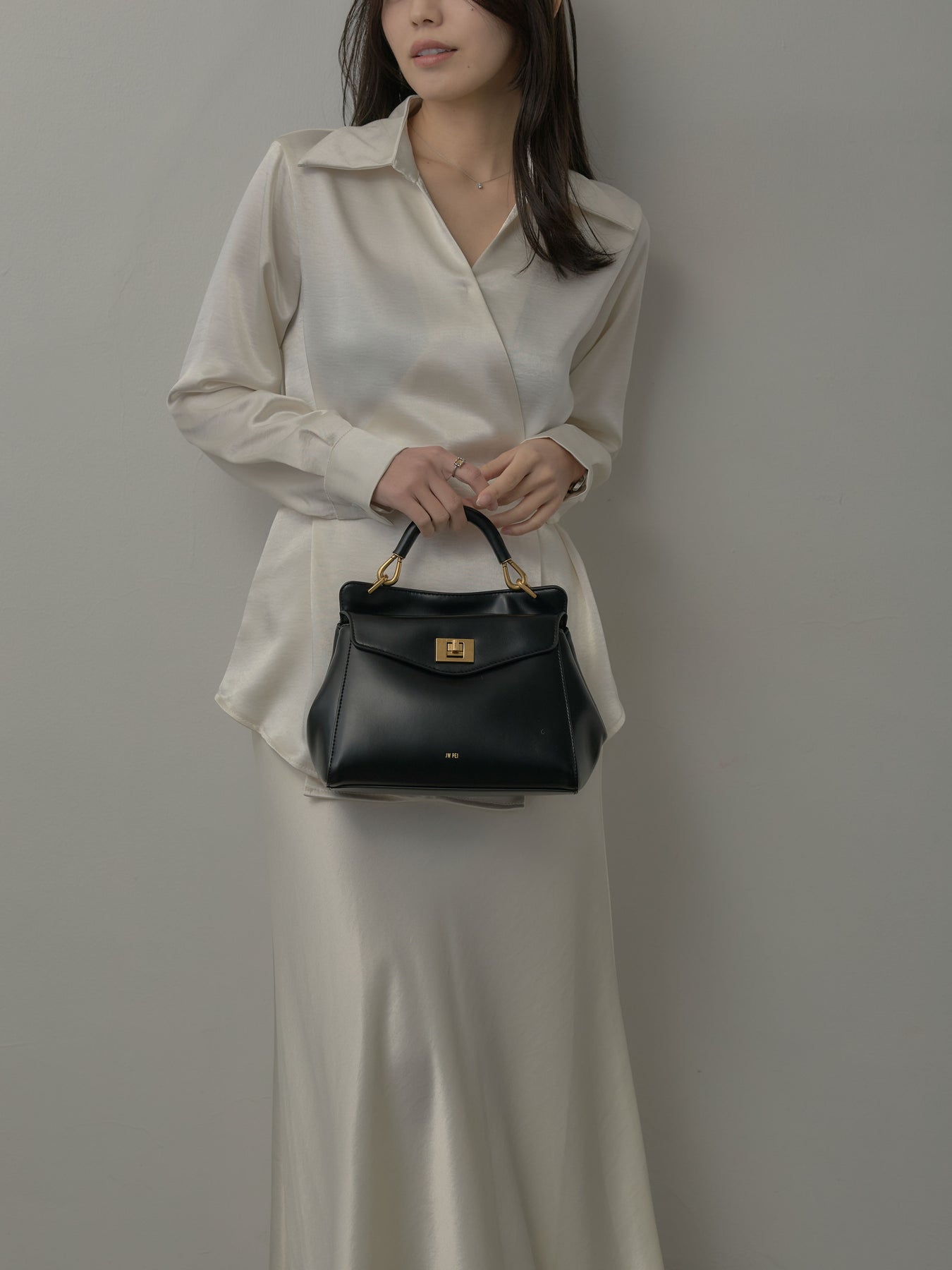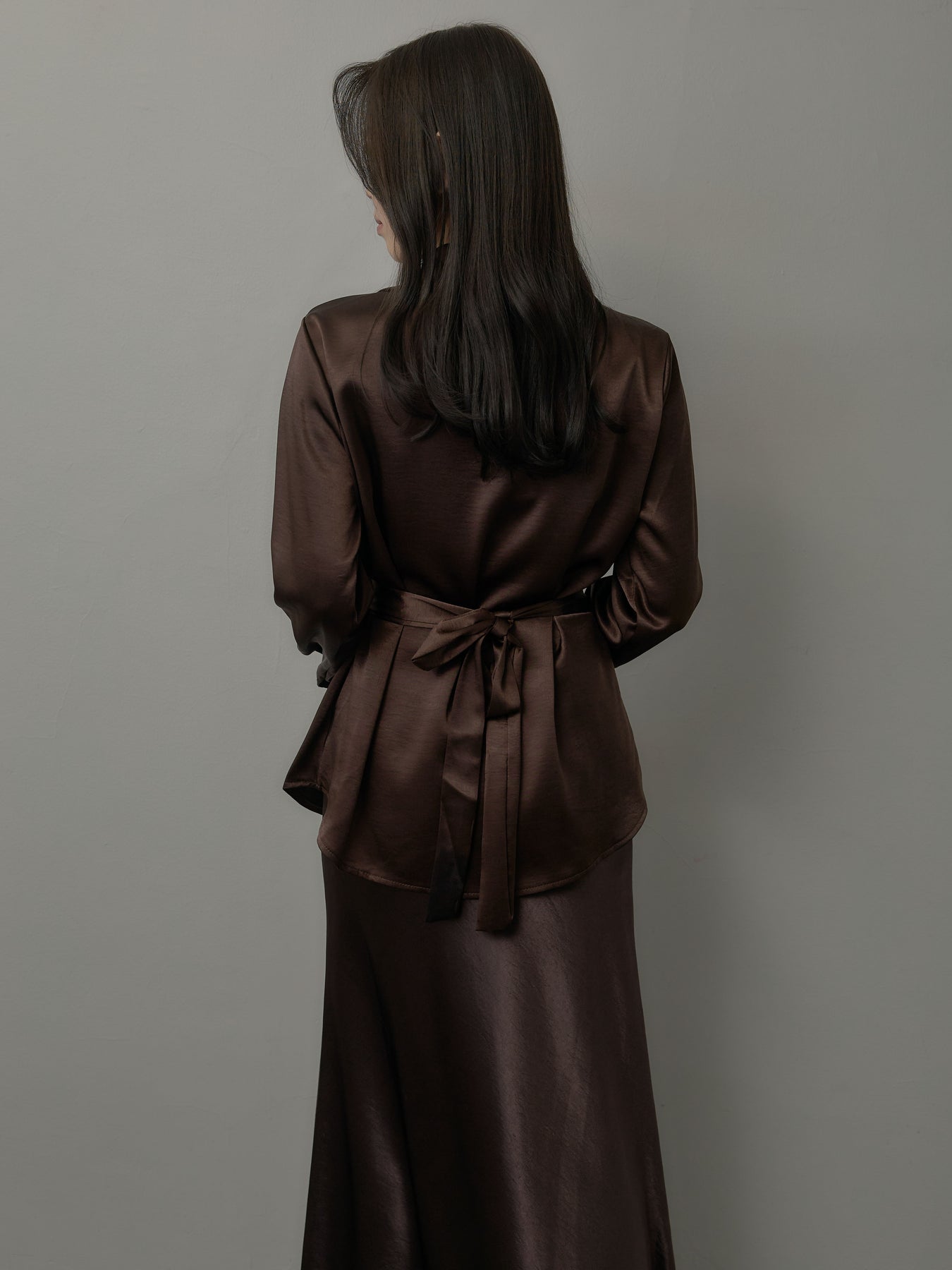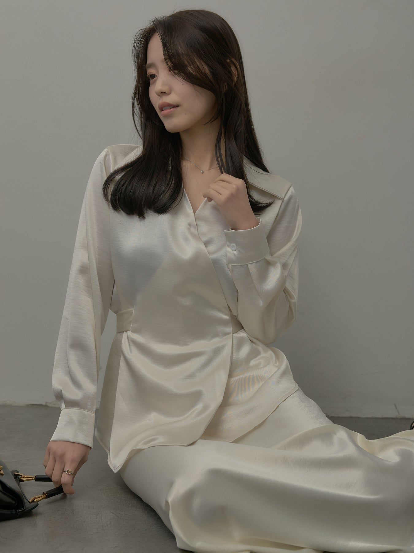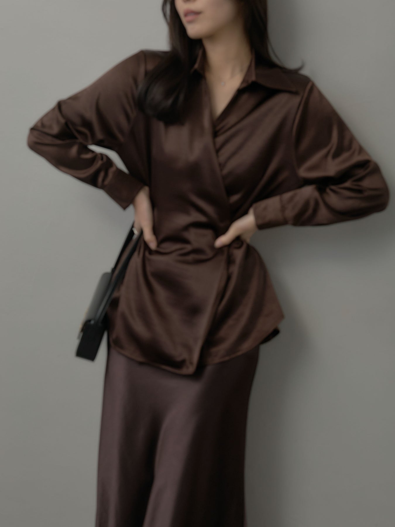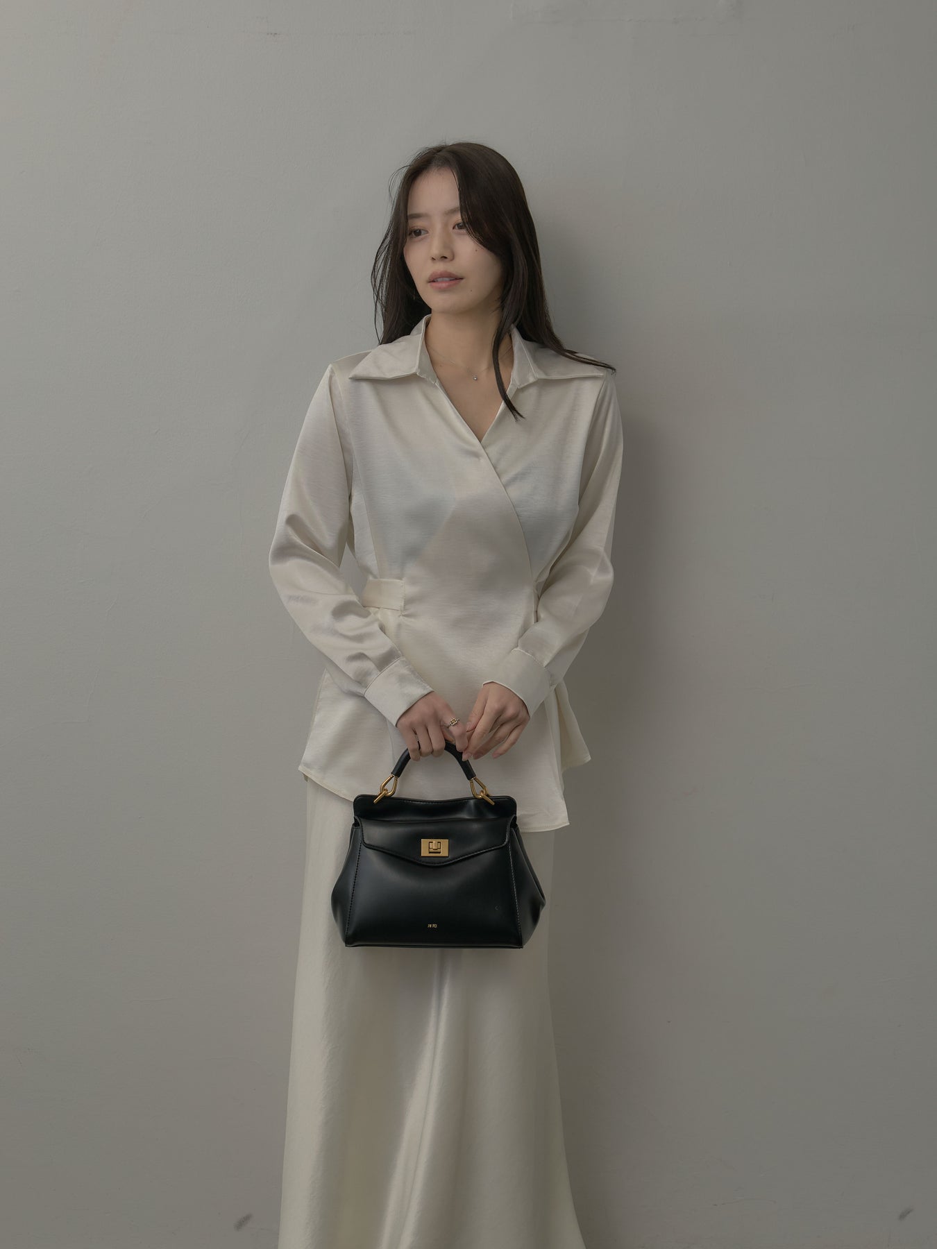 【SET】ウエストベルトサテンVネックシャツ+ナローAラインサテンスカート(2set)