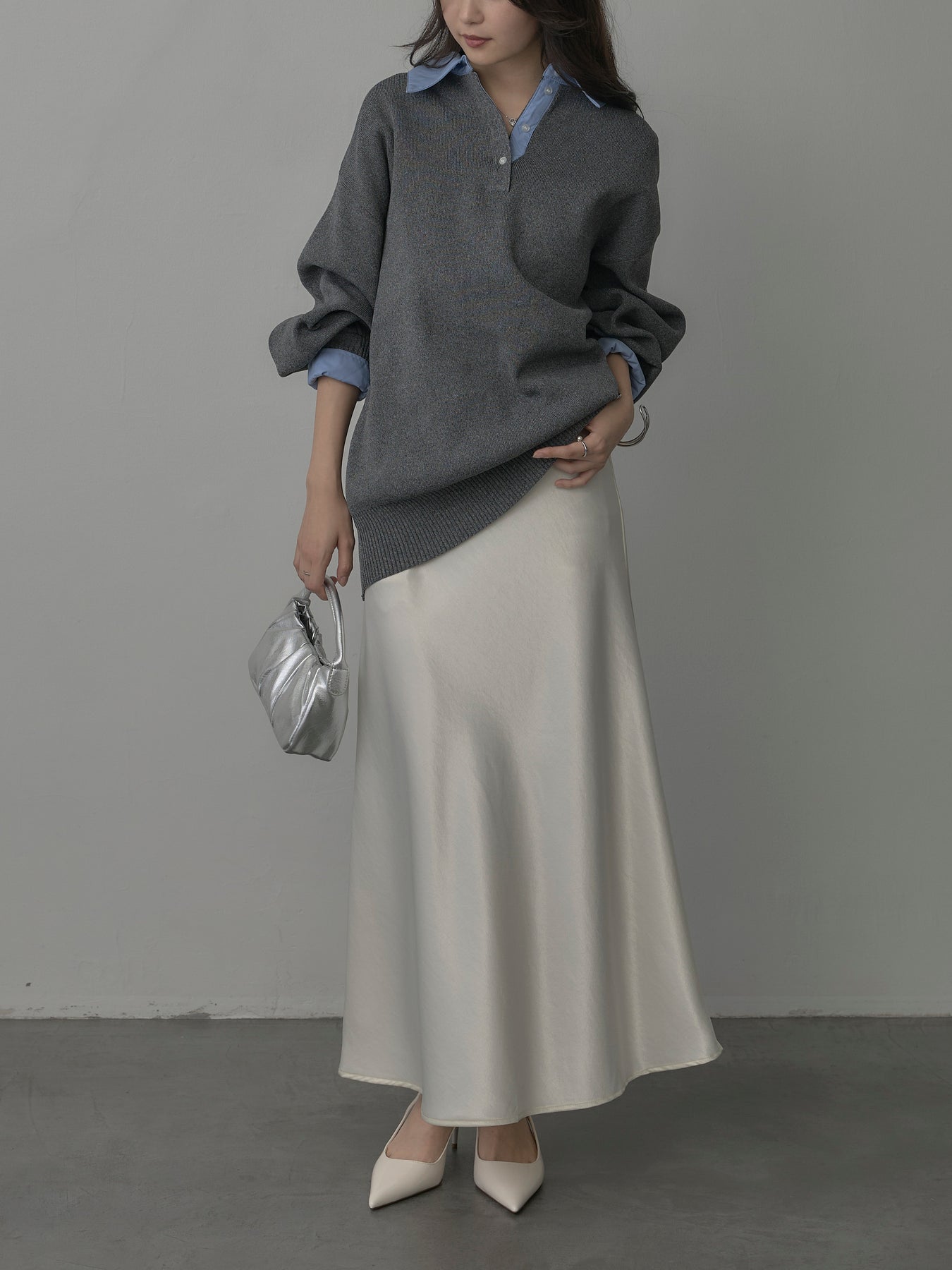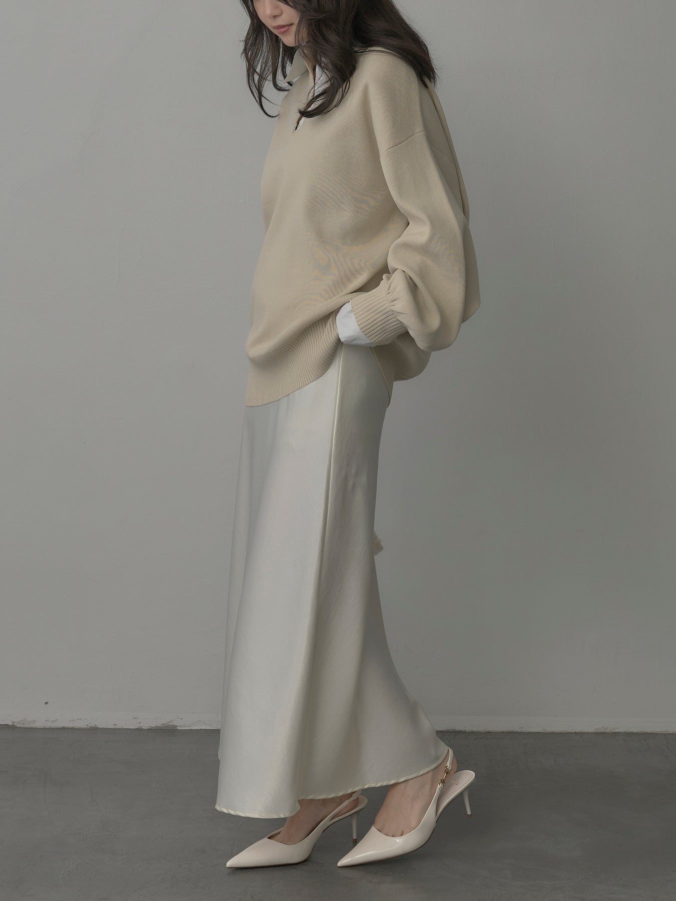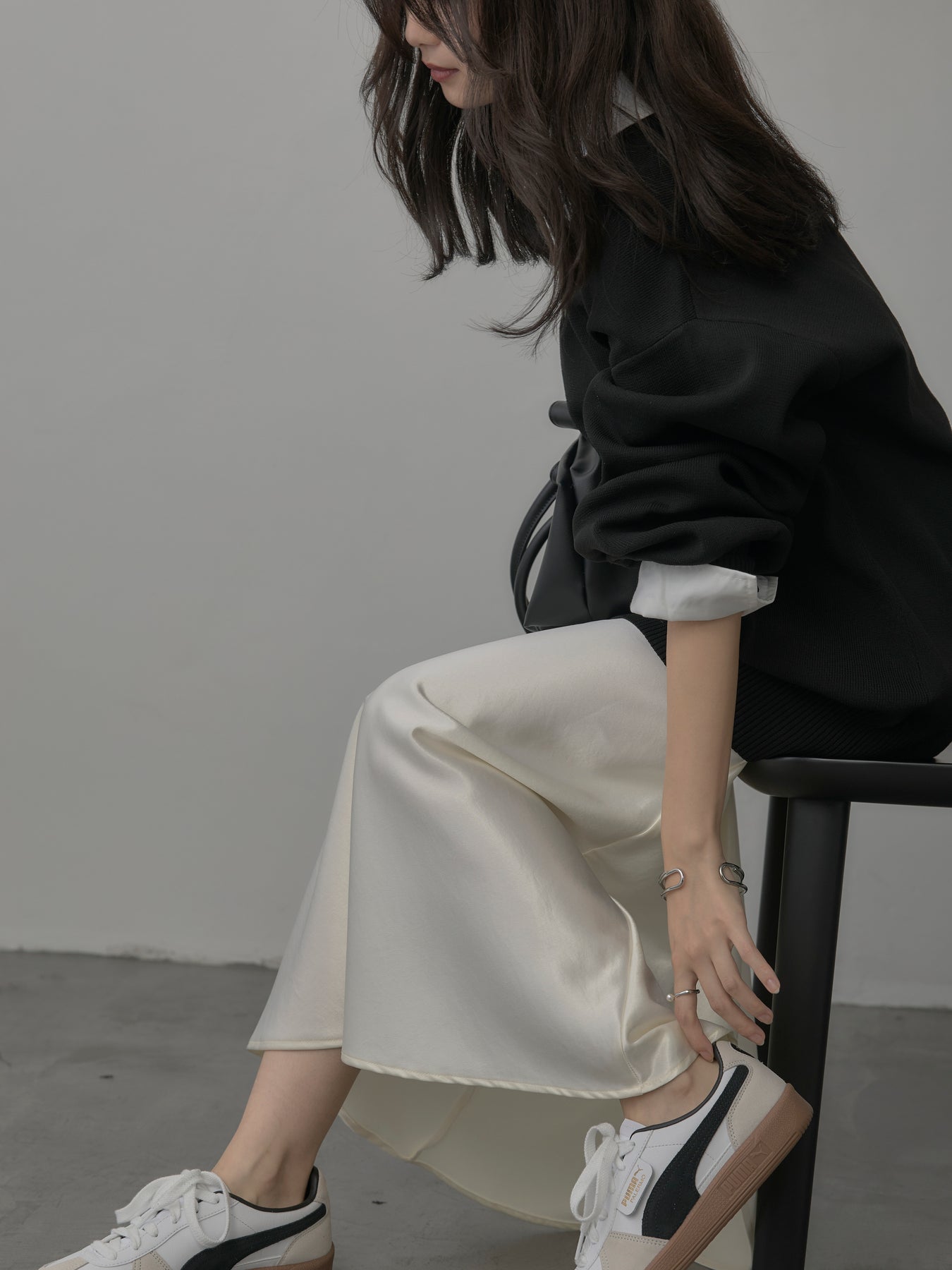 美しい光沢感のあるサテン素材を使用したナローAラインスカート。落ち感のあるシルエットが女性らしさを引き立て、幅広いトップスと好相性です。
