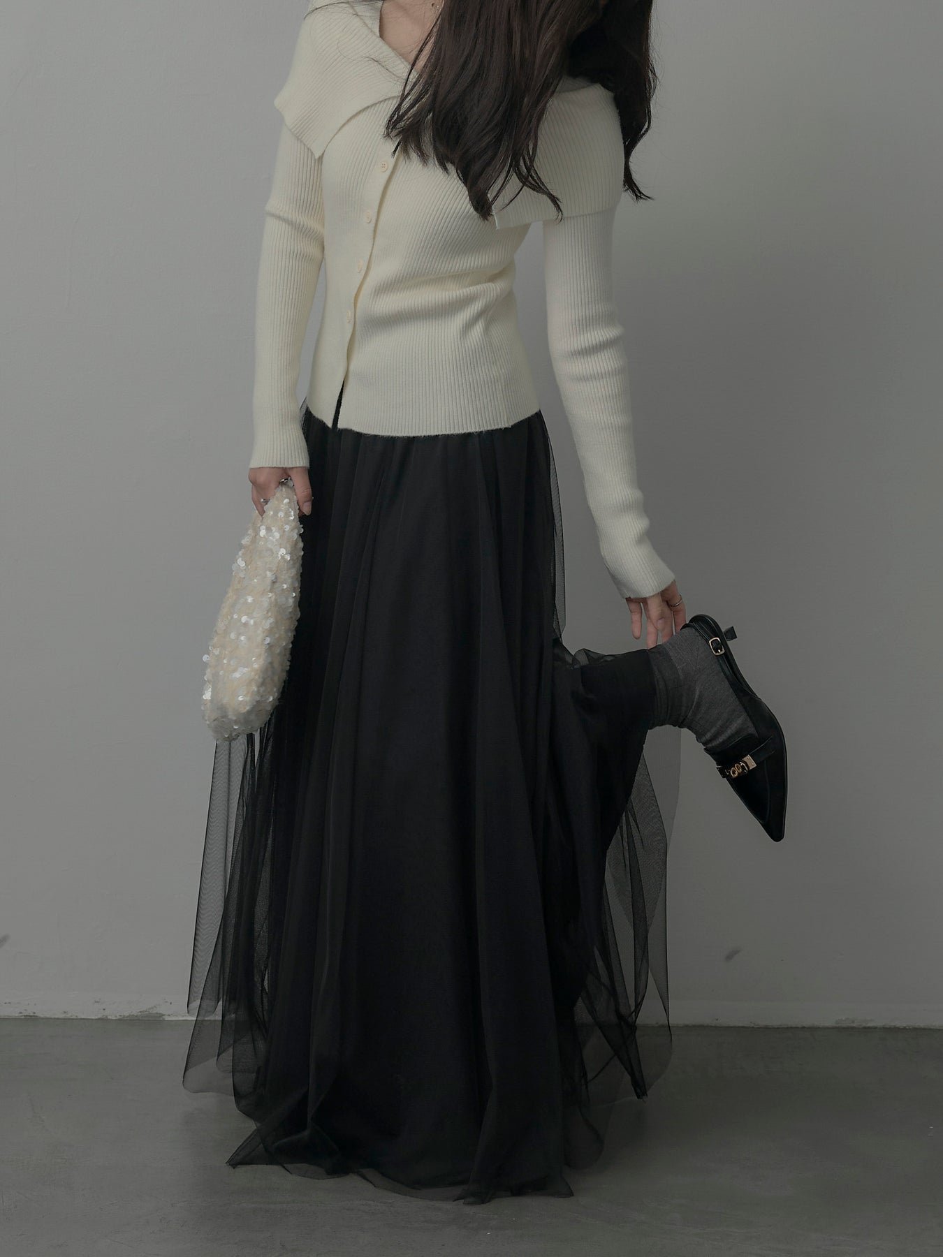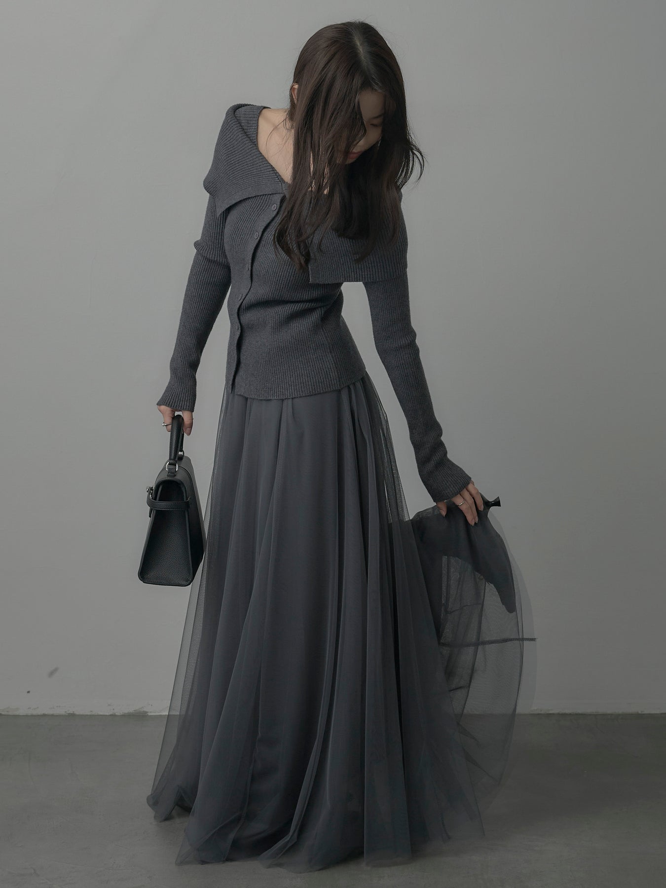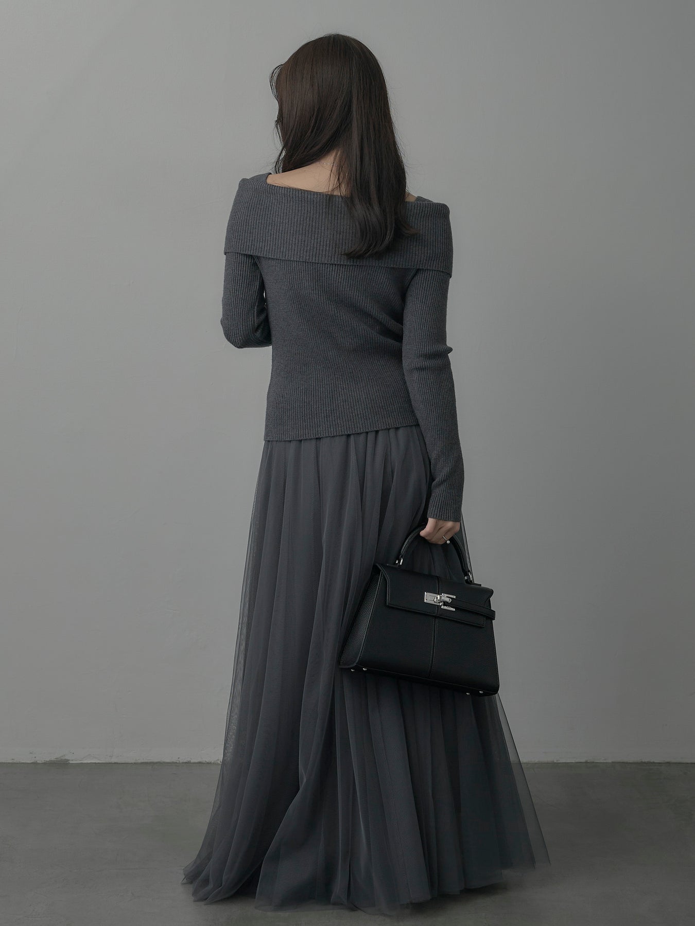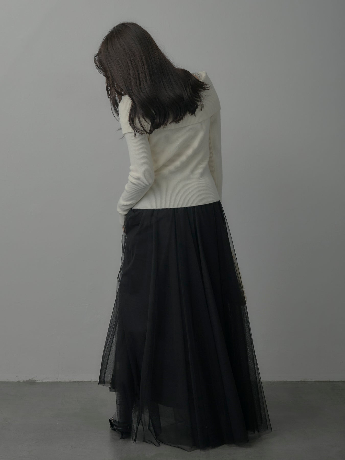 【SET】オフショルライクリブニットトップス+ボリュームチュールスカート(2set)
