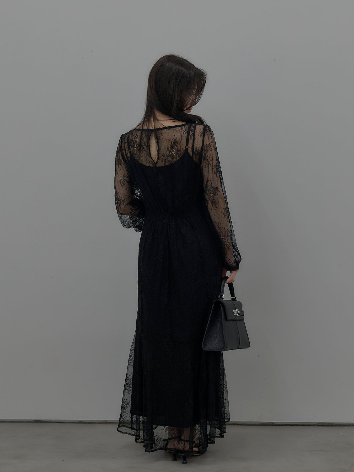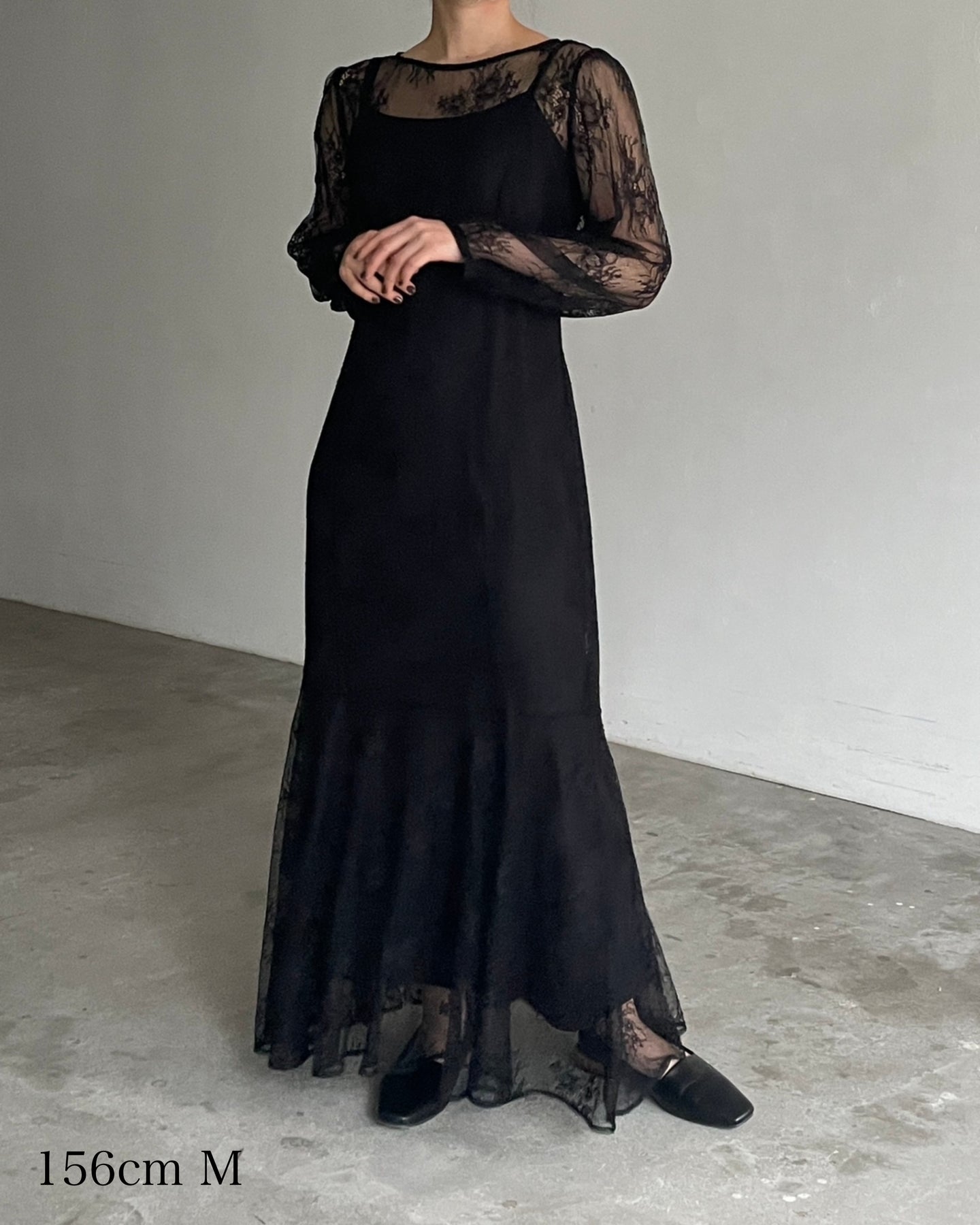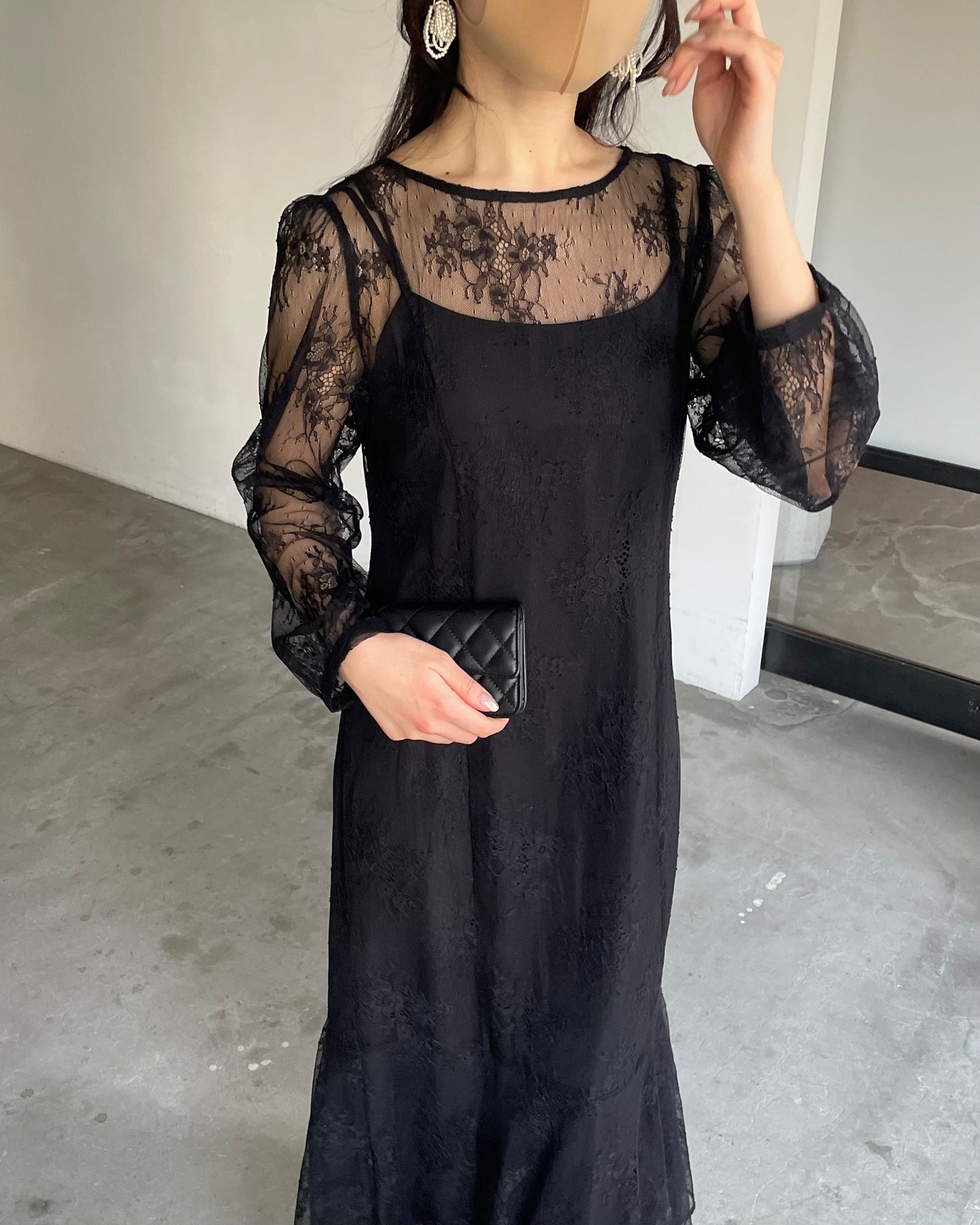 レースをたっぷりと使用したワンピースと、カップ付きのインナーワンピがレイヤードされたドレス。