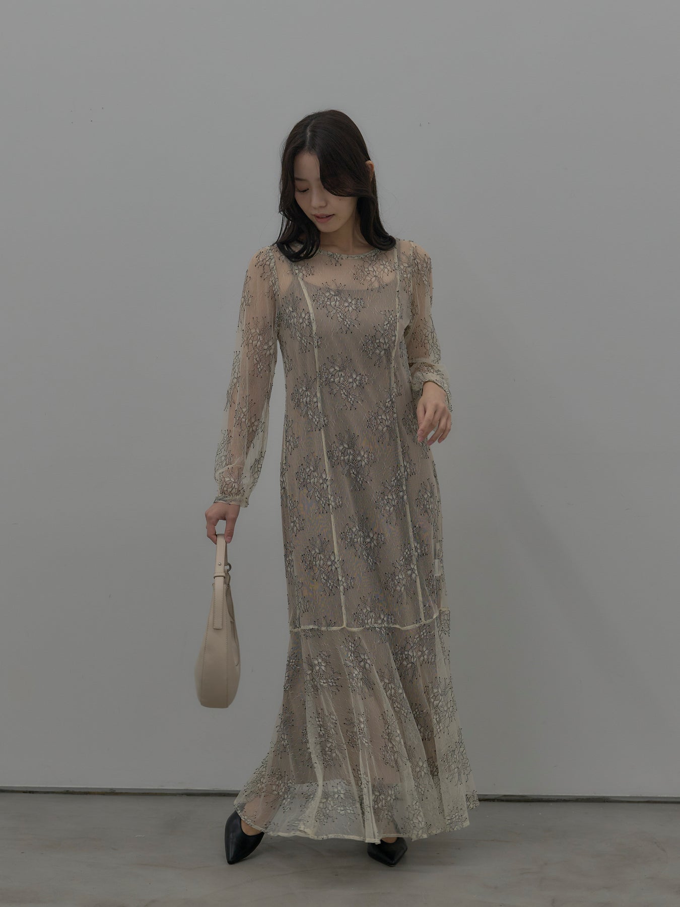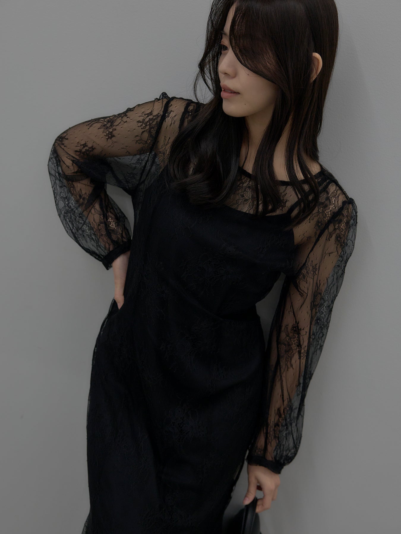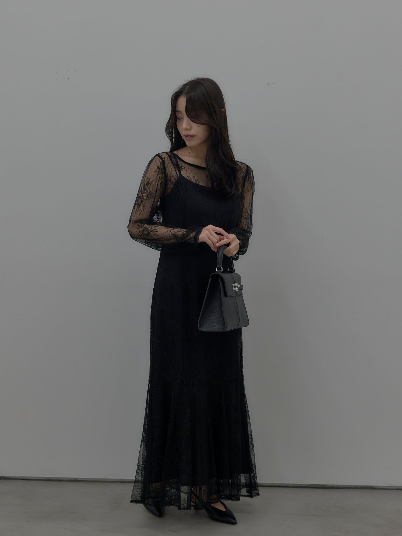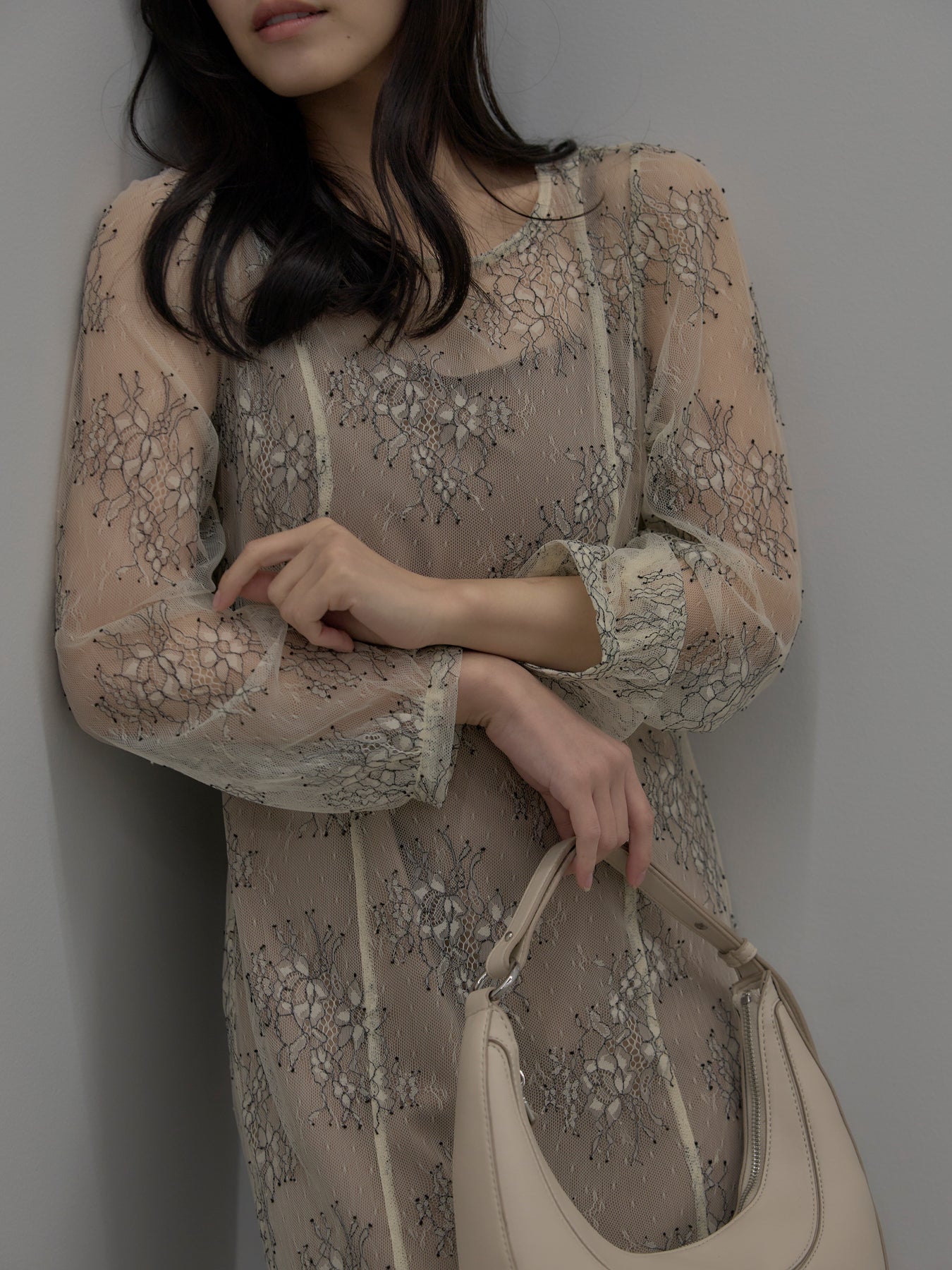 レースをたっぷりと使用したワンピースと、カップ付きのインナーワンピがレイヤードされたドレス。