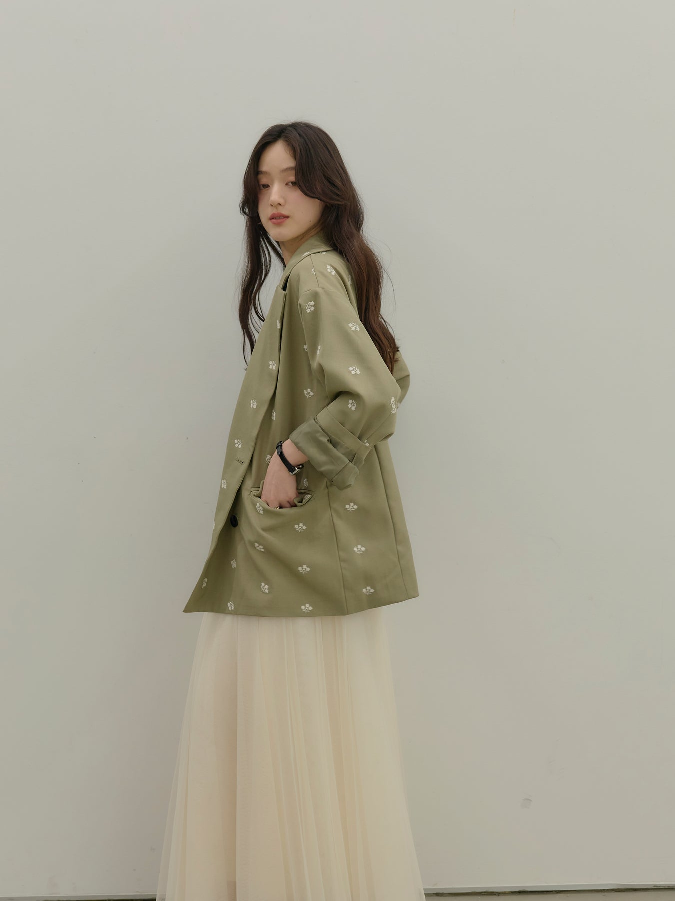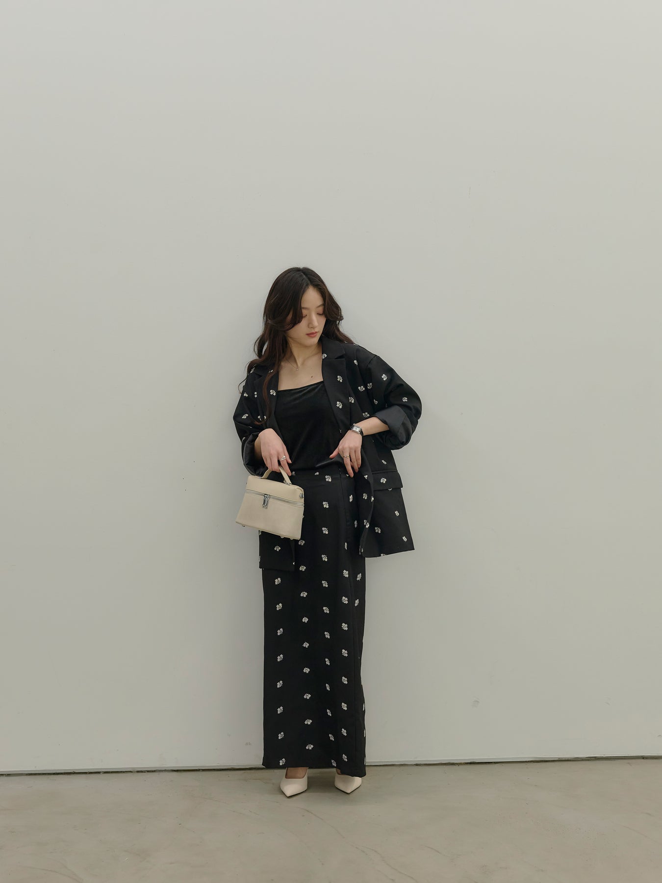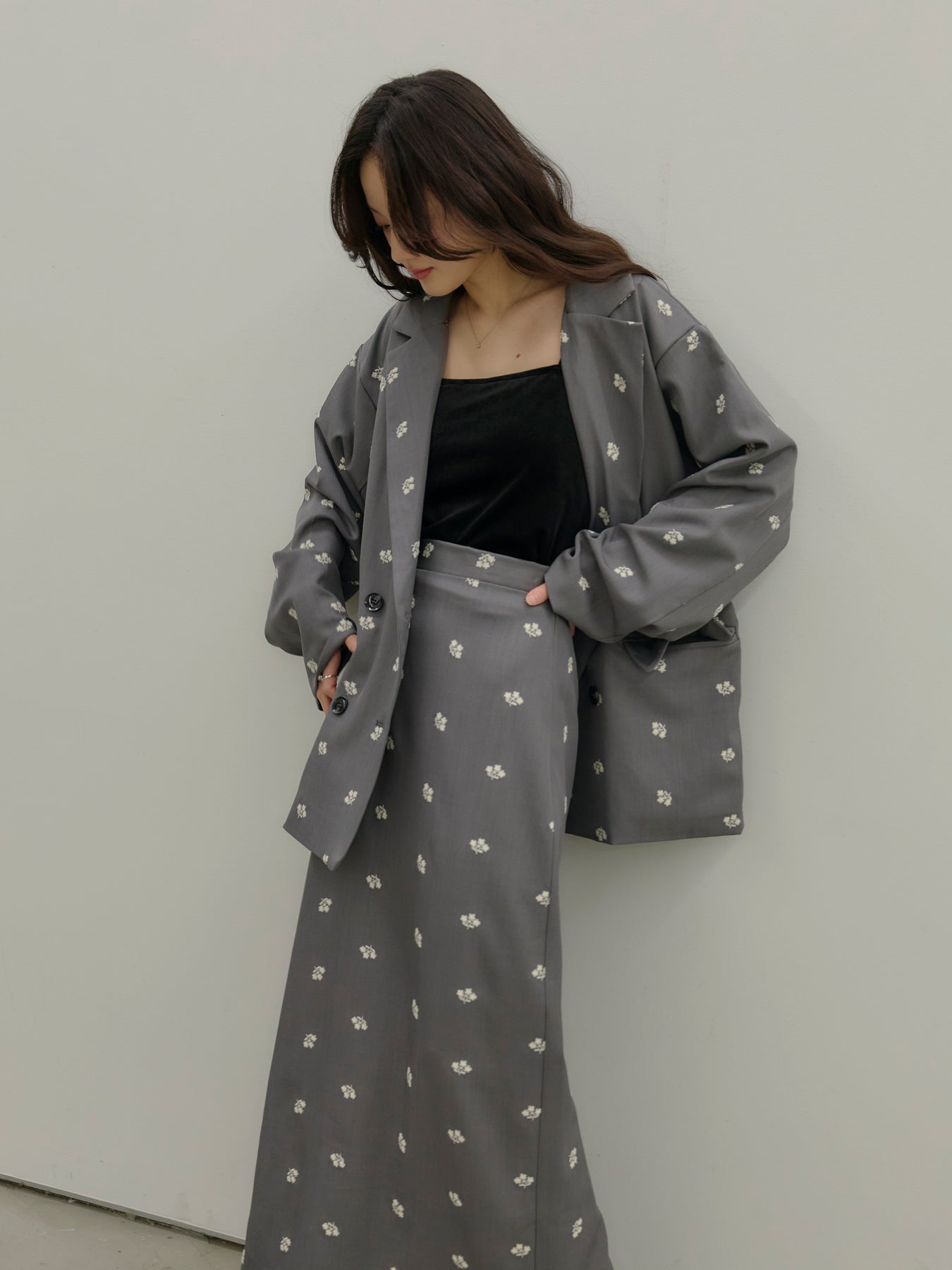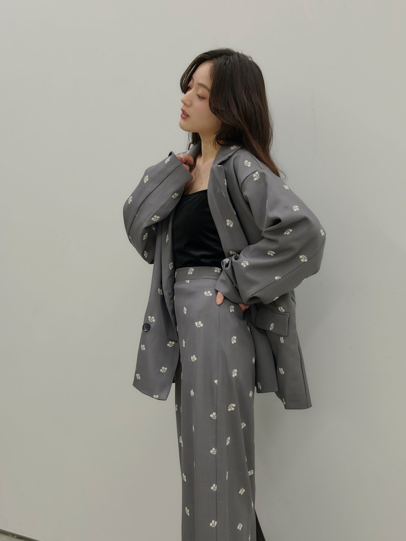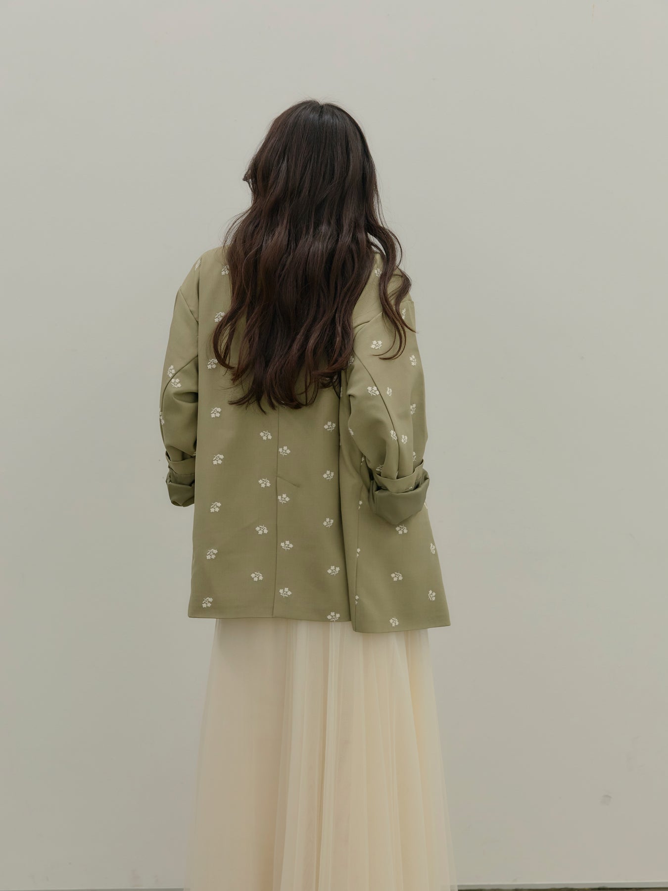 フラワー刺繍が施されたテーラードジャケット。今の気分にぴったりなやや大きめなつくりなのでスタイリングに抜け感を生んでくれます。白で統一された刺繍でさりげないガーリーなアクセントになってくれます。一着で華やかなのでボトムはシンプルな組み合わせを楽しんでいただけます。裏地付き。
